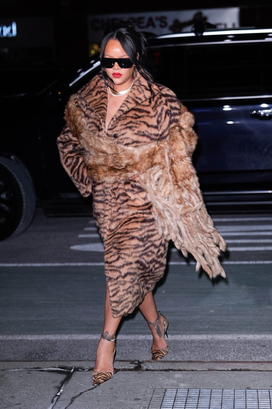 Op maandag keerde de aaibare sjaal terug, ditmaal gecombineerd met een jas met nog meer knuffelgehalte. De oversized faux fur jas van Alaïa met tijgerstrepen domineerde de look, afgemaakt met bijpassende Alaïa-pumps en haar kenmerkende rode lippenstift. In plaats van de sjaal warm om haar hals te slaan, knoopte ze hem losjes om haar bovenlichaam – een slimme mix van nepbont met nepbont die gauw als too much kan aanvoelen, maar Rihanna de look naar een luxer niveau tilt zoals alleen zij dat kan.