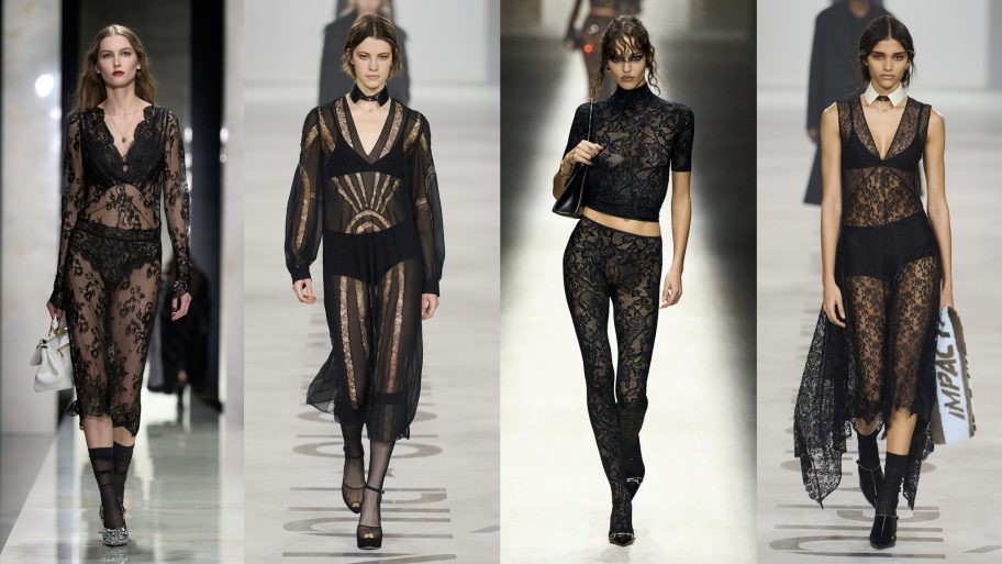 Tegen de tijd dat Milan Fashion Week plaatsvond, was enige bescheidenheid rondom kant er allang uit geëvolueerd. Vooral bij Dolce&Gabbana speelde kant de hoofdrol: de hele collectie schreeuwde boudoir dressing. Ook Maria Grazia Chiuri koos voor haar debuut (én terugkeer) bij Fendi meermaals voor de stof.