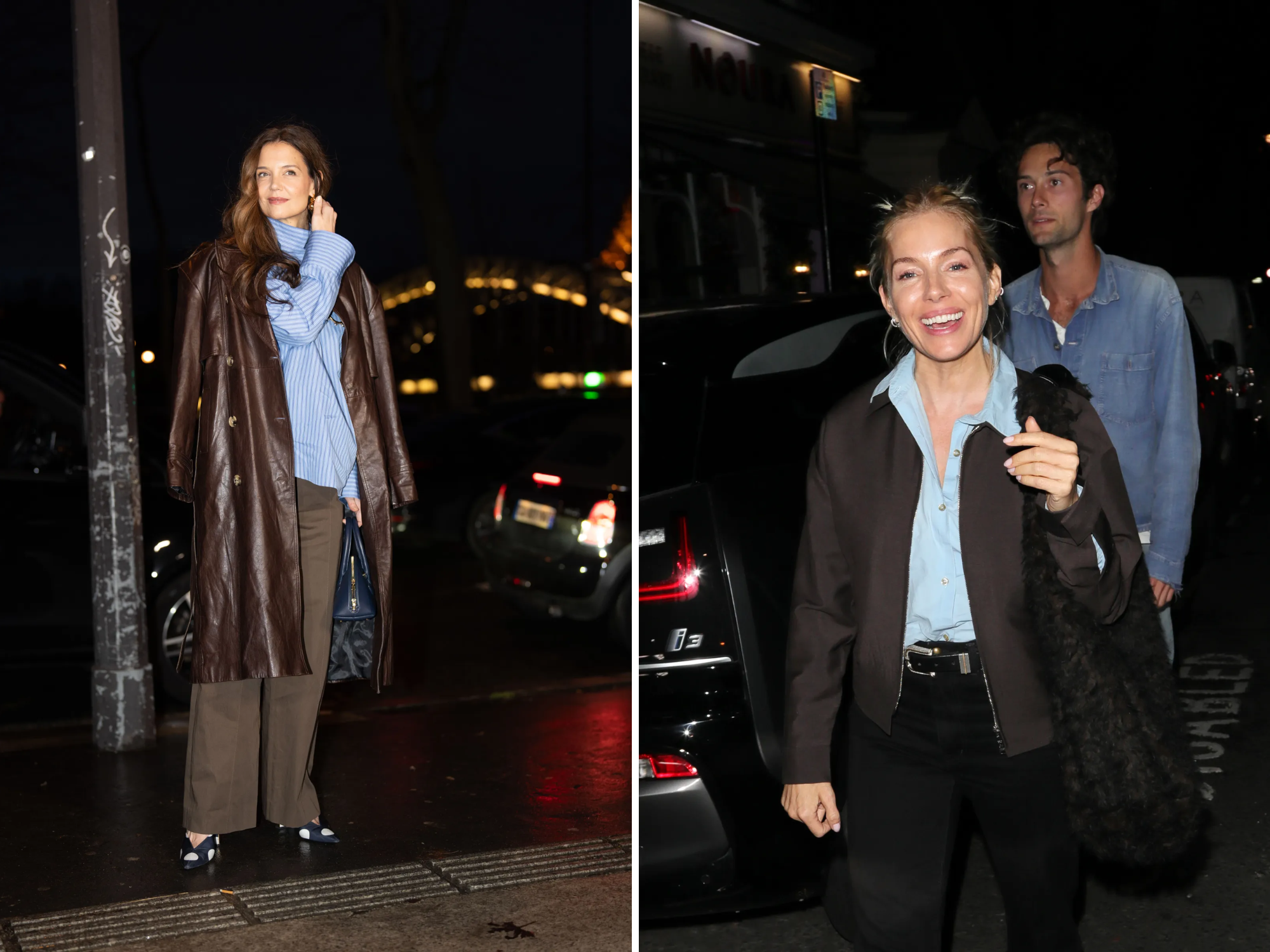 Bij Chloé waren er blauwe jeans en een oversized cacaokleurige jas, bij Prada een blauw shirt in combinatie met een mahoniekleurige nepbontjas, en bij Stella McCartney een blauw shirt dat onder een vinyl trenchcoat vandaan kwam en eruitzag alsof het van gesmolten chocolade was gemaakt.