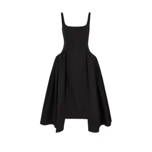 Met zijn verlaagde taille, plooien op de heupen, op een korset geïnspireerde buste en onopgesmukte stof is dit een jurk met een bijzonder silhouet: een soort minimalistische A-lijn meets girly melkmeisje-stijl. 16Arlington liep voorop met een opvallende katoenen jurk met drop taille, die werd geshowd op de catwalk tijdens de lente/zomer 2024-show. Een stuk dat sindsdien niet één, maar twee keer is gedragen door Alexa Chung, in twee verschillende uitvoeringen.
