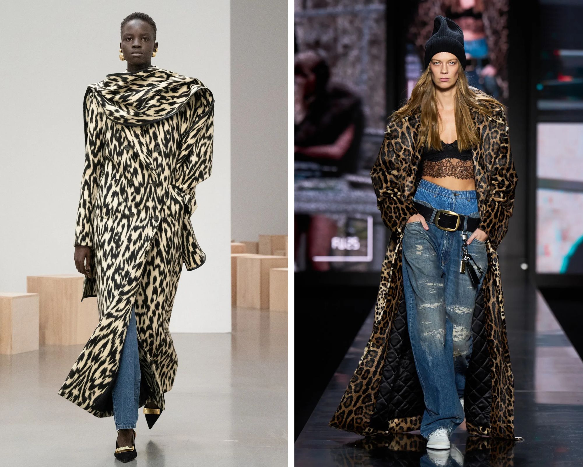 Op de catwalks van het herfst/winter 2025-seizoen werd de luipaardjas gedragen met jeans in uiteenlopende silhouetten. Aan de ene kant ging het richting een eenvoudige en elegante esthetiek, zoals bij Brandon Maxwell. Aan de andere kant werd het bij Dolce & Gabbana bijna een urban statement. De brede, gedragen jeans voegen een bijna street-achtige noot toe. Dit breekt de weelderigheid van de dierenprint en maakt het geheel direct moderner en draagbaarder.