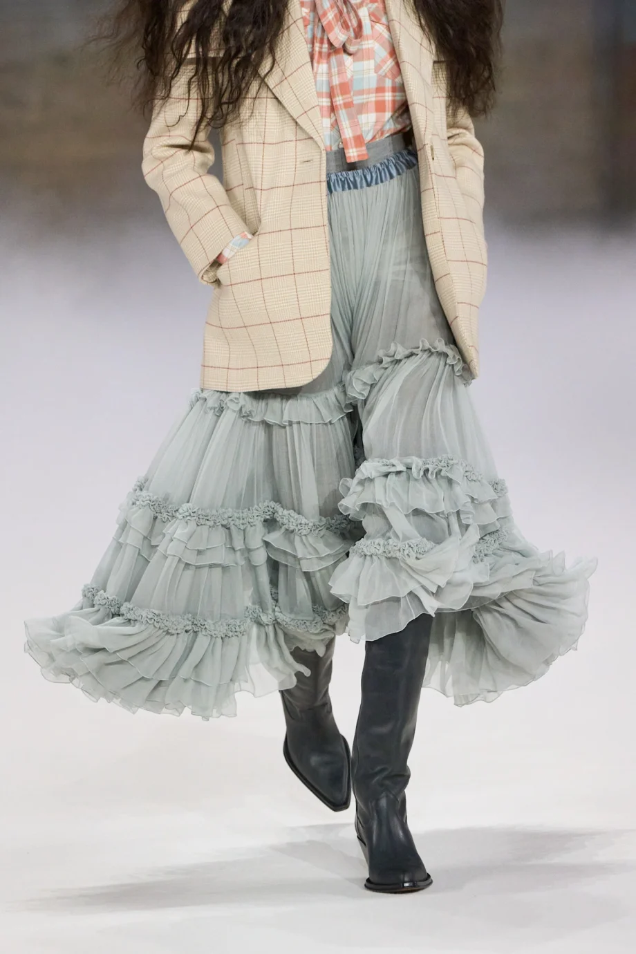 Hoewel het de herfst/winter 2026-collectie betrof (die echter wel een ultiem lentegevoel opriep), koos Dior voor een variant waarin de benen alle ruimte krijgen: een minirok met geschulpte randen en een sleep die zacht meedeinde in de wind, afgemaakt met een paar pumps met polkadots. En ook bij Chloé was de rok met ruches weer een vaste waarde op de runway – zowel tijdens lente/zomer 2026- als de herfst/winter 2026-show.