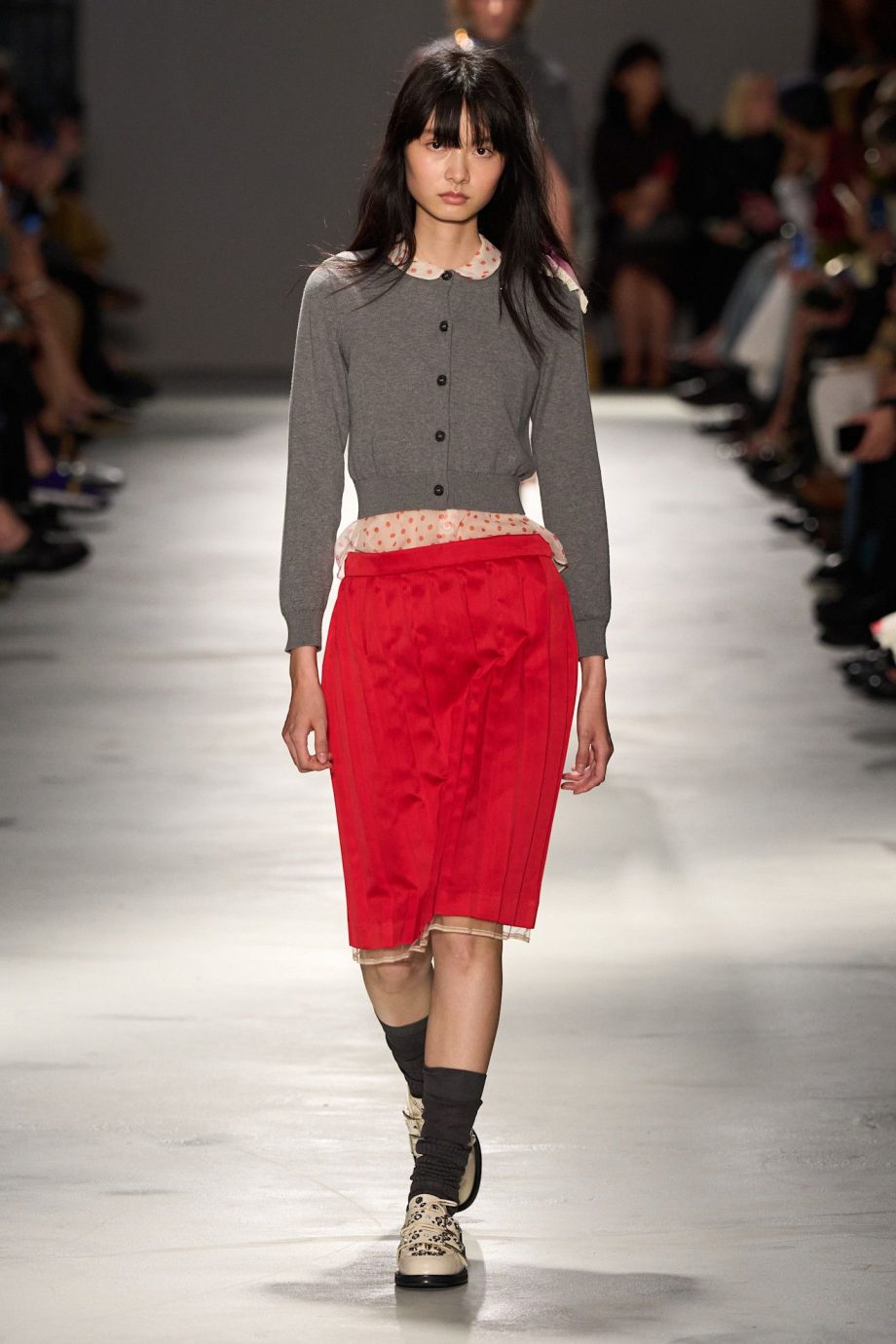 Fendi combineerde een antracietgrijs poloshirt met optisch witte details en een bijna mannelijke snit met een supervrouwelijke, rode kokerrok van geperforeerd leer. Het contrast komt zowel in de silhouetten als in de kleuren tot uiting.