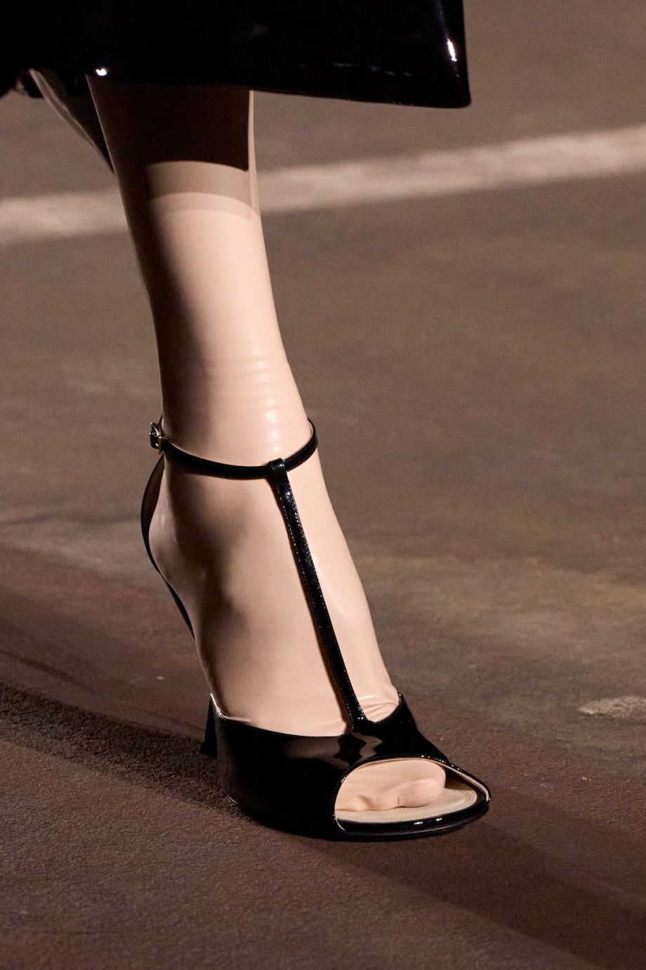Zo vertaalt Mugler in zijn lente/zomer 2026-collectie de stijl naar twee modellen: een zwart, lakleren model en een beige, satijnen ontwerp. Alexander McQueen kiest voor Salomé-sandalen die subtiel verwijzen naar de Rosary-sandalen van het huis, die McQueen in het voorjaar van 2003 introduceerde. Waar de bandjes destijds twee tenen omsloten, biedt de herinterpretatie van Séan McGirr – uit de lente/zomer 2026-collectie – nu meer steun voor de wreef. Ook deze sandaal is verkrijgbaar in het zwart en beige.