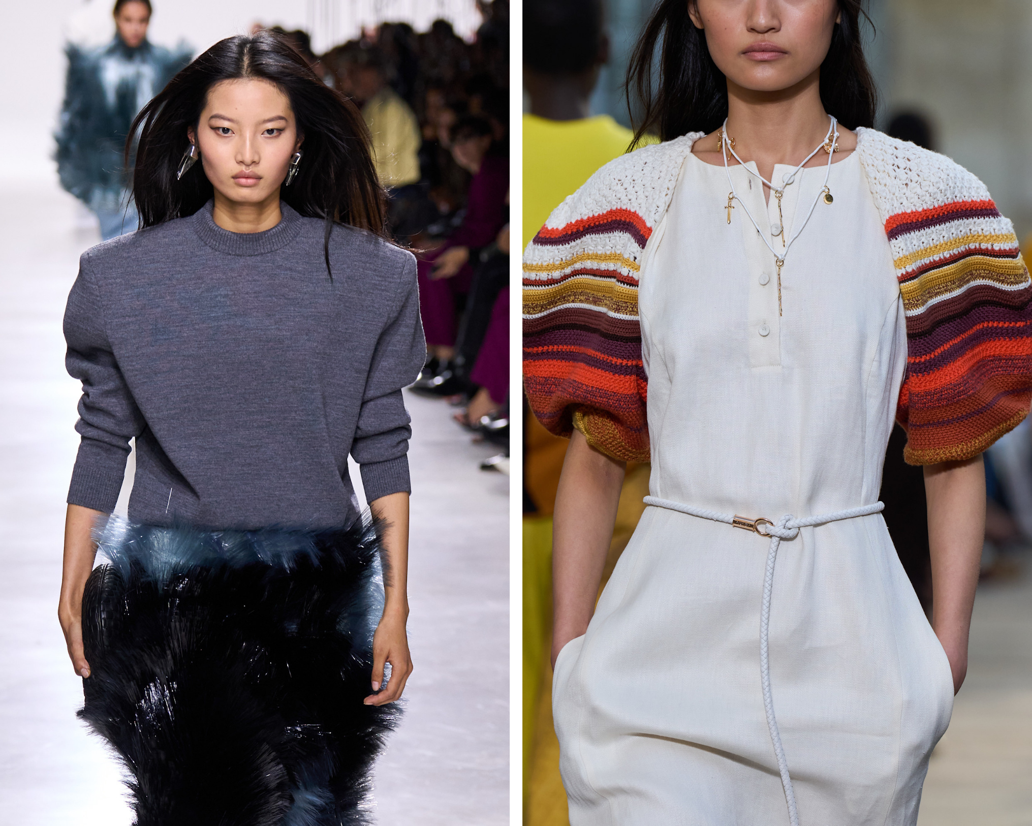 Bij Chloé zagen we niet alleen jassen met brede schouders, maar ook truien waarbij het accent duidelijk op de schouders werd gelegd. Iets subtieler waren de volumineuze, laag hangende schouders bij Torisheju: het label Torishéju Dumi met de seal of approval van sterren als Zendaya.