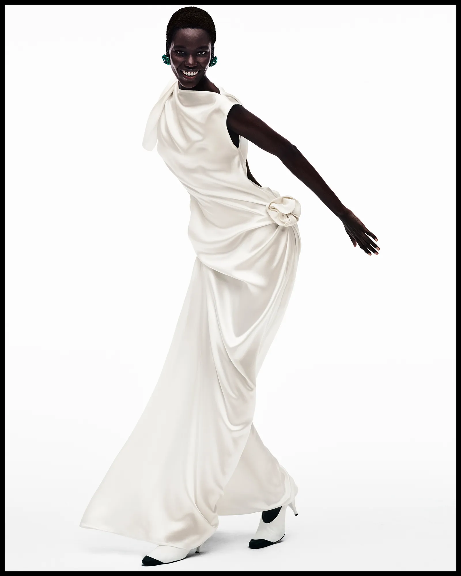 Dan komt de laatste look, de Belgische bloemen-piña-colada-jurk, gedragen door model Awar Odhiang. Lang voordat ze het podium verlaat, barst het applaus los. Tijdens de finale grijnst ze en draait ze wild rond in het midden van Blazy’s vloer met haar handen in de lucht. Nicole Kidman beschrijft de sfeer van de collectie voor mij als “ware liefde”.