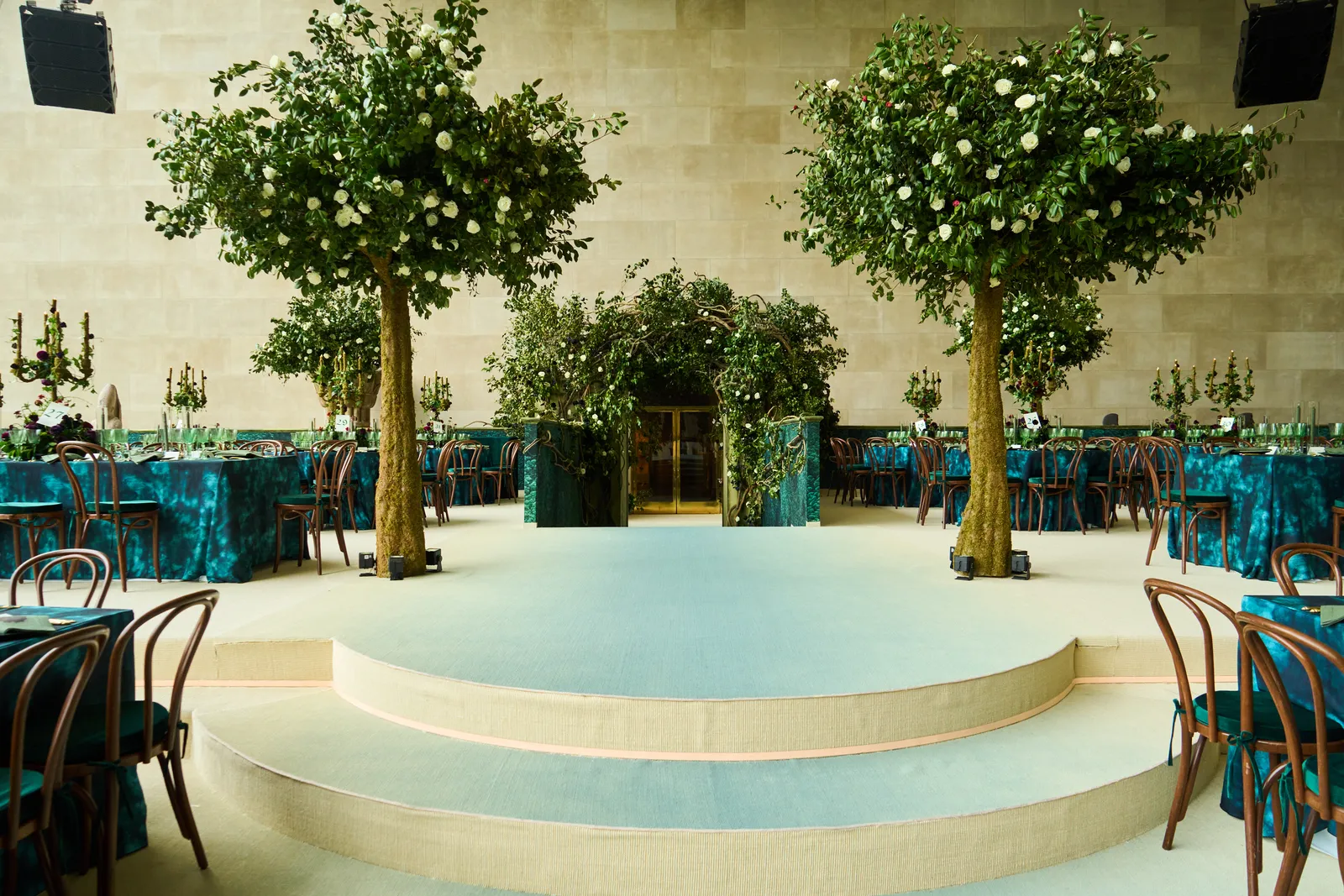 Evenementenproducent Raúl Àvila versierde de tafels met bordeauxrode, op Treacy geïnspireerde rozen die hij omschreef als “bijna zwart”. Ook op tafel? Engelse klimop, kandelaars en slaborden.