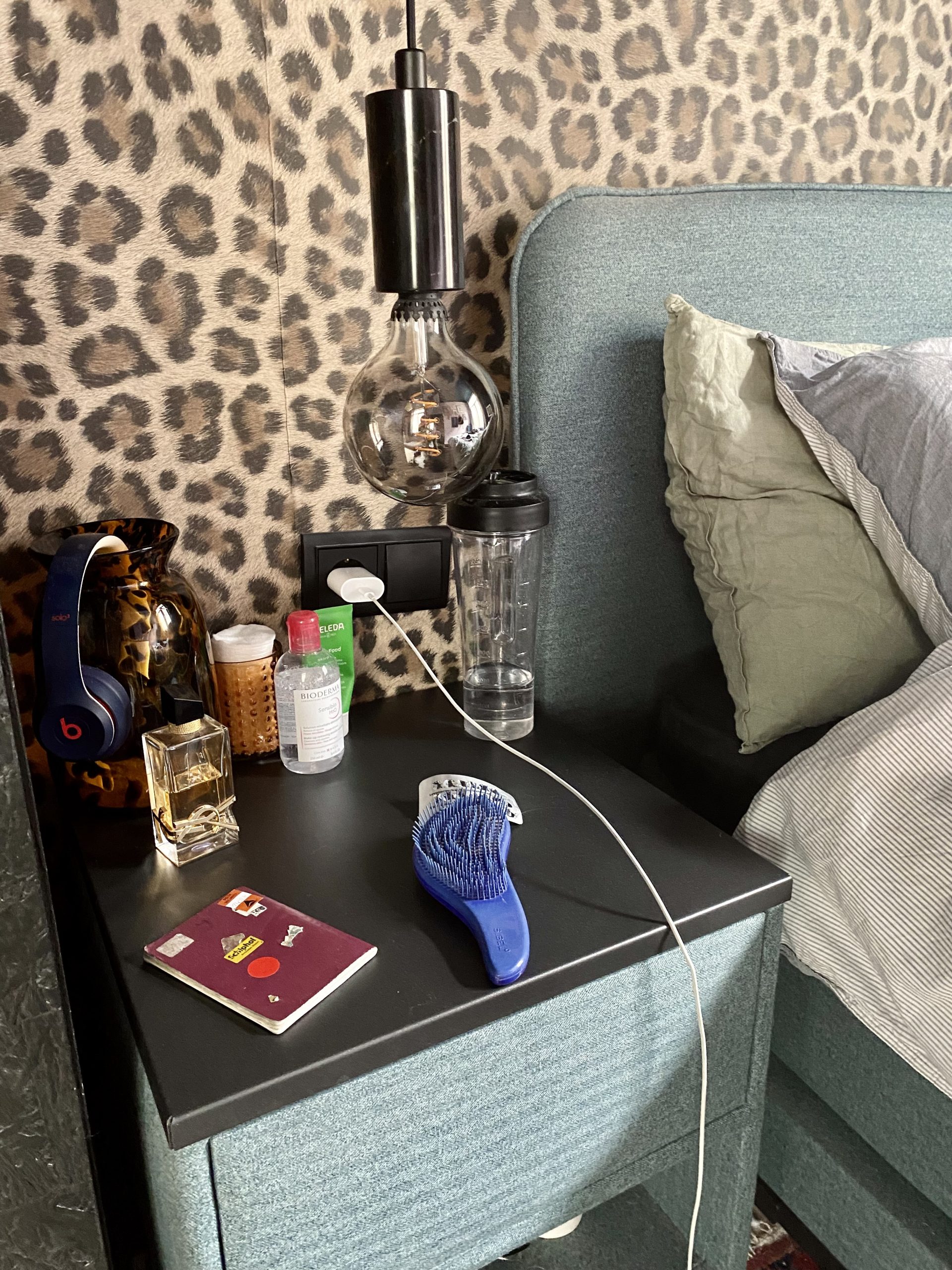 “Ons nachtkastje is in dezelfde stijl als ons bed en heeft de kleur groen-blauw. Hij is van Swiss Sense VT Wonen, dus we hebben er ook wel wat aan uitgegeven. Daar ligt standaard een gezichtsreiniger van Bioderma op met daarbij watjes. Soms maak ik mijn gezicht lekker in bed schoon. Verder heb ik een iPhone-oplader, mijn paarse Sibel haarborstel en de anticonceptiepil erop liggen. Ik hou van een rustig nachtkastje.”