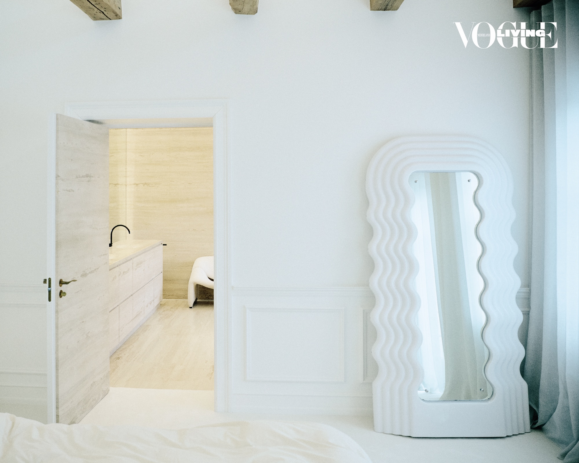 De vloer van de gastenbadkamer is geïnspireerd op een vloer die Pernille zag in Museo Jumex in Mexico-Stad. Een spannend contrast tussen tegels in verschillende stijlen. Pernille: “Ik hou van een interieur waarin het oog blijft reizen en telkens weer iets anders opmerkt. Mijn verlangen naar onverwachte details is sterk gegroeid omdat ze een huis persoonlijker maken.” Hoe komt ze aan dat geweldige oog voor design? ‘”Geen idee, het zit niet echt in de genen. Ik kom uit een academische familie, mijn moeder is tandarts, mijn vader was advocaat, maar ik heb van jongs af aan altijd veel interesse gehad in interieur. Ik hou ervan omgeven te zijn door dingen die me inspireren en door herinneringen, die zijn onderdeel van de reis die Philip en ik al gemaakt hebben. De slaapkamer daarentegen is volledig clean en wit, er is niets dat je gedachten verstoort. Het is een plek waar de geest kan relaxen, je slaapt er heel goed door.” Ook hier staat een De Sede-bank. Dit keer een witte.