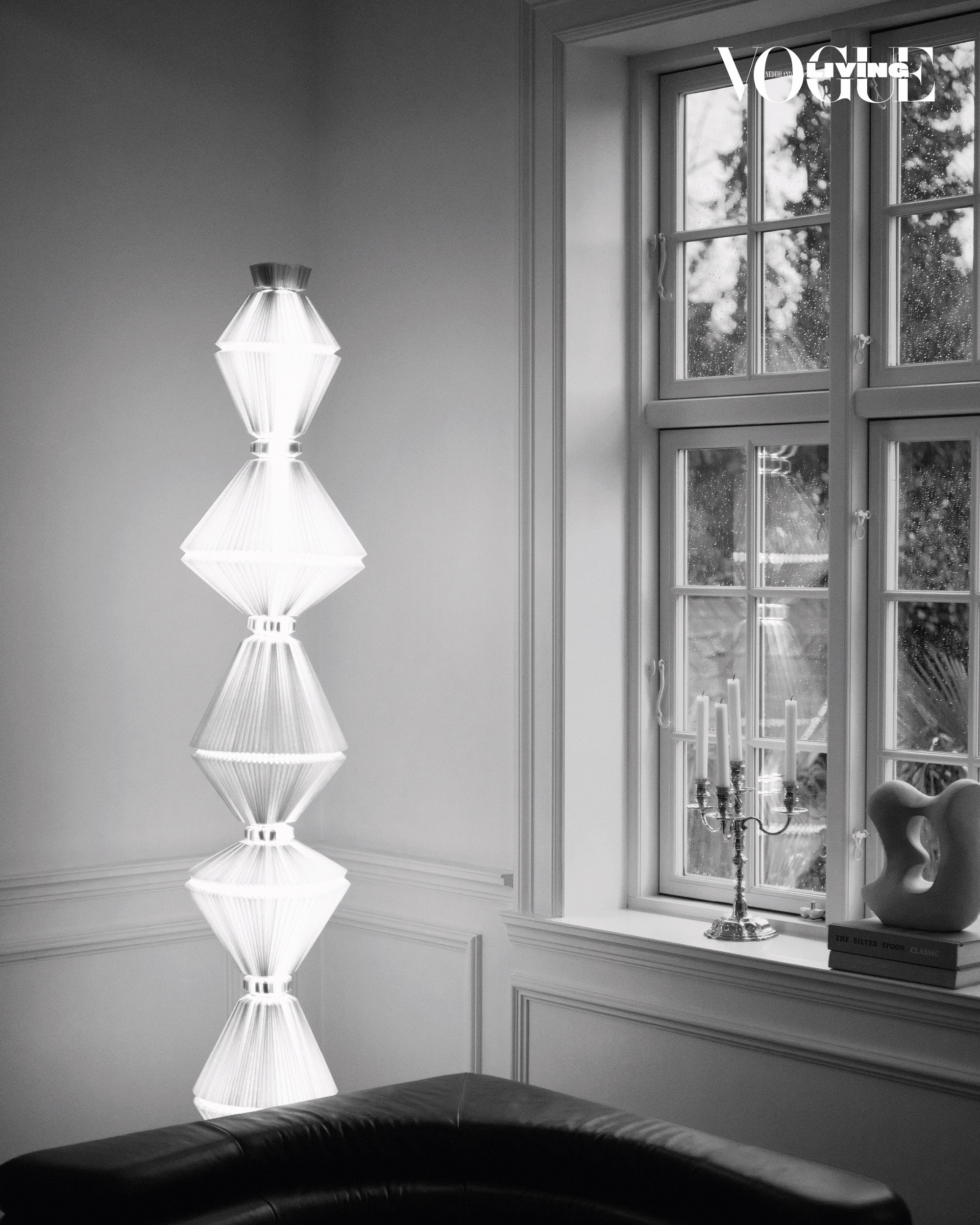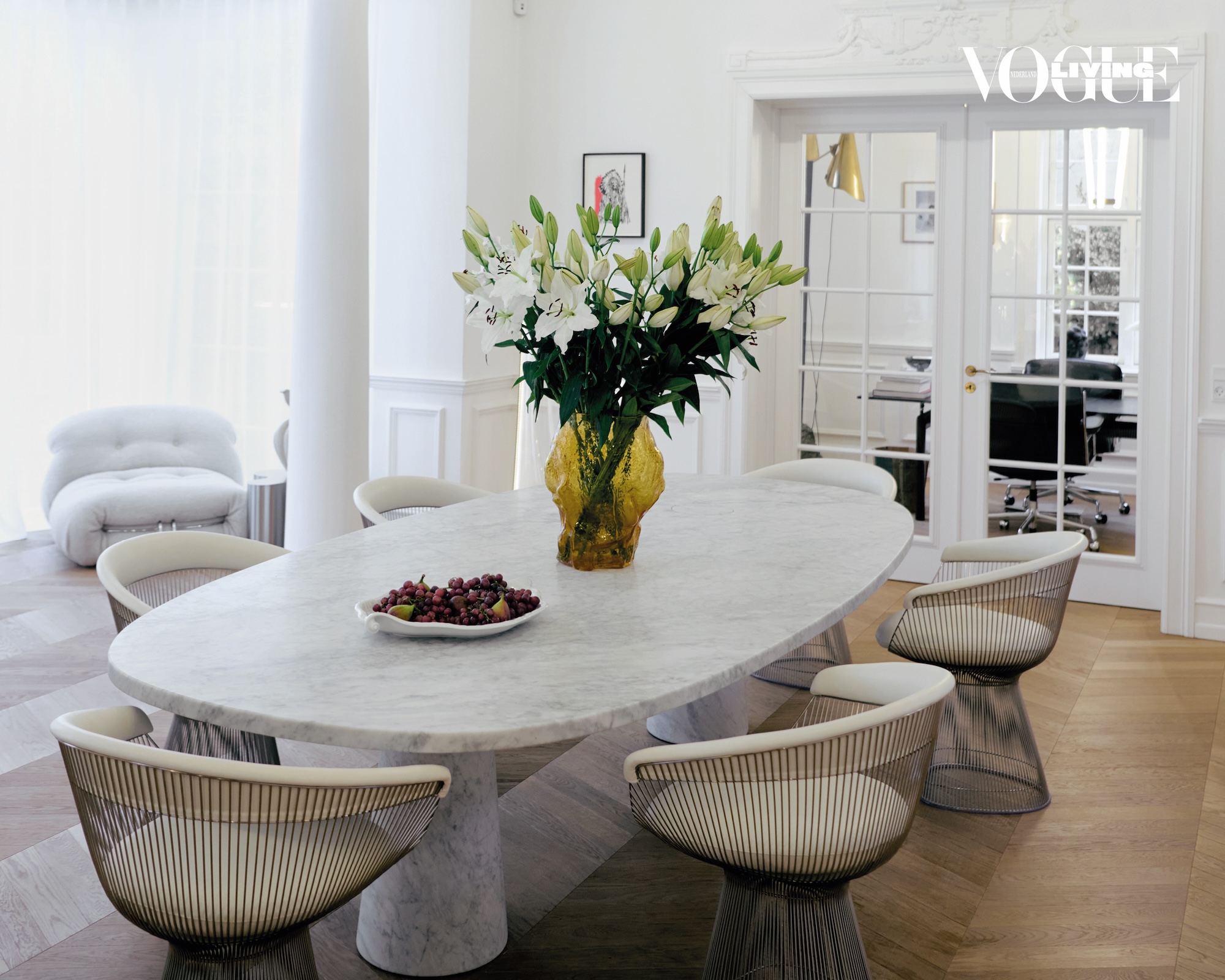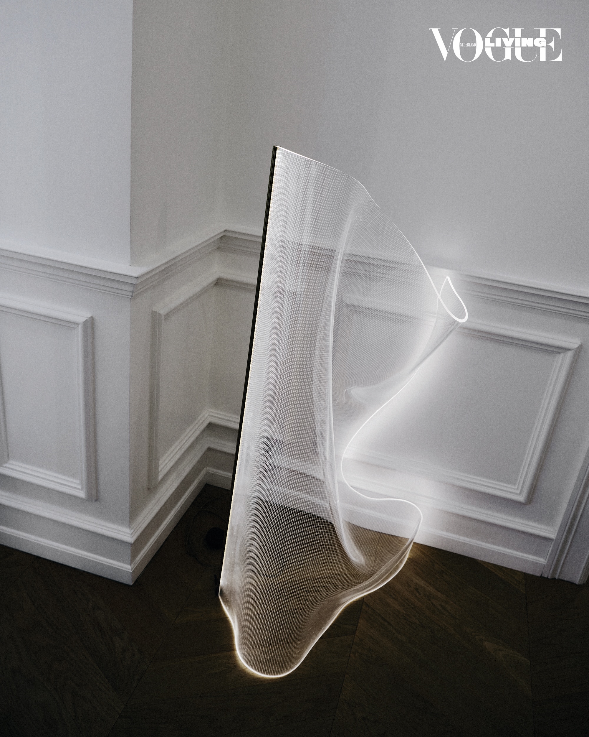 De stoffen ‘kwallenlamp’ Oïphorique van Atelier Oï ziet eruit als een levend organisme, werkt hypnotiserend en is een voorbeeld van een onverwacht designpiece waartoe ze zich aangetrokken voelt. “Ik heb hem recent van ons kantoor – ook wel The Secret Room genoemd, verscholen achter een schuifdeur – naar de woonkamer verhuisd, waar we sinds kort ook een werk van Tyrrell Winston aan de muur hebben. Hij maakt sculpturen van vintage basketballen, een groot contrast met onze minimalistische dining setting. Ook hebben we een werk van de Rotterdamse Sabine Marcelis aan de muur, in pastelkleuren.” De aan de Design Academy Eindhoven afgestudeerde Marcelis werkte onder meer voor Celine, Isabel Marant en Stella McCartney.
