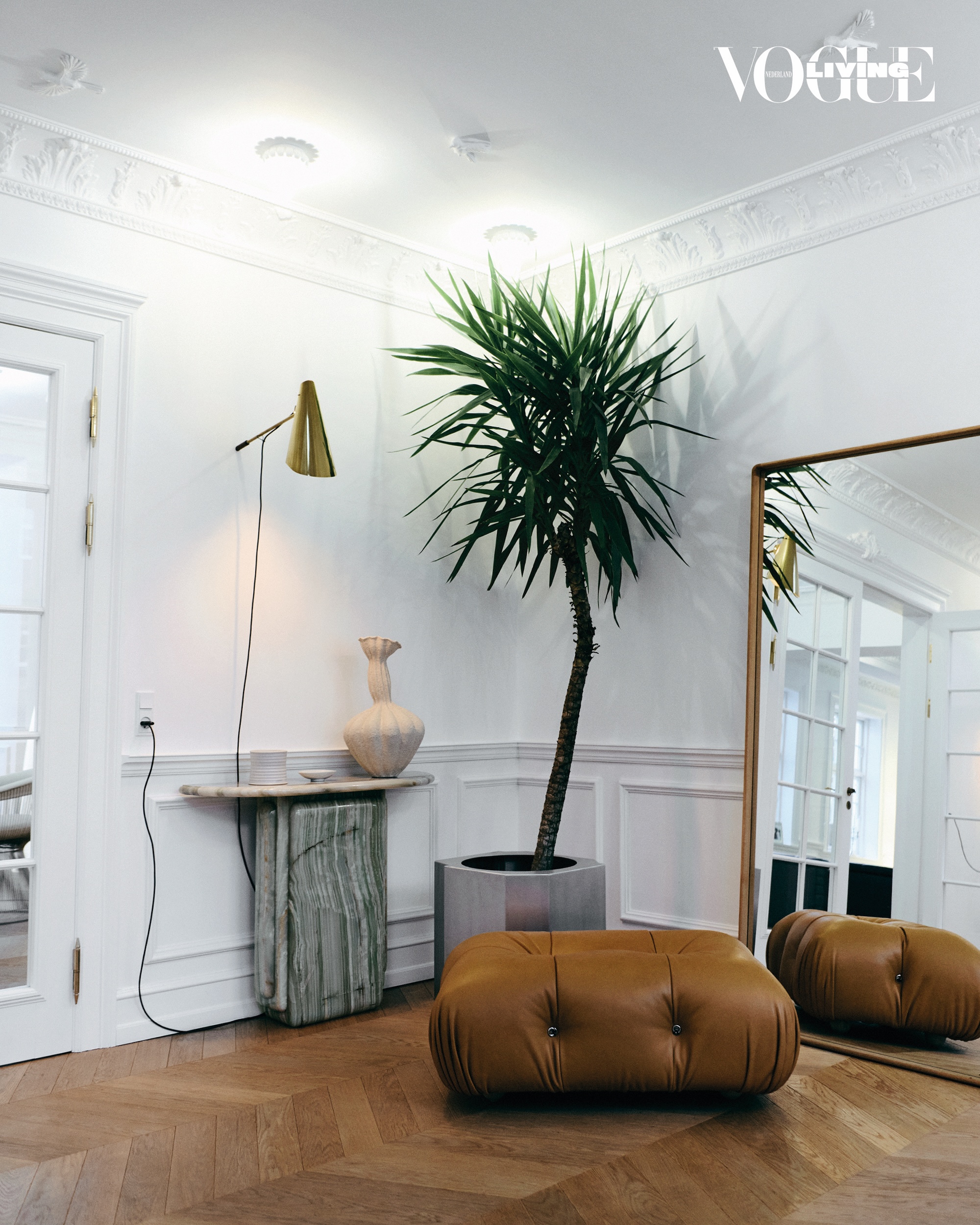 De YouTube-link met de huistour die ze in haar bio op Instagram heeft geplaatst is van een jaar geleden, zegt ze. Inmiddels is er het een en ander aan meubels verschoven. Zo is de marmeren eettafel naar de woonkamer verhuisd en de Mario Bellini-bank – “de Camaleonda in caramelkleurig leer, jarenlang van gedroomd” – weer naar een andere kamer. Pernille: “Als je er een tijdje in woont, ontdek je de feng shui van het huis. Zo merkten we dat we de meeste tijd in de keuken doorbrengen. Ik hou ervan om samen met Philip te koken, maar omdat onze kinderen nog zo klein zijn, is het belangrijk dat we ze constant in de gaten kunnen houden. Vandaar dat het een soort non-keuken is geworden, meer een hang-out voor het hele gezin.”