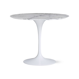 De originele Saarinen Tulip Table is nog steeds verkrijgbaar bij Knoll, in verschillende formaten en materialen. Die zie je ook onderaan dit artikel. Populair zijn vooral de uitvoeringen met een marmeren blad, zoals Arabescato of Nero Marquina, afgewerkt met een beschermende coating tegen vlekken. De aluminium voet is leverbaar in wit of zwart en voorzien van een duurzame Rilsan-coating.