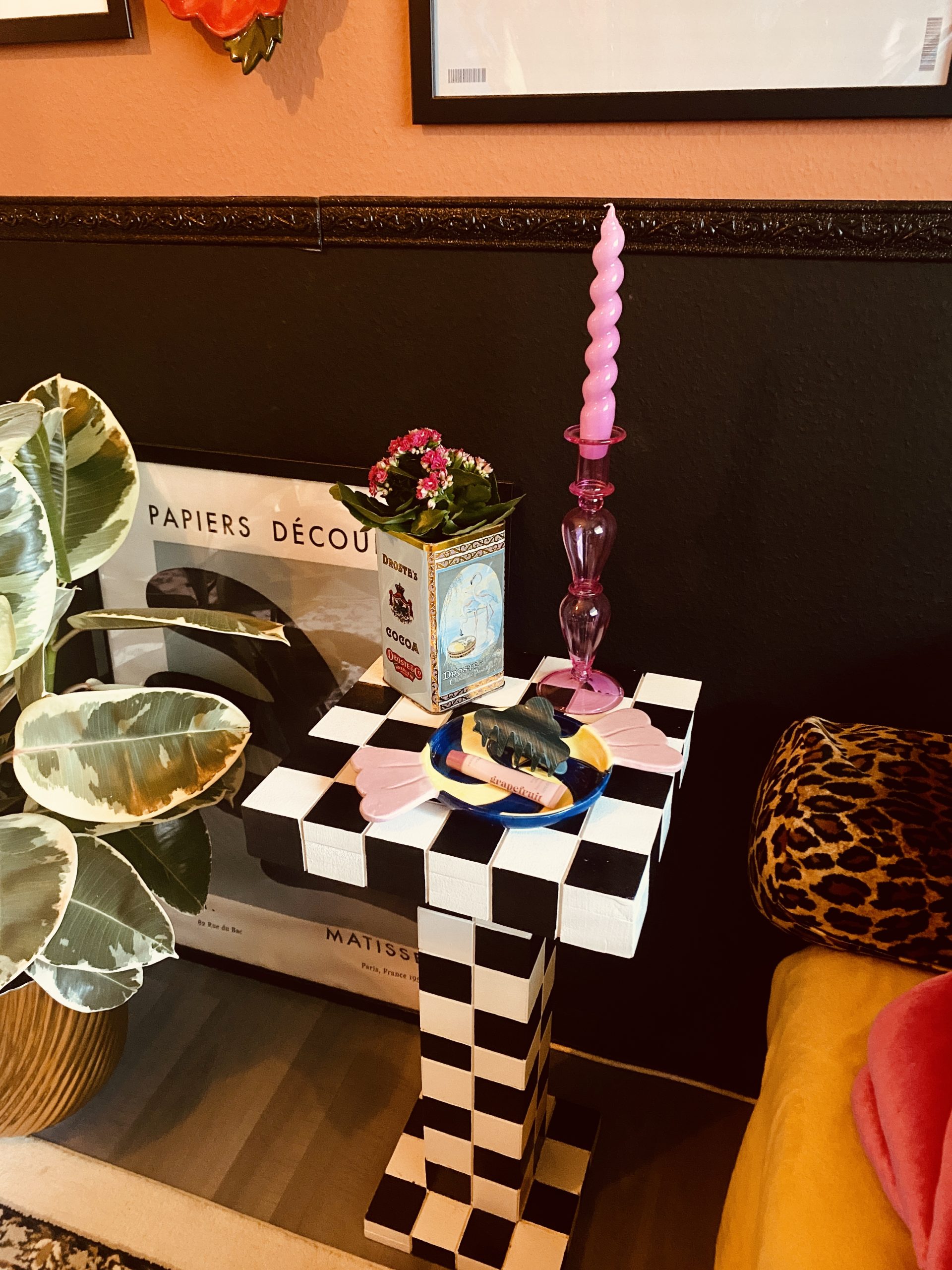 “Ik heb een zelfgemaakte tafel van hout die ook dient als nachtkastje. We hebben er allemaal dingen in gegraveerd waardoor het lijkt op zwart witte geblokte tegels. De ene keer staat er een kop thee op met de afstandsbediening, een andere keer is het een borreltafel. Een multi-inzetbaar tafeltje dus.