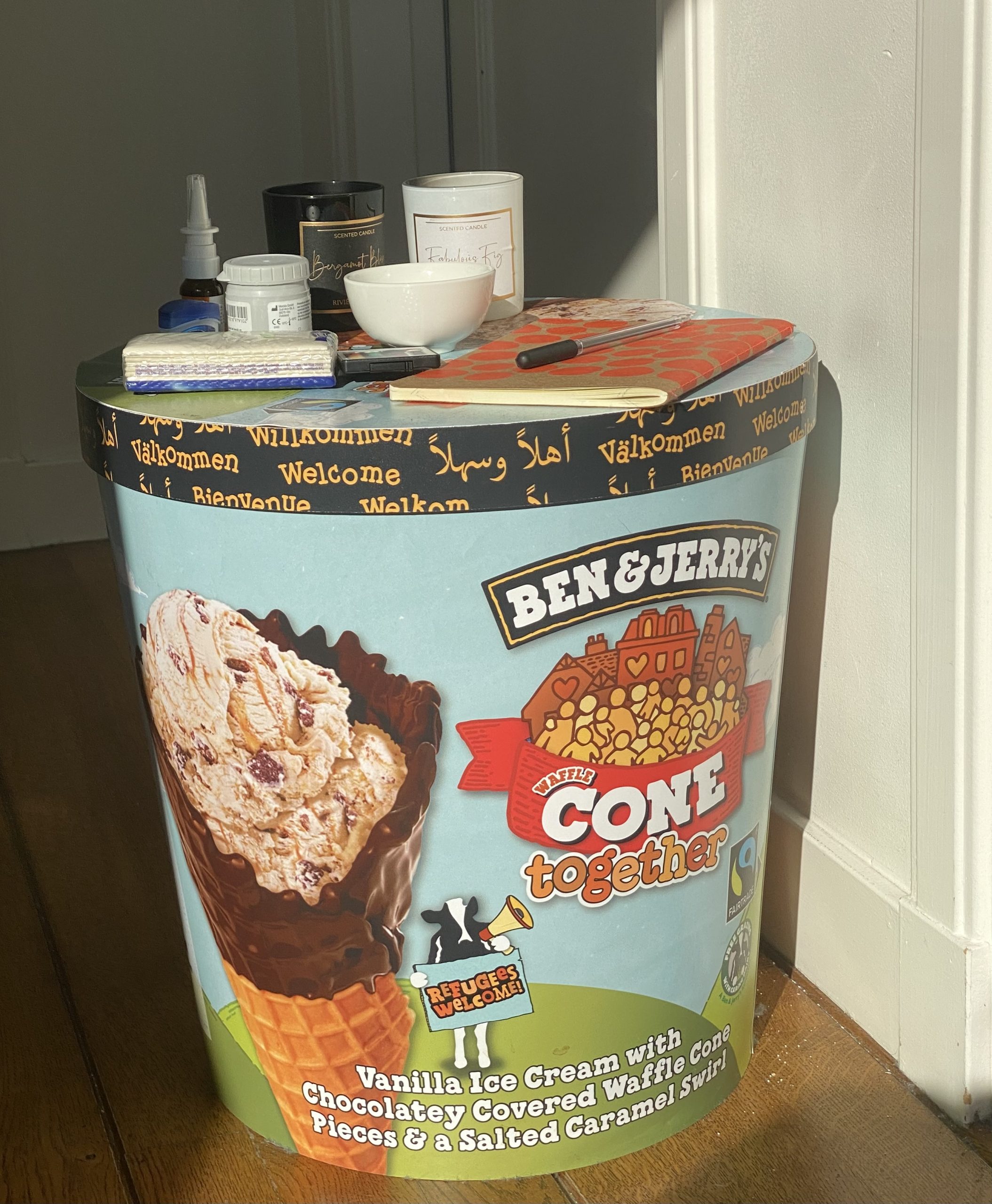 Wat voor nachtkastje heb je? “Ik heb op dit moment een ’tussen-nachtkastje’, er staat een grote cup van Ben and Jerry’s naast mijn bed. Deze zomer ga ik het huis uit, daarom hou ik voor nu dit tafeltje. Als ik op mezelf woon kies ik iets wat bij mijn stijl past.