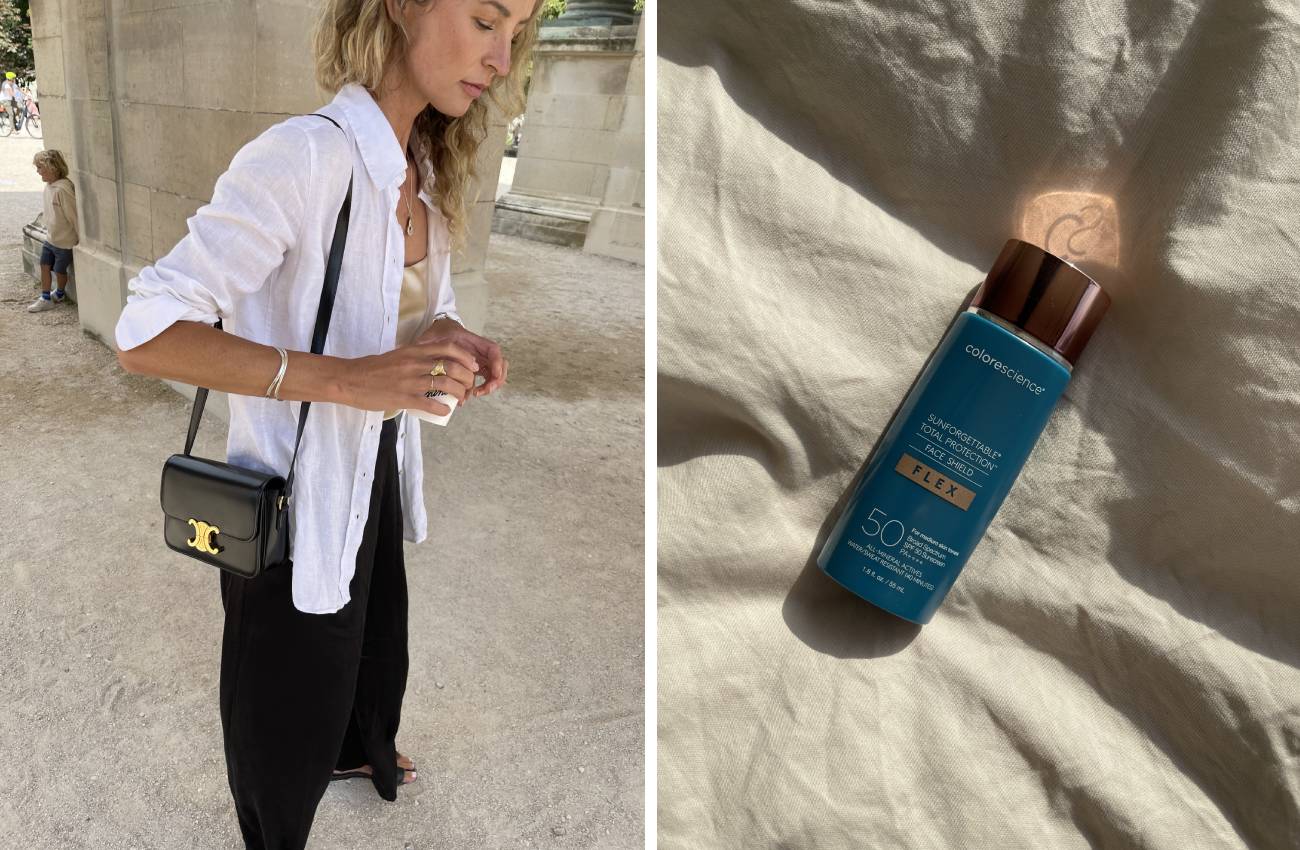 ©Anouk Yve – Links: Anouk met haar Celine Triomphe Teen bag, rechts: de Color Science zonnebrand