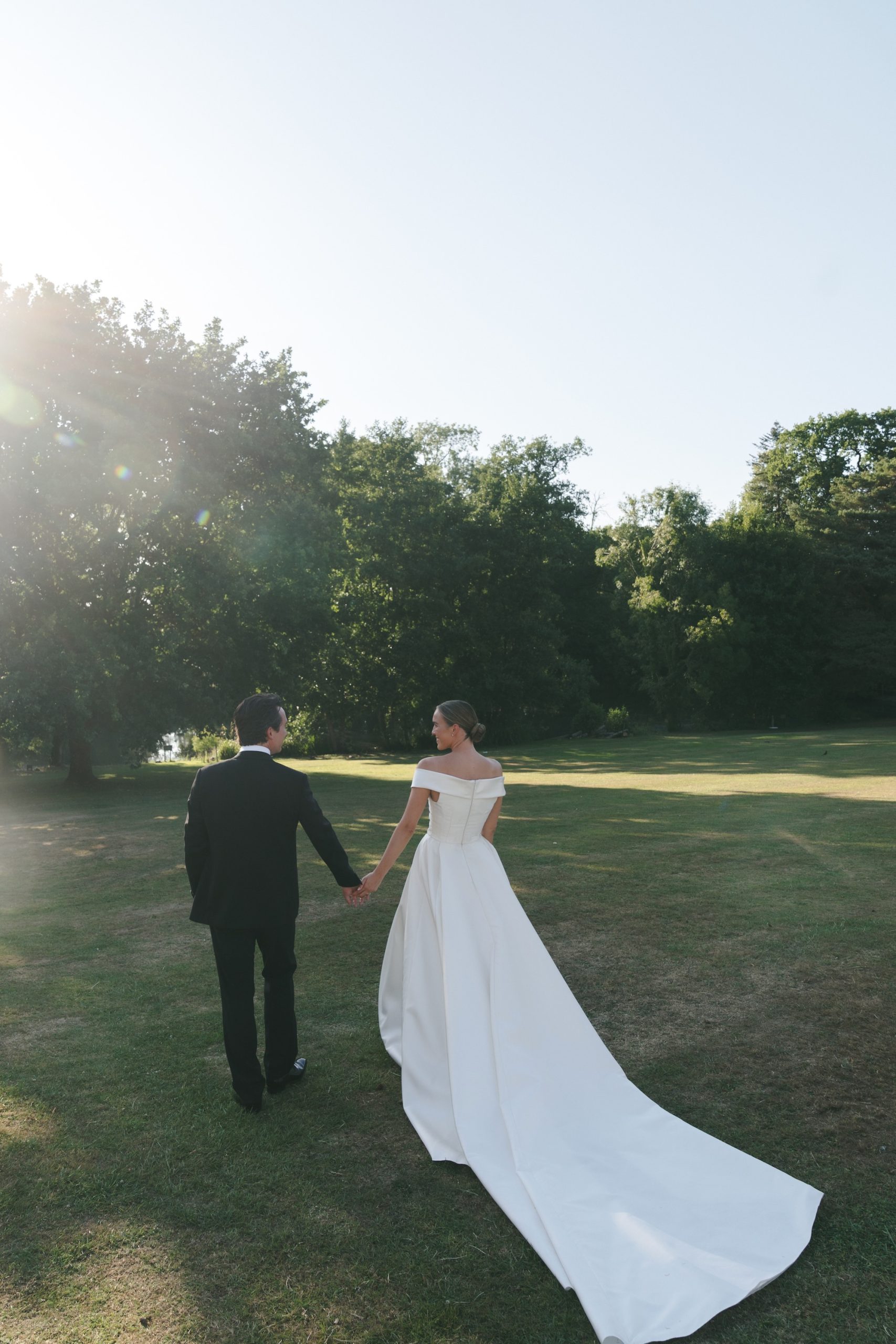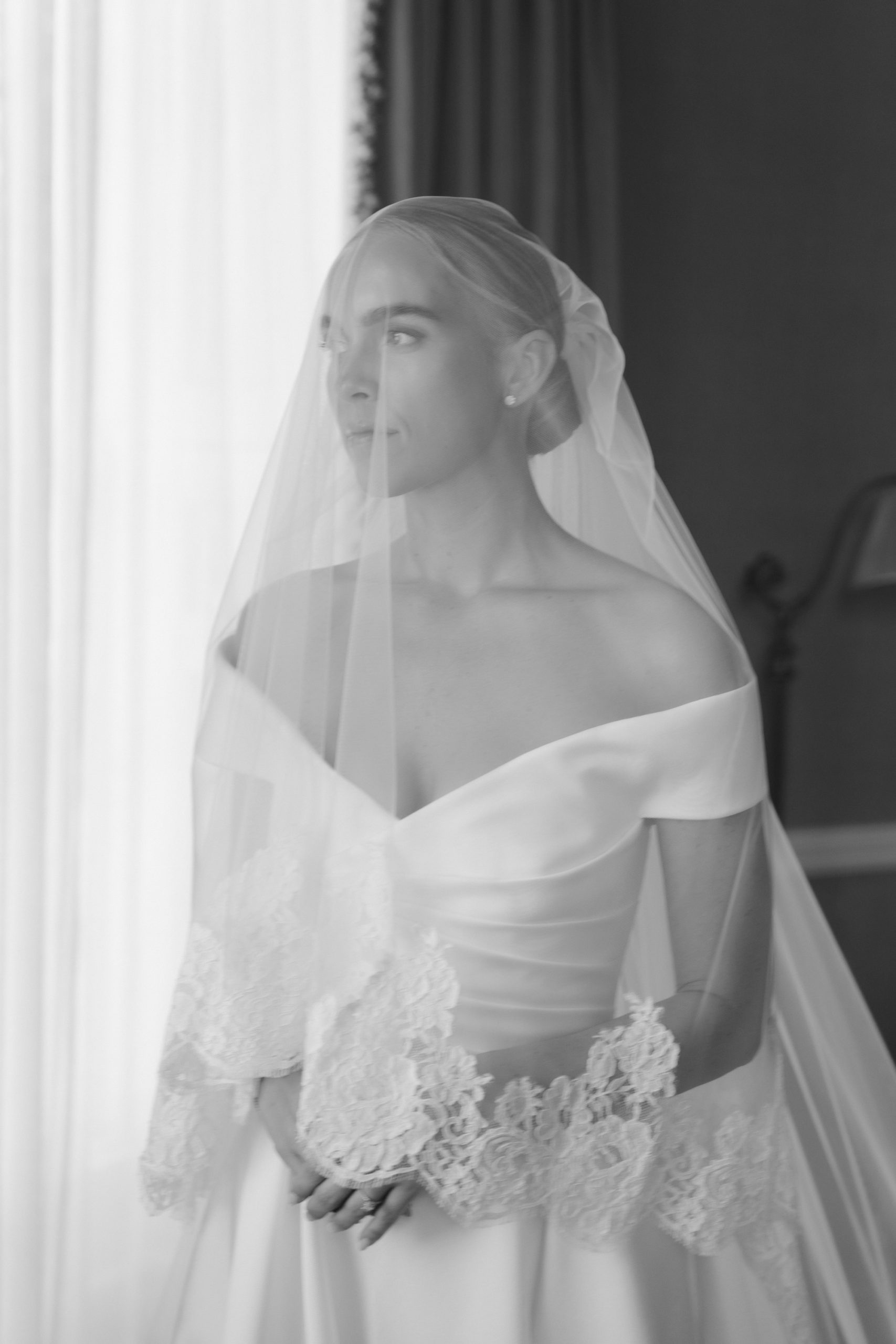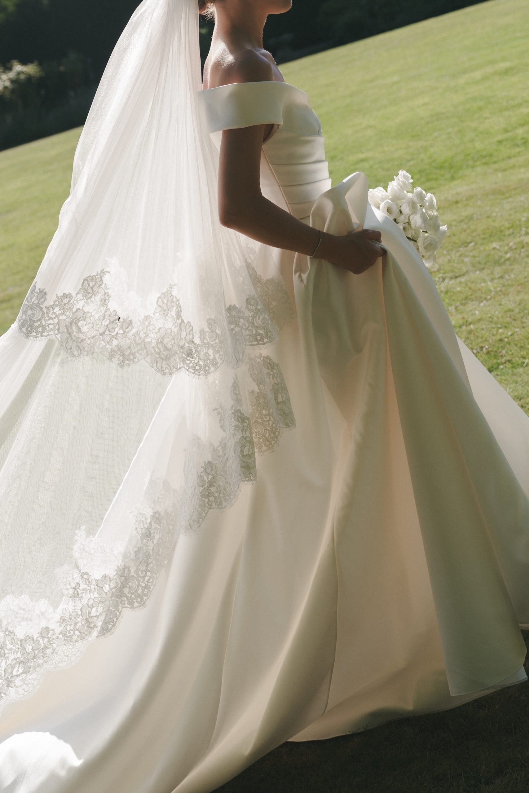 Lauren had in totaal vier bruidslooks, allemaal geïnspireerd door het Engelse platteland. Voor haar trouwjurk had de bruid een duidelijke visie: “Ik wilde iets klassieks, tijdloos, off-the-shoulder, volledig van satijn en vooral zonder poespas. Het moment dat ik de jurk aantrok, vergeet ik nooit meer. Mijn moeder en vriendinnen gaven de doorslag – we wisten het allemaal meteen: dit is hem”, aldus de bruid, over de creatie van Elie Saab die ze vond in een bruidswinkel in Antwerpen. “Omdat de jurk zo klassiek en clean was, wilde ik er graag een extra bijzonder element aan toevoegen. Daarom liet ik een drie meter lange sleep maken van prachtig Frans kant.”