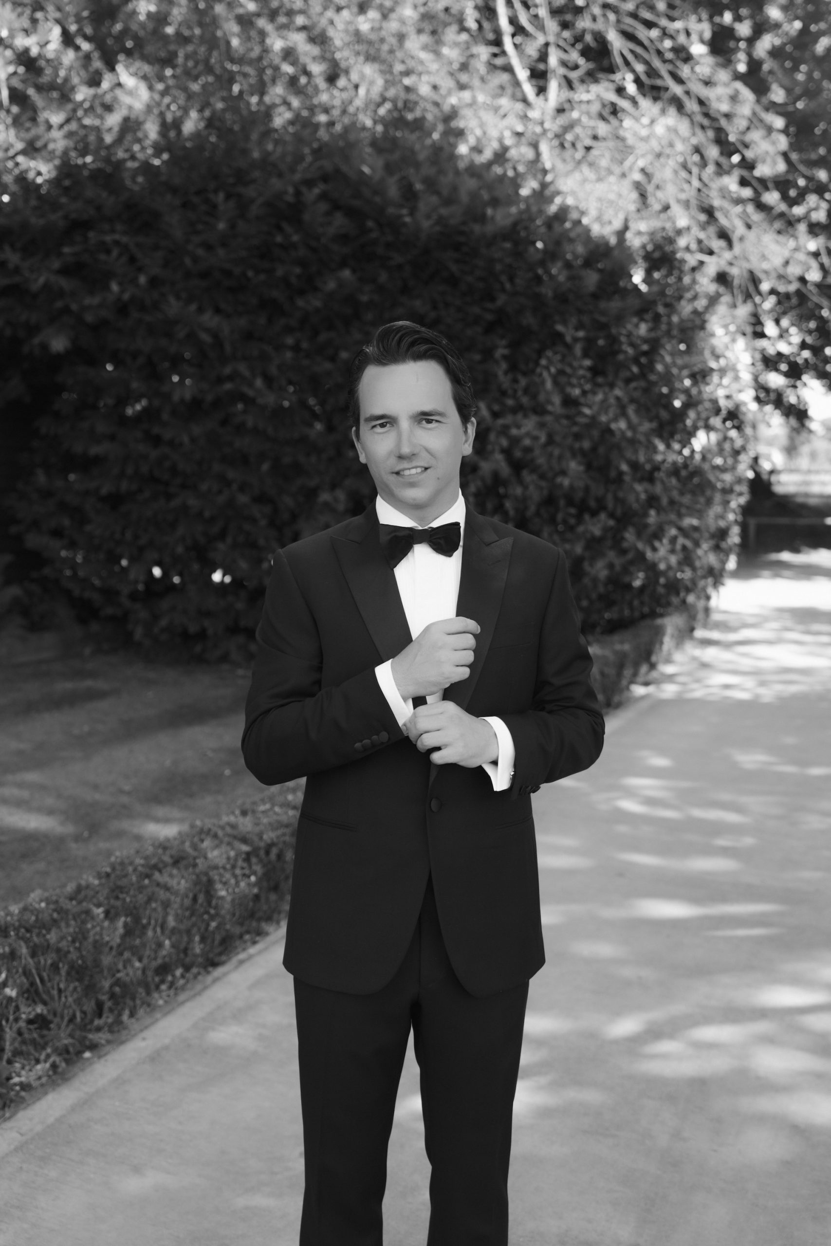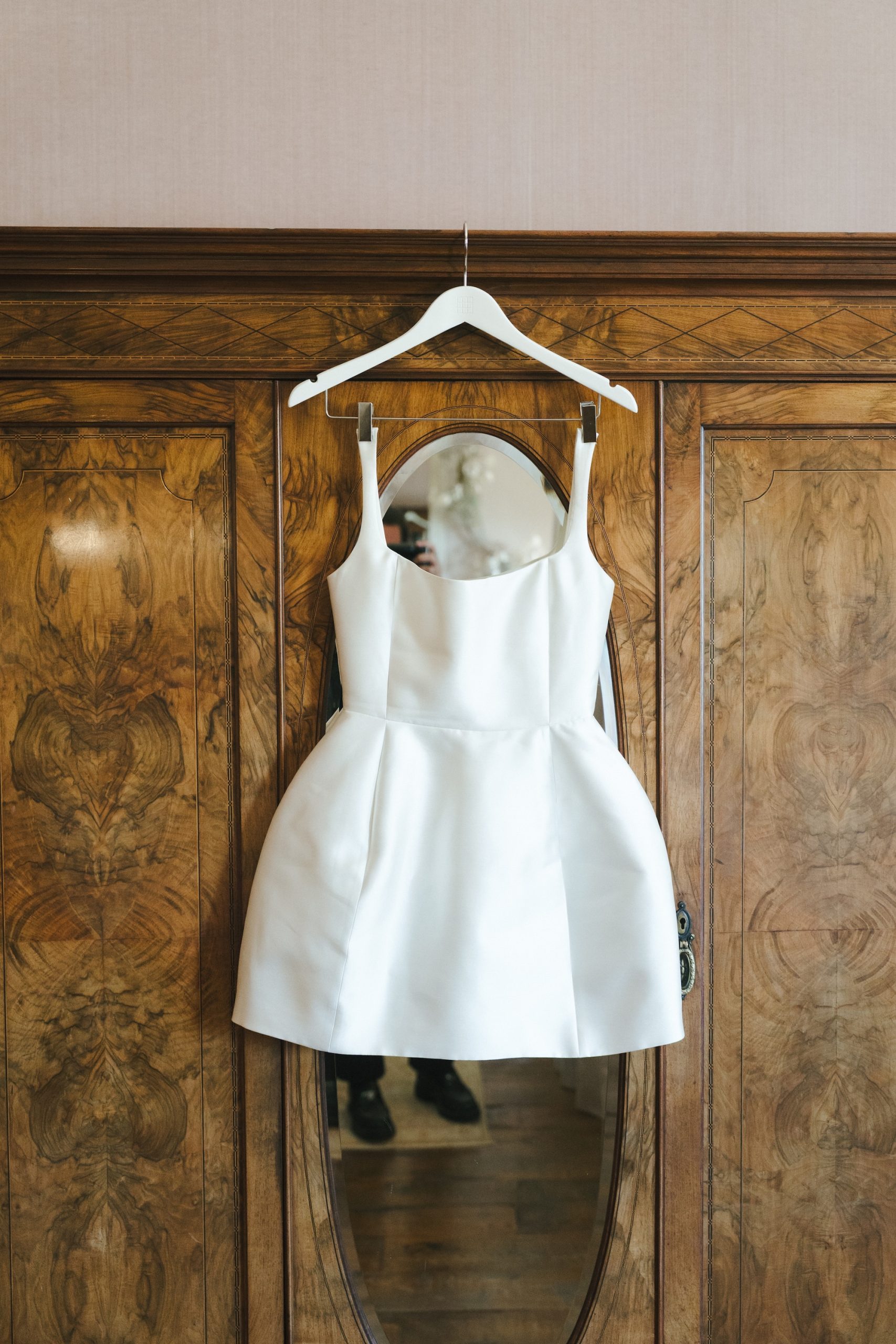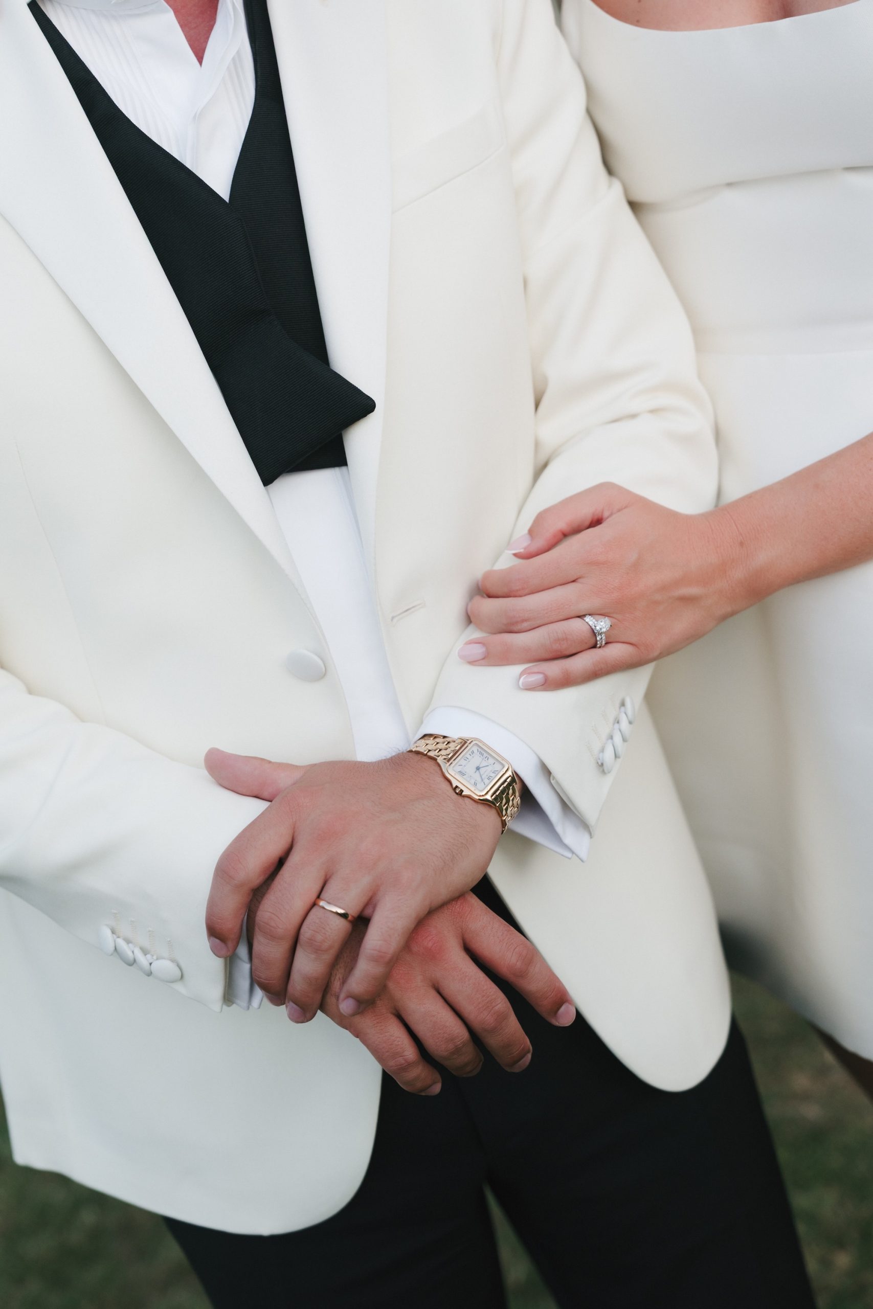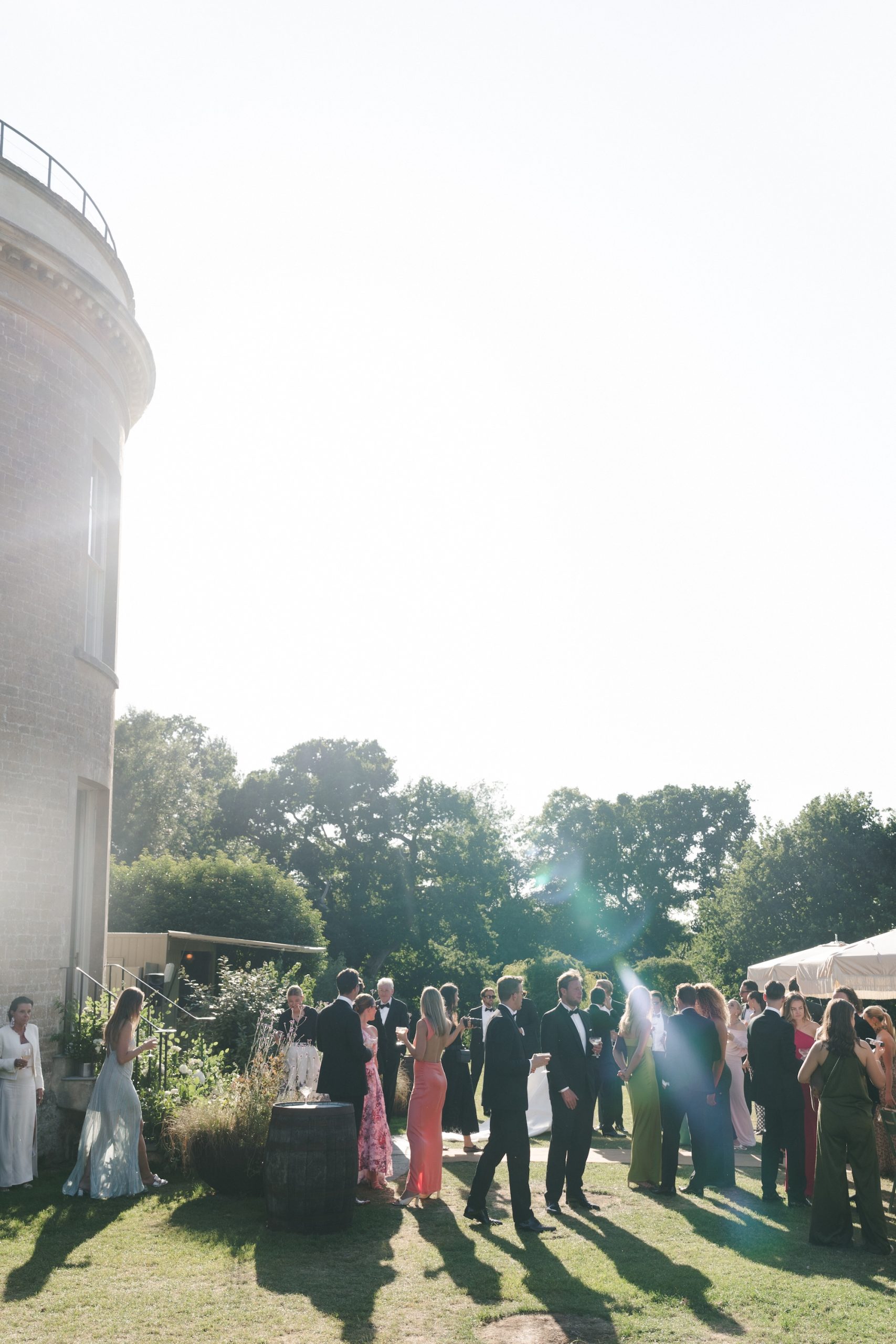 Na de ceremonie was het tijd voor de receptie op het met witte parasols en bloemen versierde gazon, waar champagne en canapés werden uitgedeeld. Voor het diner kleedde het stel zich om: Dino in een wit jasje met een losse strik van Corneliani, gecombineerd met een smokingbroek en lakschoenen van Santoni. Lauren droeg wederom een jurk van De La Vali: een kort model van zijde in combinatie met een diamanten tennis bracelet en Amina Muaddi-hakken in zilver met kleine studs.