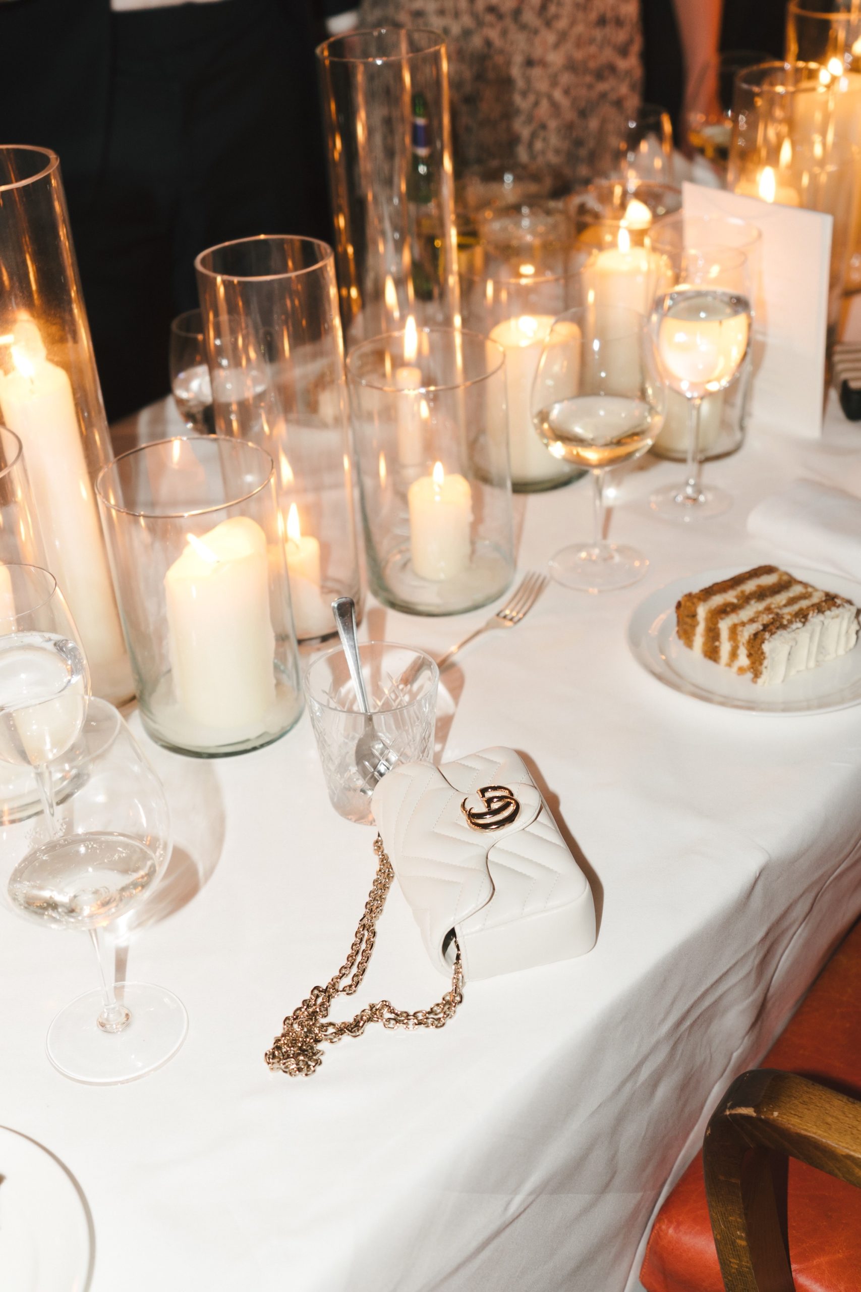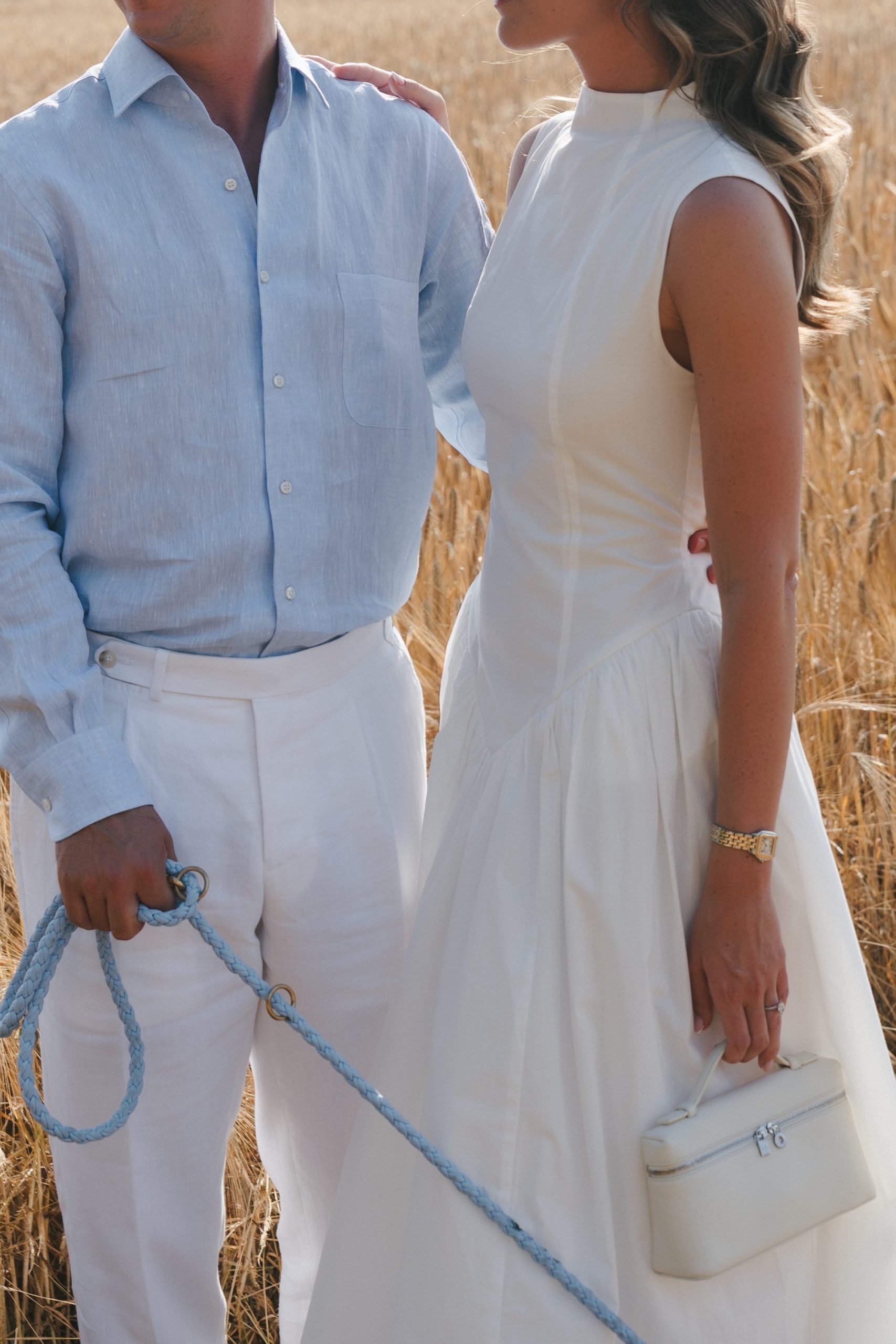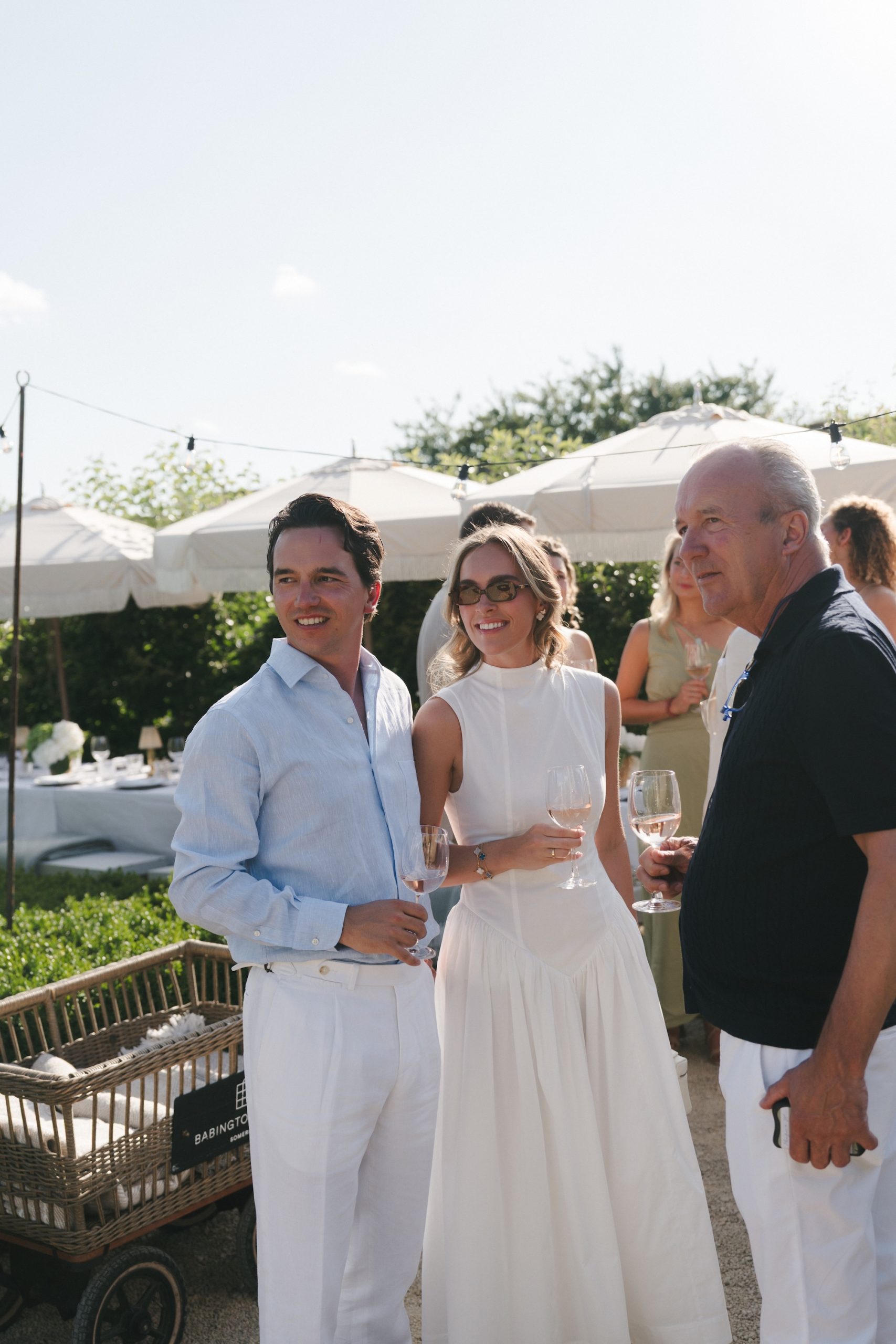 “Het thema was All English Attire en iedereen zag er nog mooier uit dan we ons ooit hadden kunnen wensen. Het voelde alsof we in een scène uit een film beland waren: een sprookjesachtige avond onder een blauwe lucht die langzaam roze kleurde, de band die liefdesliedjes speelde, vuurkorven die werden aangestoken en iedereen die genoot van de sharing-style barbecue”, vertelt Lauren, die voor de gelegenheid een witte midi-jurk met hoge hals van De La Vali droeg, gecombineerd met witte en blauwe sieraden, een pouch van Loro Piana en blauwe slingbacks van Chanel.