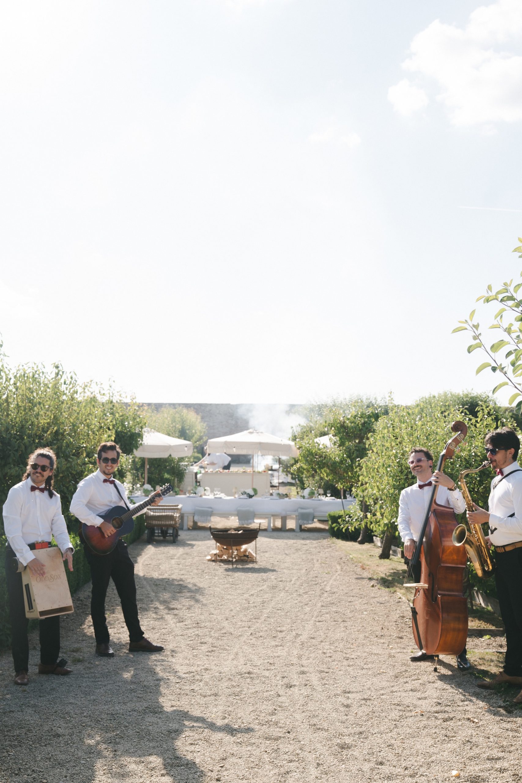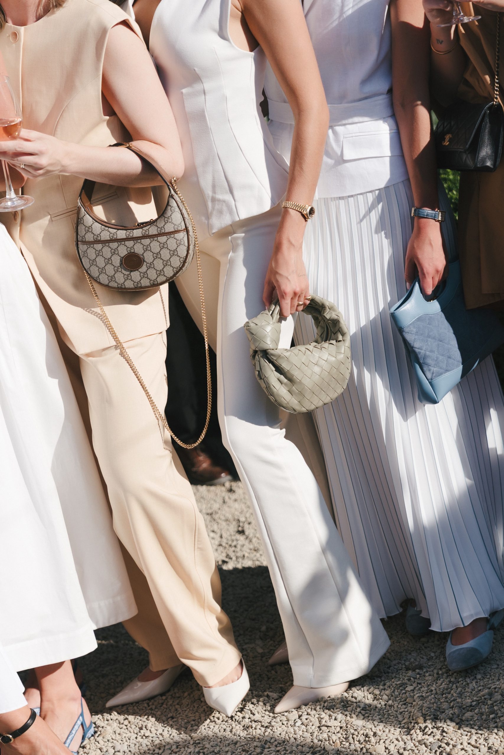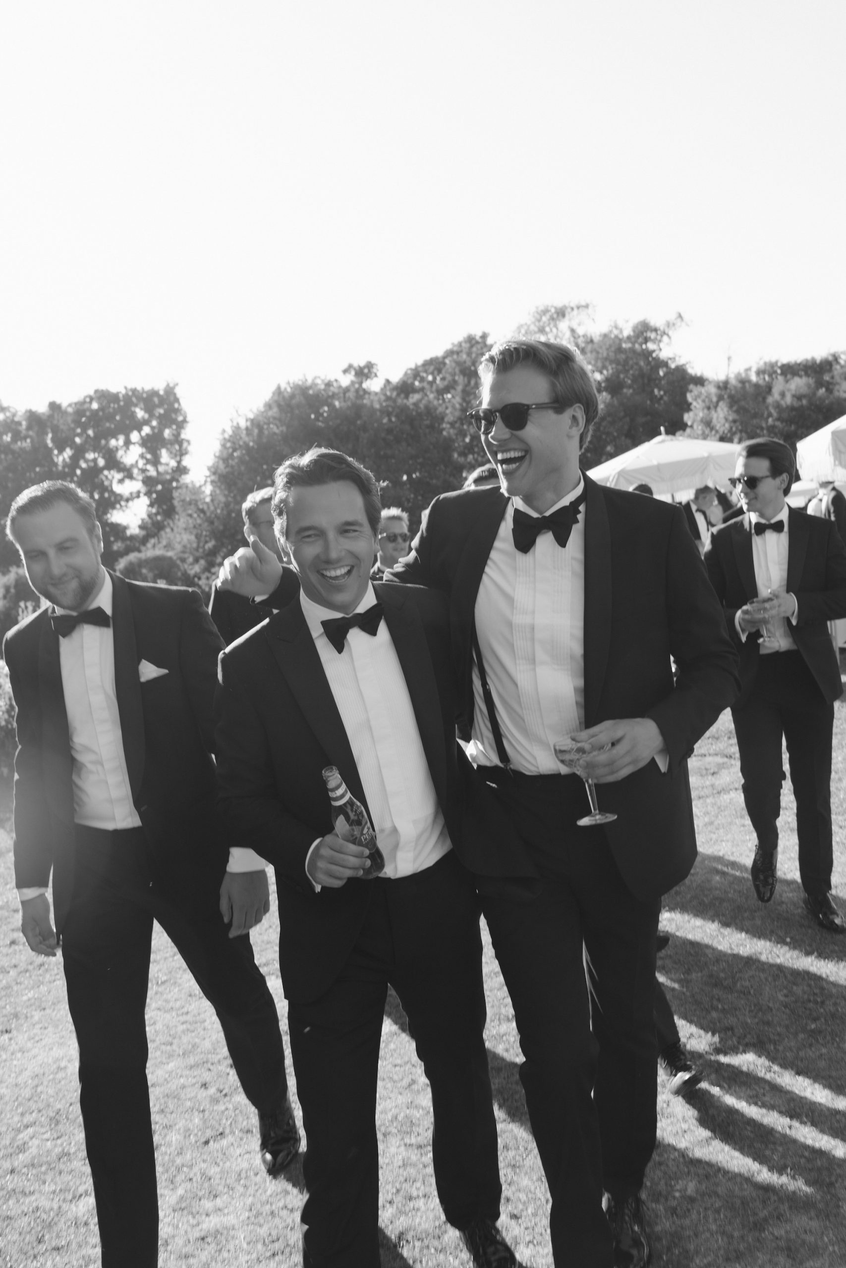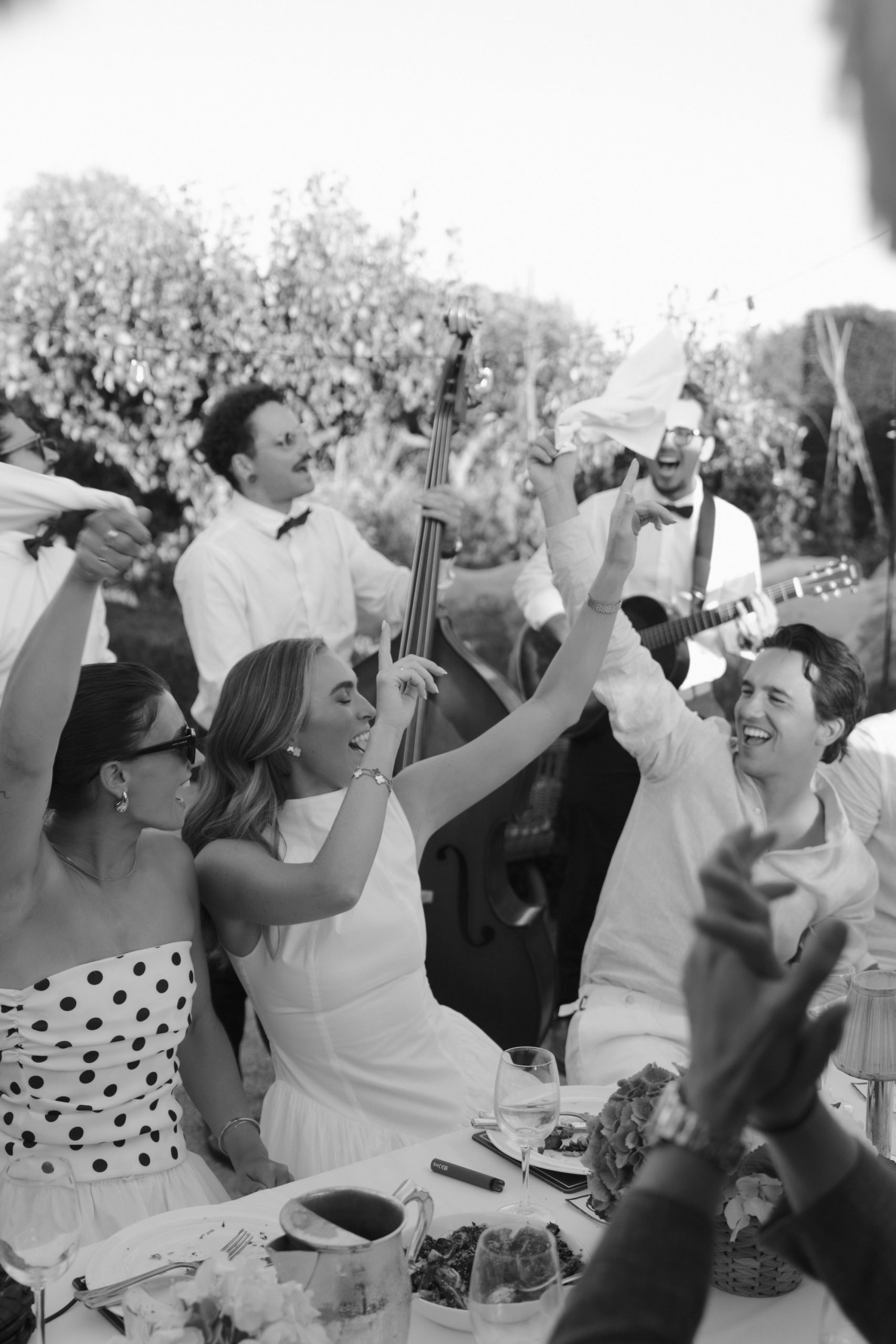 “Het thema was All English Attire en iedereen zag er nog mooier uit dan we ons ooit hadden kunnen wensen. Het voelde alsof we in een scène uit een film beland waren: een sprookjesachtige avond onder een blauwe lucht die langzaam roze kleurde, de band die liefdesliedjes speelde, vuurkorven die werden aangestoken en iedereen die genoot van de sharing-style barbecue”, vertelt Lauren, die voor de gelegenheid een witte midi-jurk met hoge hals van De La Vali droeg, gecombineerd met witte en blauwe sieraden, een pouch van Loro Piana en blauwe slingbacks van Chanel.