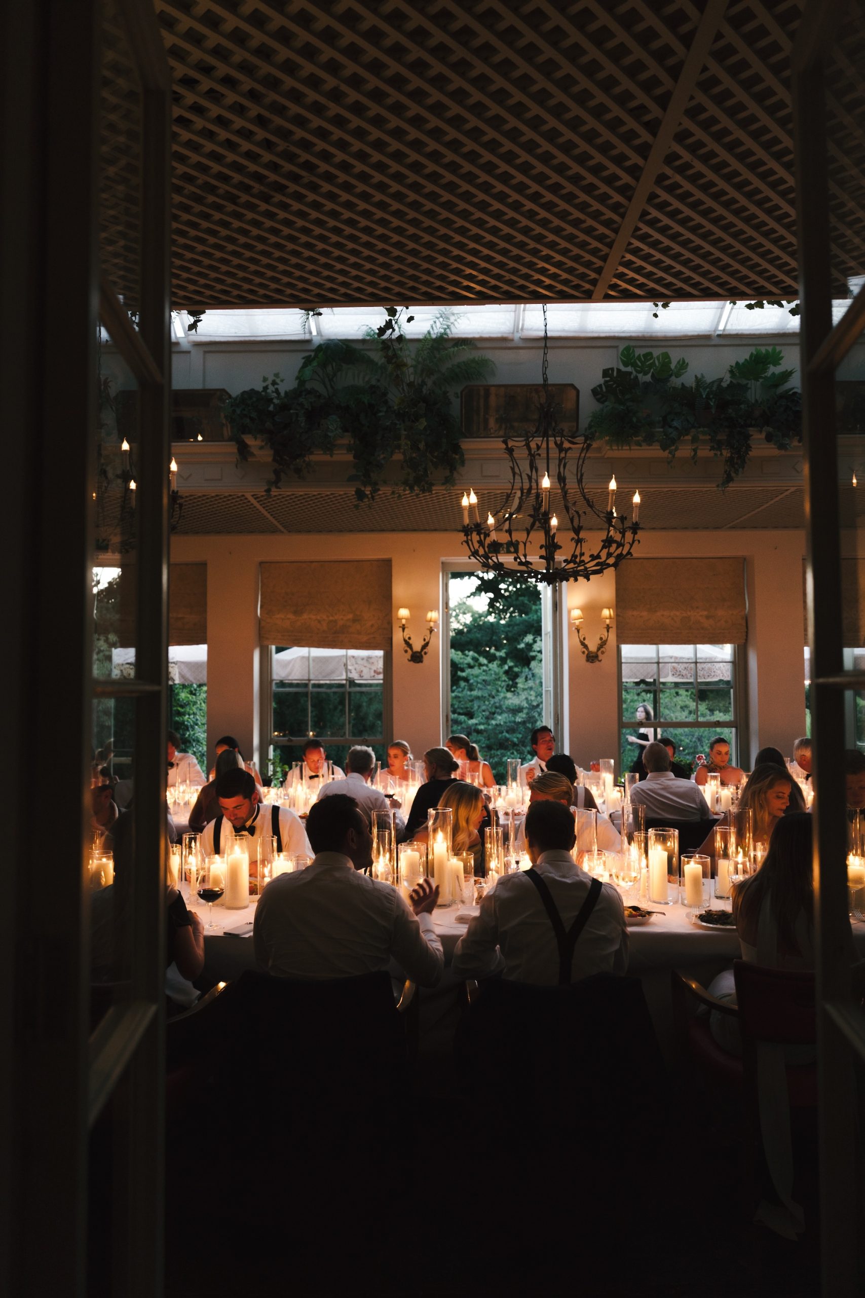 Op het nummer Signed, Sealed, Delivered liep het koppel richting de oranjerie – een mooie serre-achtige zaal met hoge ramen en een glazen dak met uitzicht op het meer – voor het diner, waar ze met luid applaus werden ontvangen. De vibe was een klassiek Engels country house: de tafels waren gedekt in wit linnen, met witte servetten en in goudfolie gedrukte, gepersonaliseerde menu’s, en een heleboel kaarsen voor een intieme sfeer.