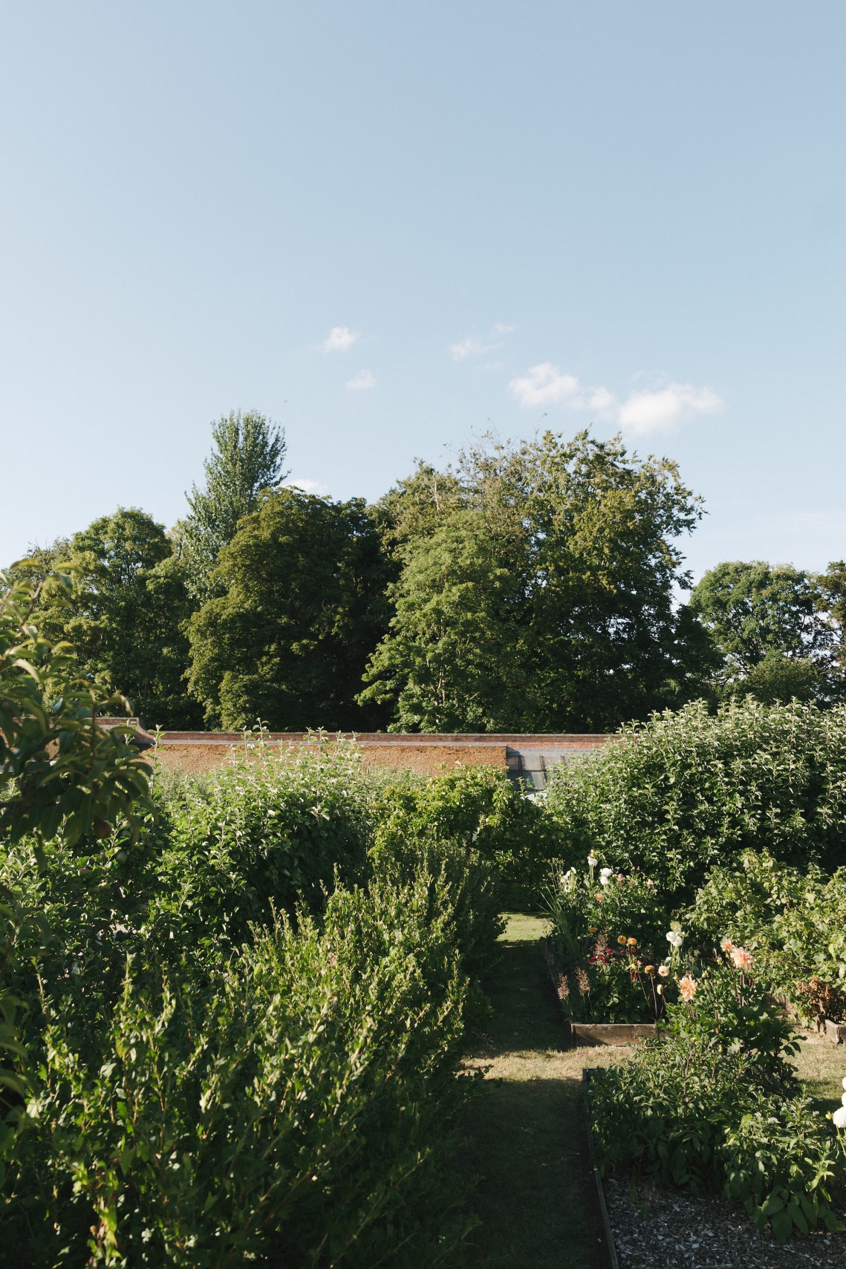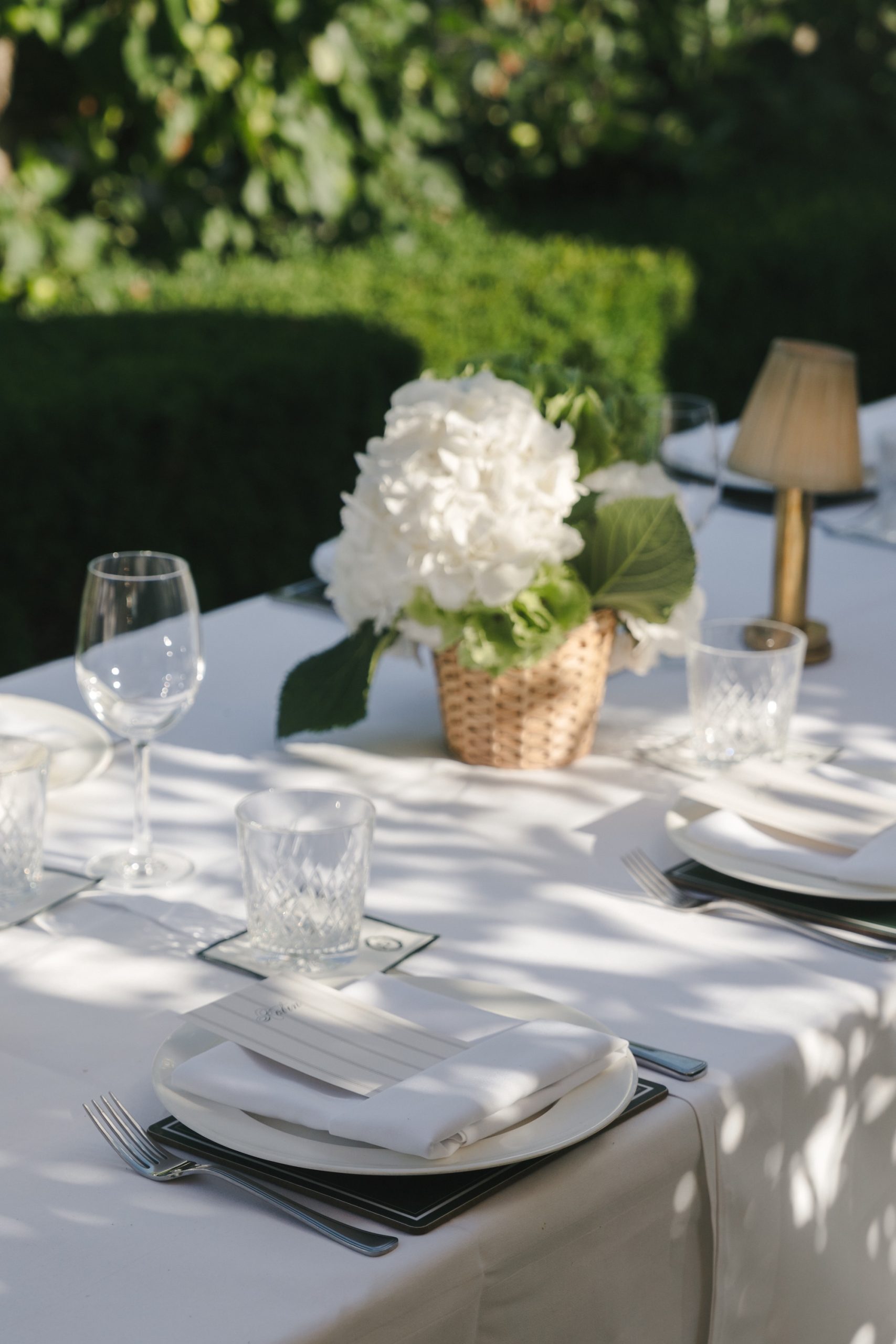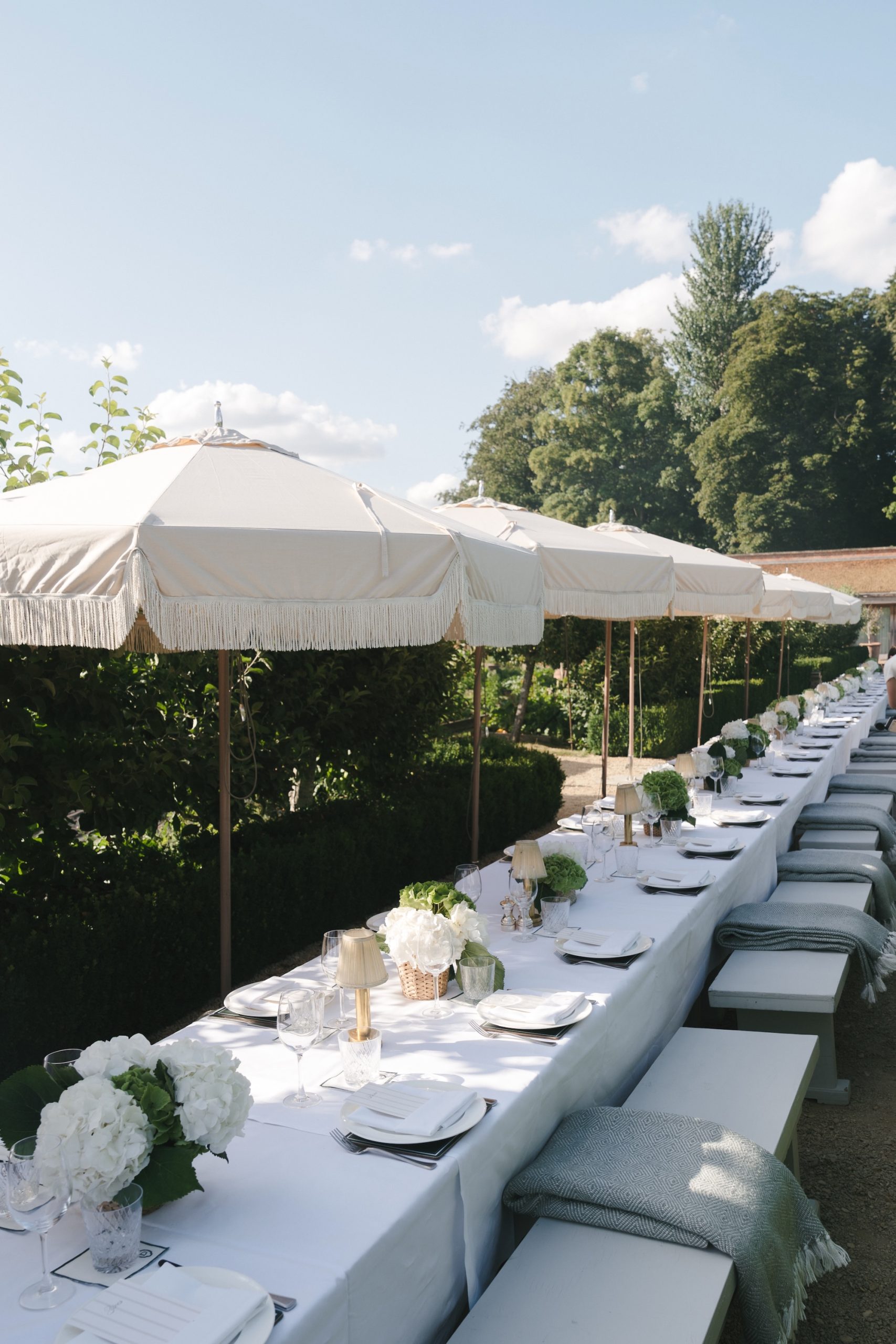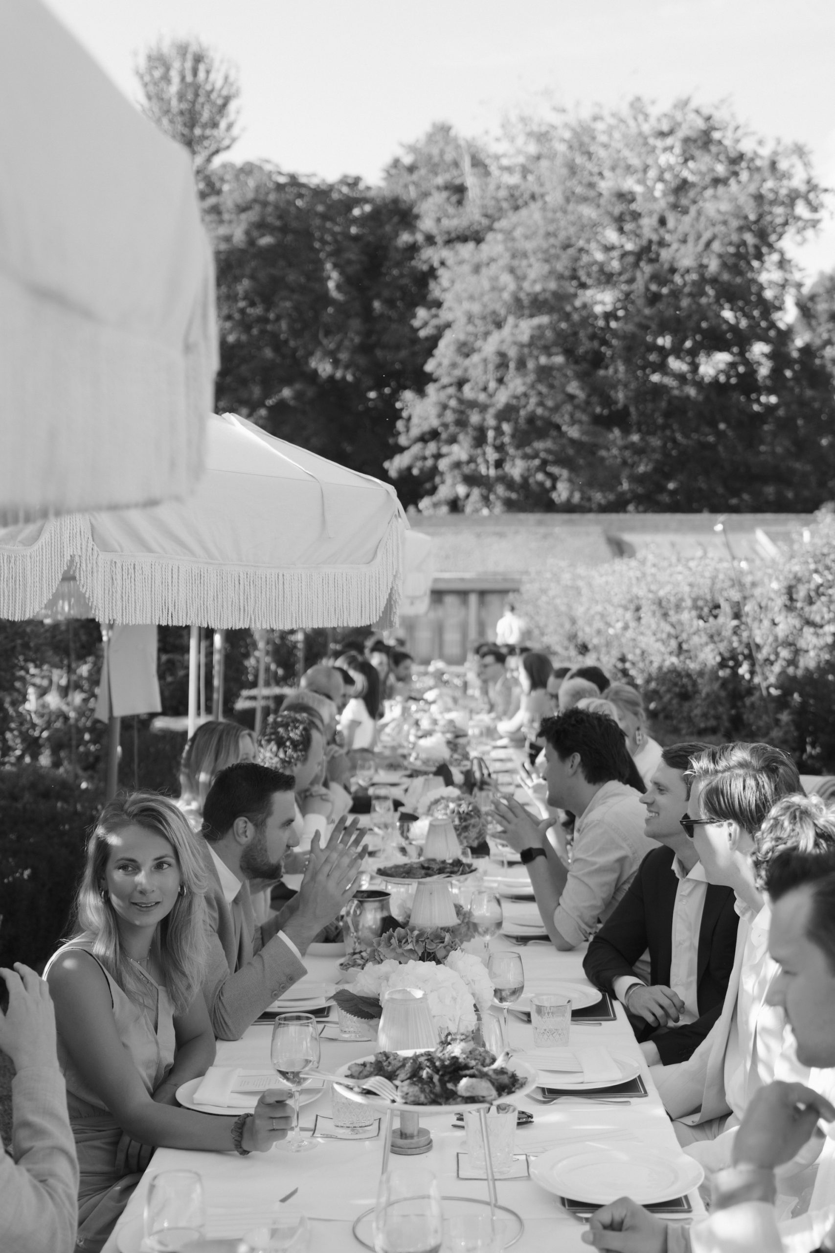De huwelijksdagen begonnen in de namiddag. Lauren en Dino verwelkomden hun gasten met een klassieke Engelse high tea: scones met clotted cream en jam, worteltaart en Engelse thee. Terwijl iedereen zich klaarmaakte voor het diner, liepen Lauren en Dino langs de maïsvelden de Walled Garden in – een charmante ommuurde tuin vol bloemen en zelfgekweekte groente en fruit. De avondzon viel op de lange, in wit linnen gedekte tafel met gepersonaliseerde groen-witte servetten van Blank Space. Op tafel stonden rieten mandjes gevuld met hortensia’s, goudkleurige tafellichten en groen-wit gestreepte menu’s met ieders naam.