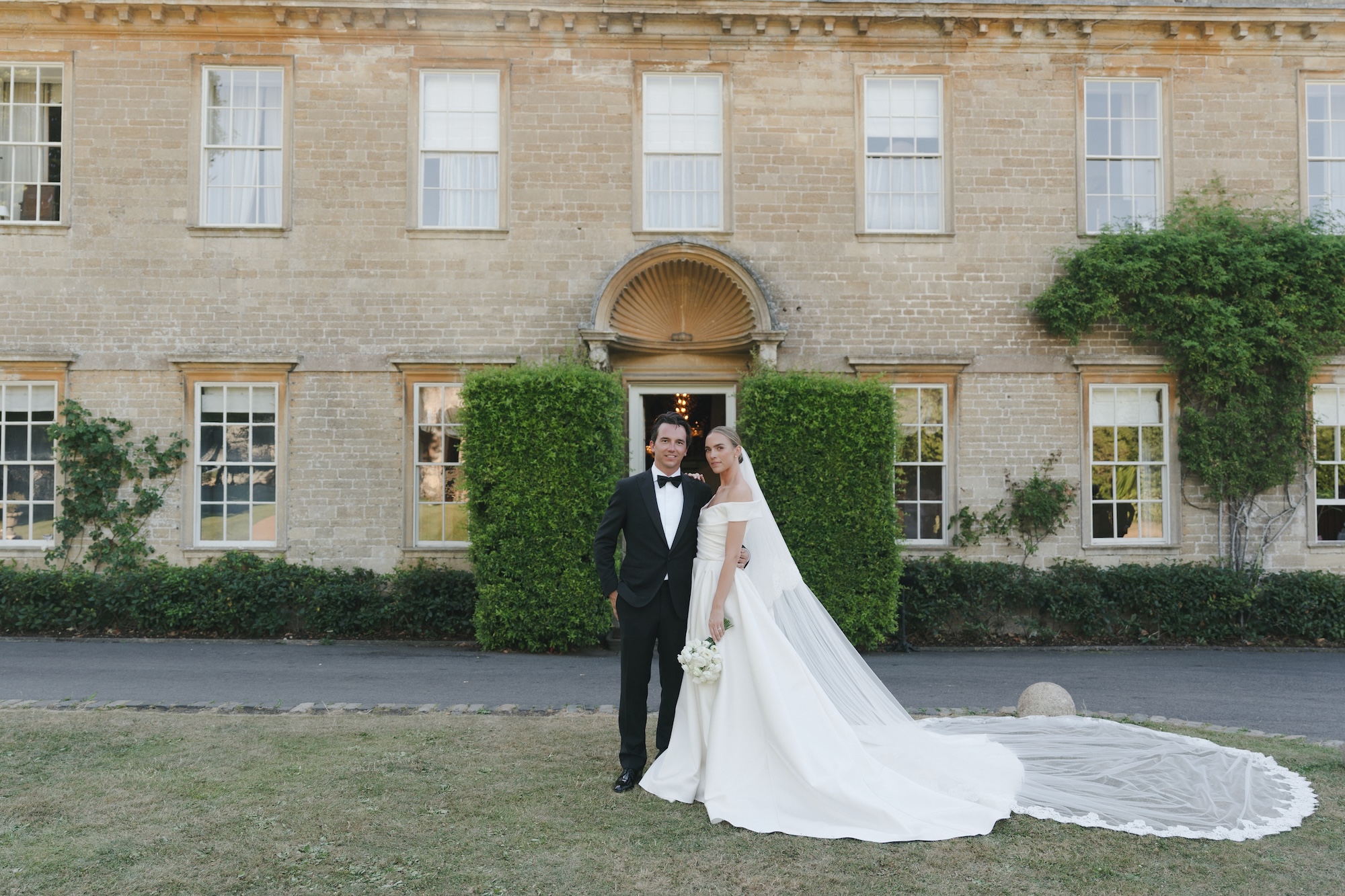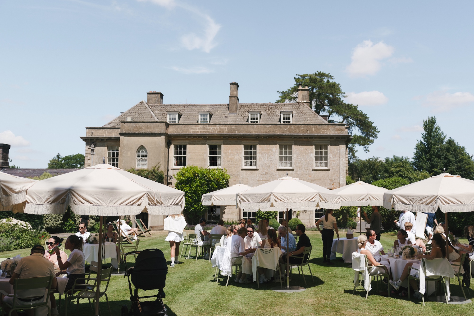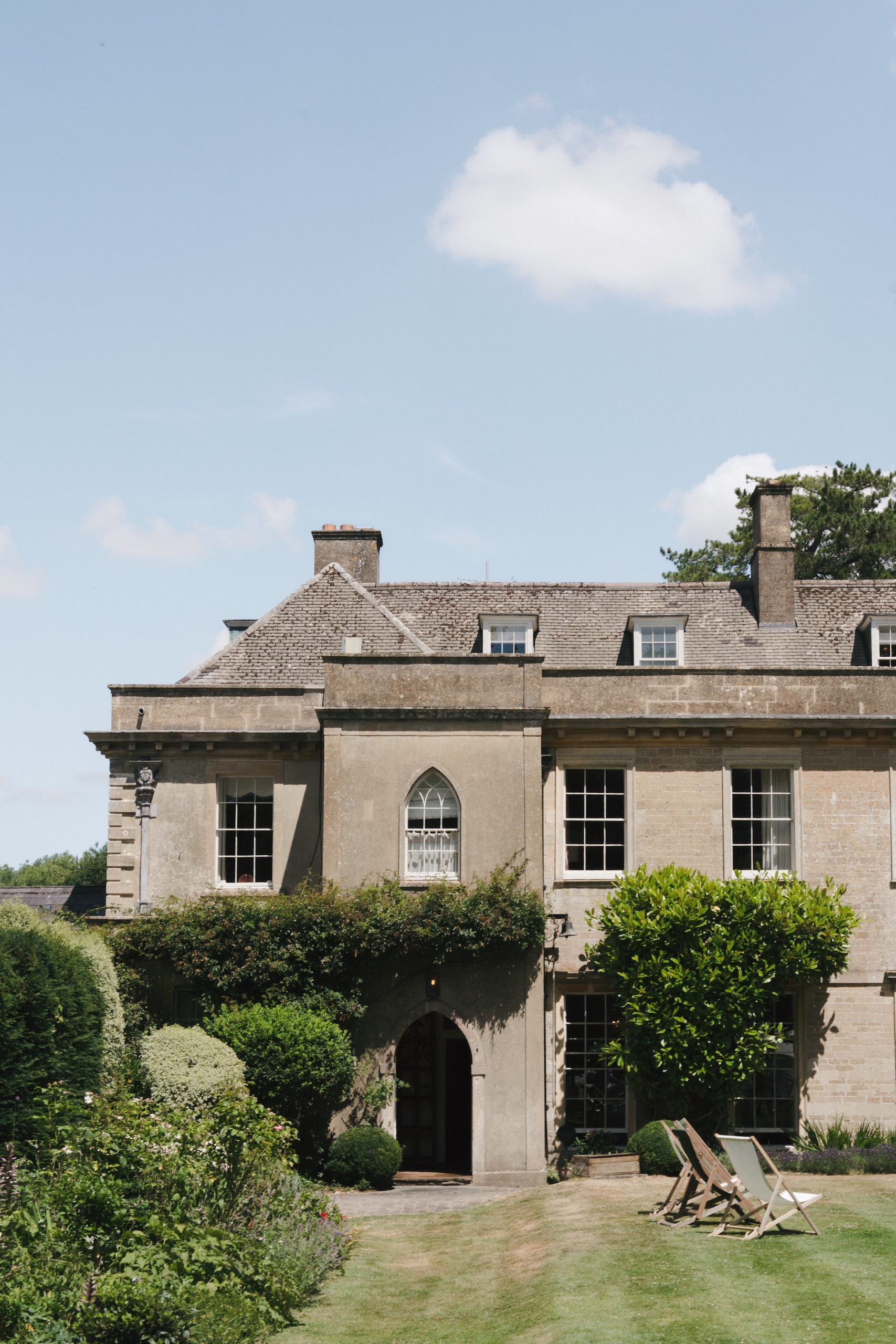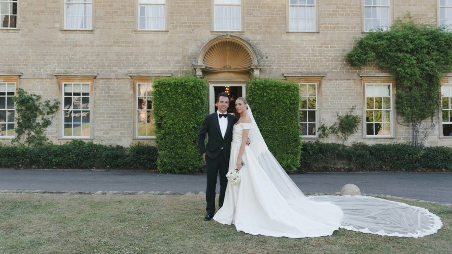 Als trouwlocatie koos het stel voor Somerset op het Engelse platteland, Soho Babington House om precies te zijn. “Het is een plek waar je volledig tot rust komt. Het landgoed ligt tussen uitgestrekte weiden en maïsvelden. Iedere kamer heeft een open haard, er staan regenlaarzen klaar om ’s ochtends je dag te beginnen met een wandeling, en in een barn-achtige setting vind je een zwembad met groen-wit gestreepte ligbedden en uitzicht op het omliggende meer. Het landgoed is een sprookje – niet alleen de droomsetting voor ons huwelijk, maar ook een romantische getaway voor onze gasten.”