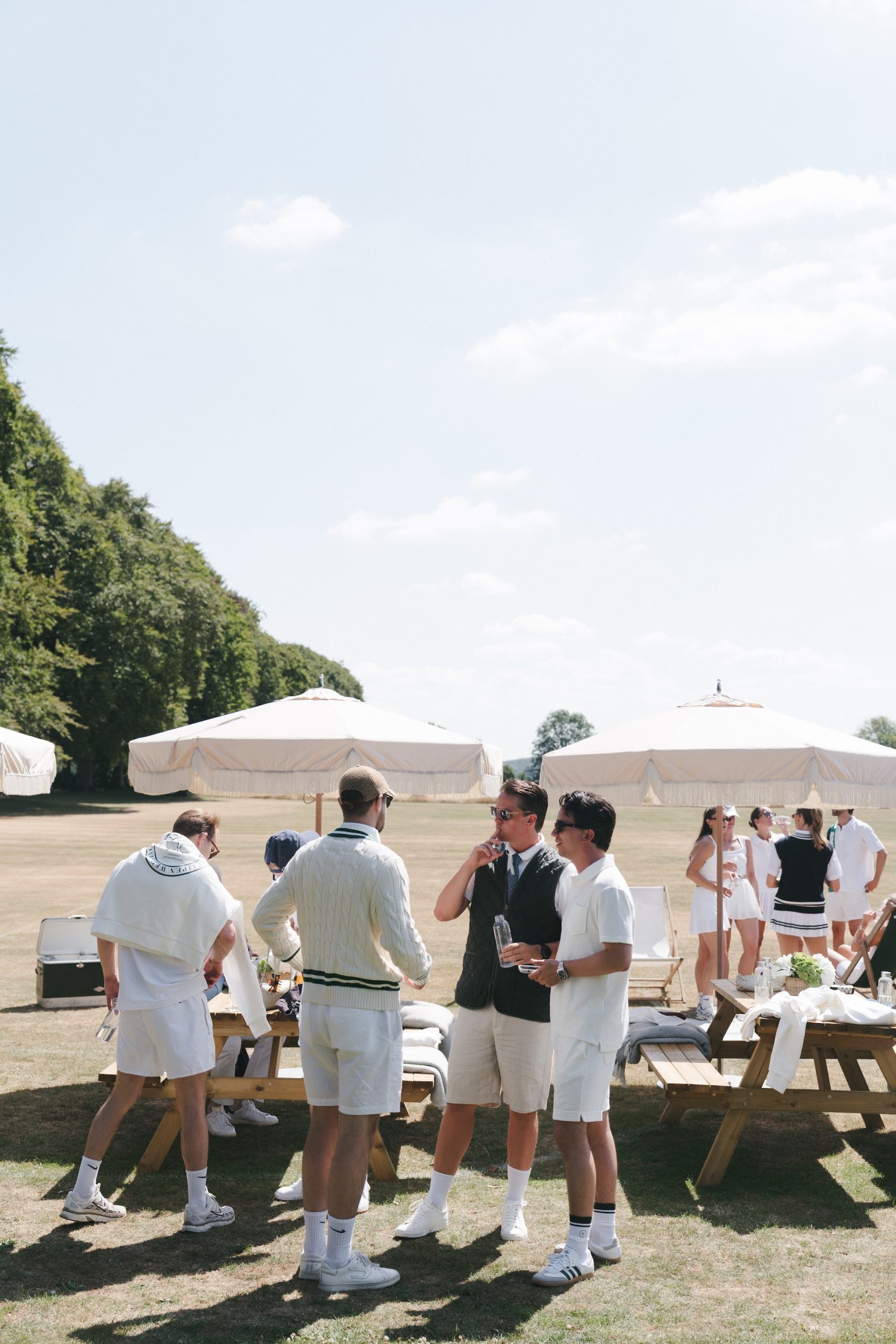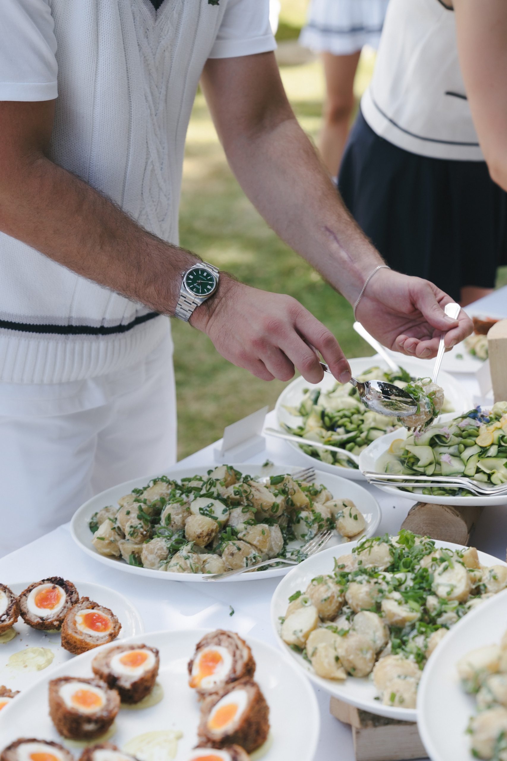 Na een potje tennis was het tijd om op adem te komen en werd de lunch geserveerd. Een lange tafel, opgesteld onder een grote cederboom, was gedekt met klassieke Engelse gerechten. Pimms werd geserveerd in cocktailglazen met wit-groen gestreepte rietjes. “Iedereen straalde in Wimbledon Ralph Lauren vibes: sommigen zaten aan de tafel of op picknickkleden, anderen speelden croquet in de namiddagzon”, zegt Lauren.