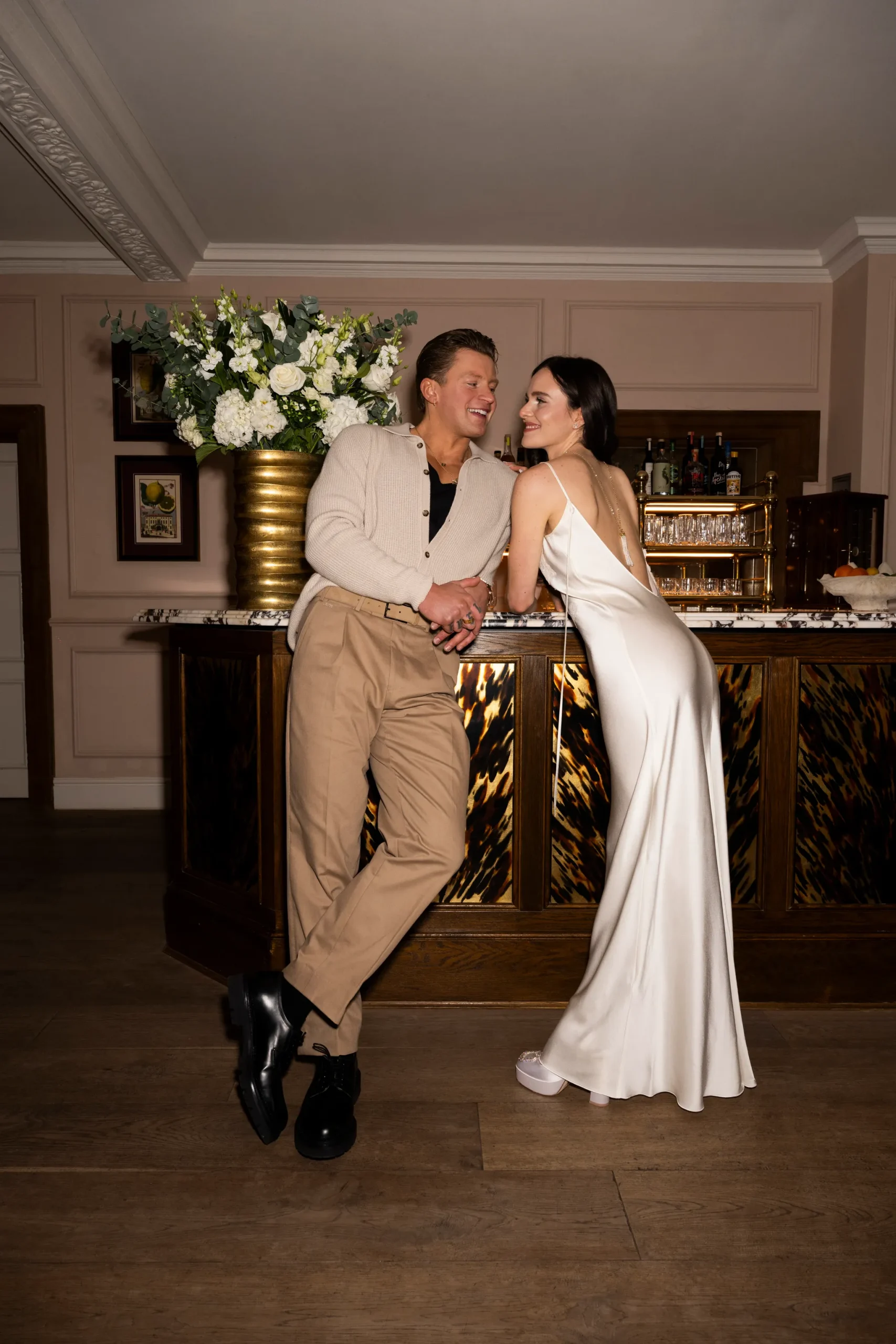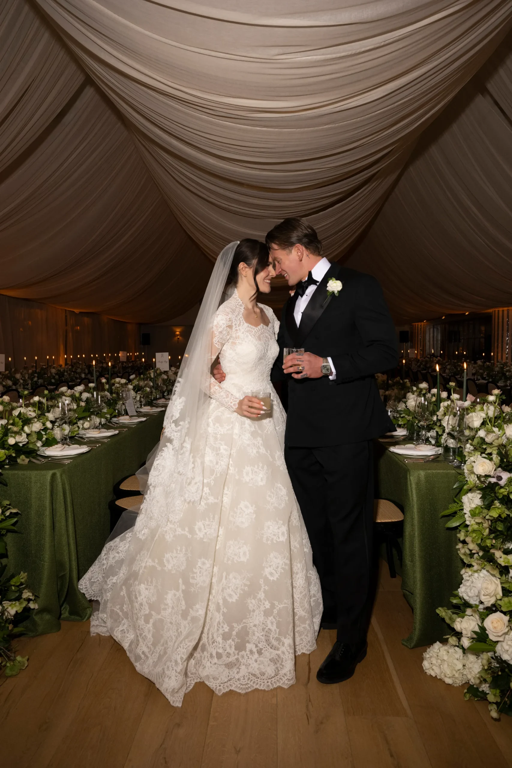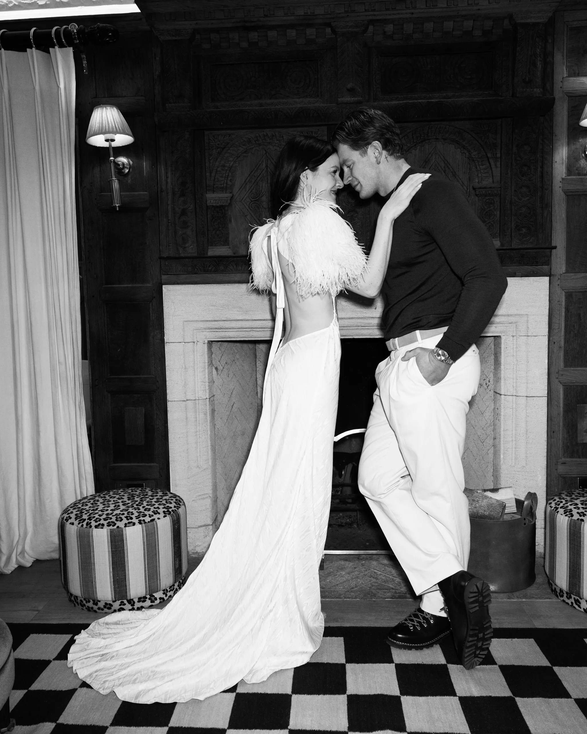 Na een tour langs bruidsboetieks in Londen met haar kleine team van helpers – moeder Tana en haar jongste broertje, de tweejarige Jesse – vond de bruid uiteindelijk de trouwjurk van haar dromen bij Elie Saab. “Ik wist dat ik iets heel traditioneels en vrij bescheiden wilde dragen, met kant”, zegt ze. “Ik ben altijd dol geweest op de jurken van Grace Kelly en Kate Middleton: die prachtige hoge halslijn, supervrouwelijk.”