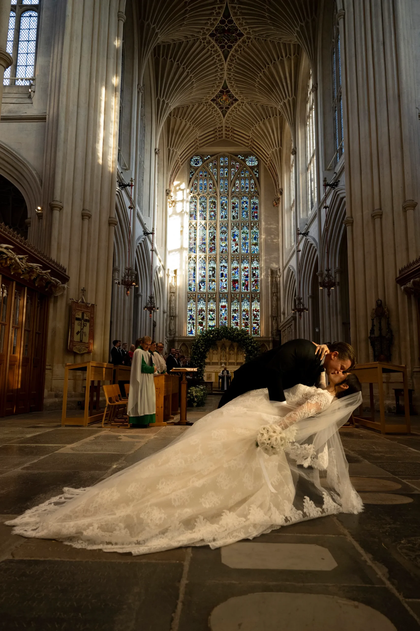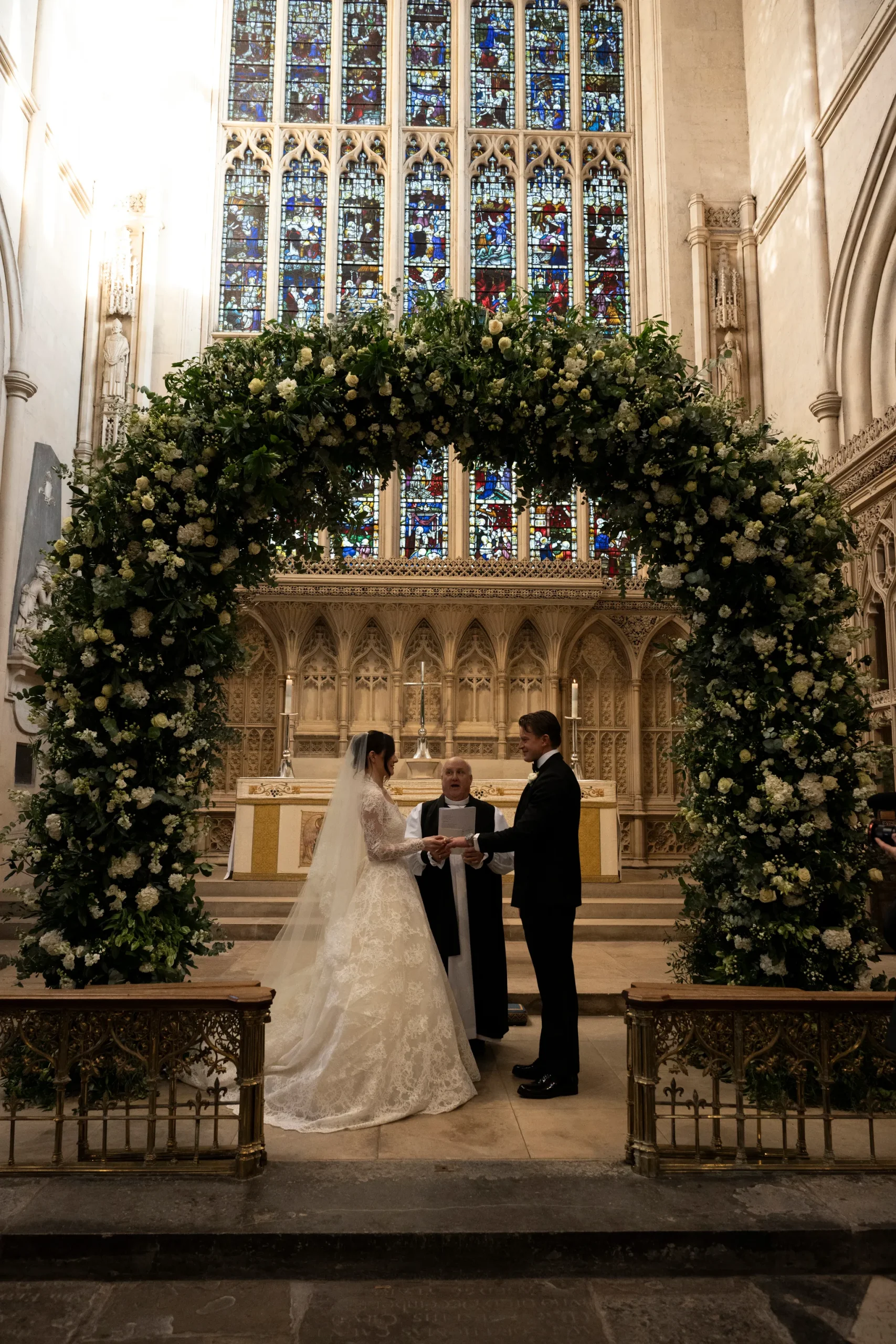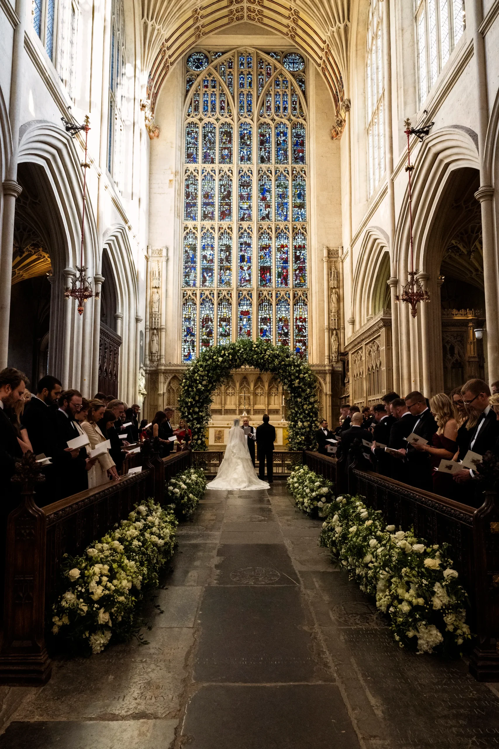 Toen Holly Ramsay en haar verloofde, de Olympische zwemmer Adam Peaty, de 13e-eeuwse Bath Abbey als locatie voor hun bruiloft kozen, wist de bruid dat ze een jurk nodig had die paste bij de gotische pracht en praal van de kerk. “Het gangpad van de abdij is 65 meter lang”, zegt Holly, wier vader de met een Michelinster bekroonde chef-kok en restauranthouder Gordon Ramsay is. “Het is zo groots en zo mooi… Ik wist dat ik iets langs nodig had!”