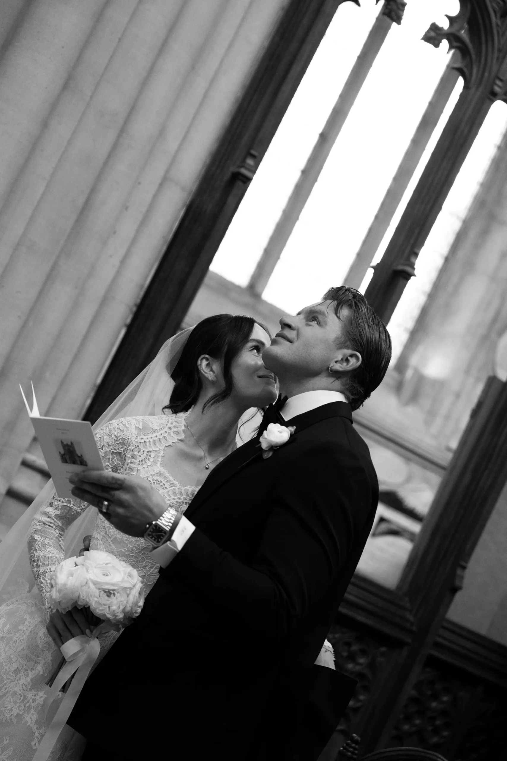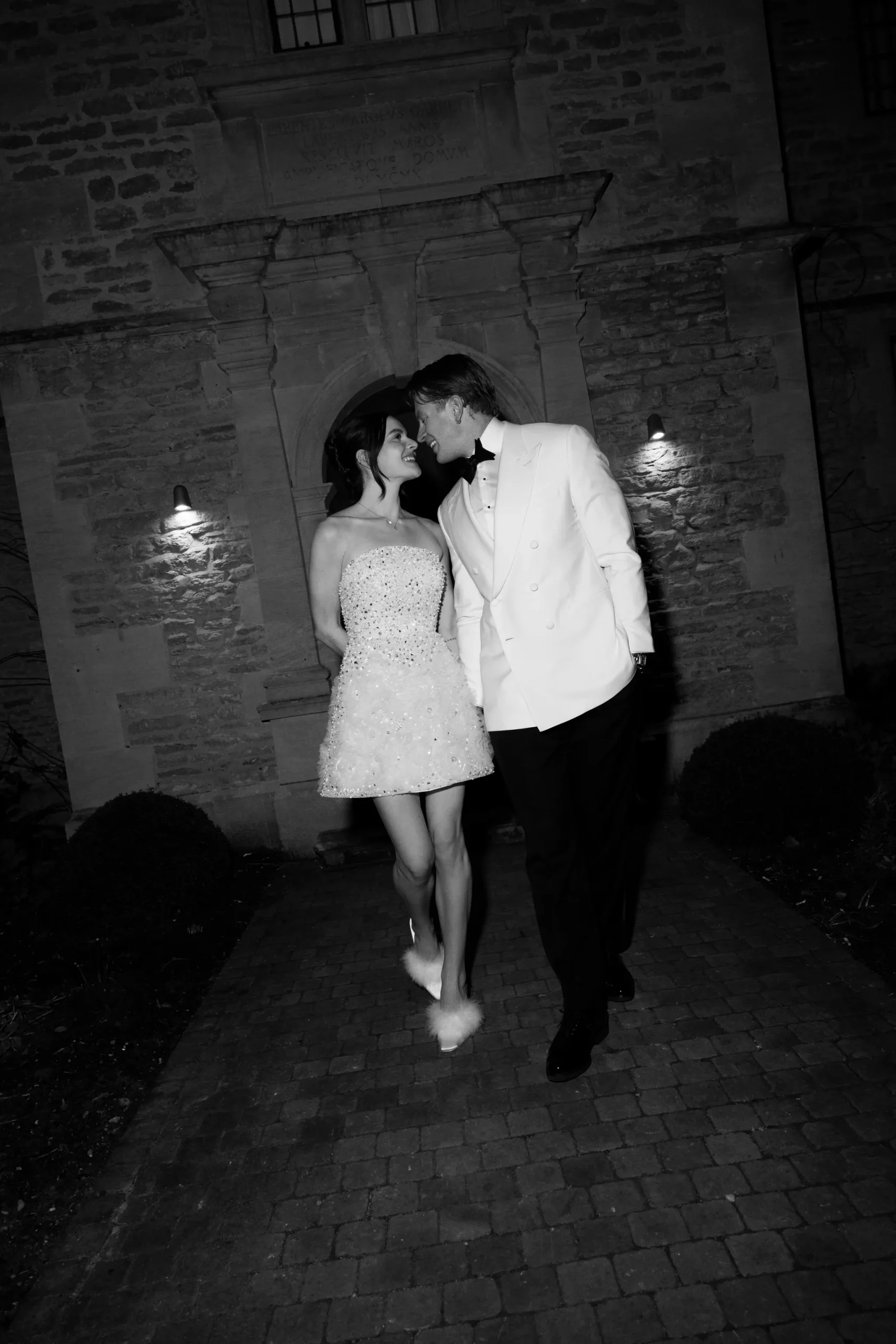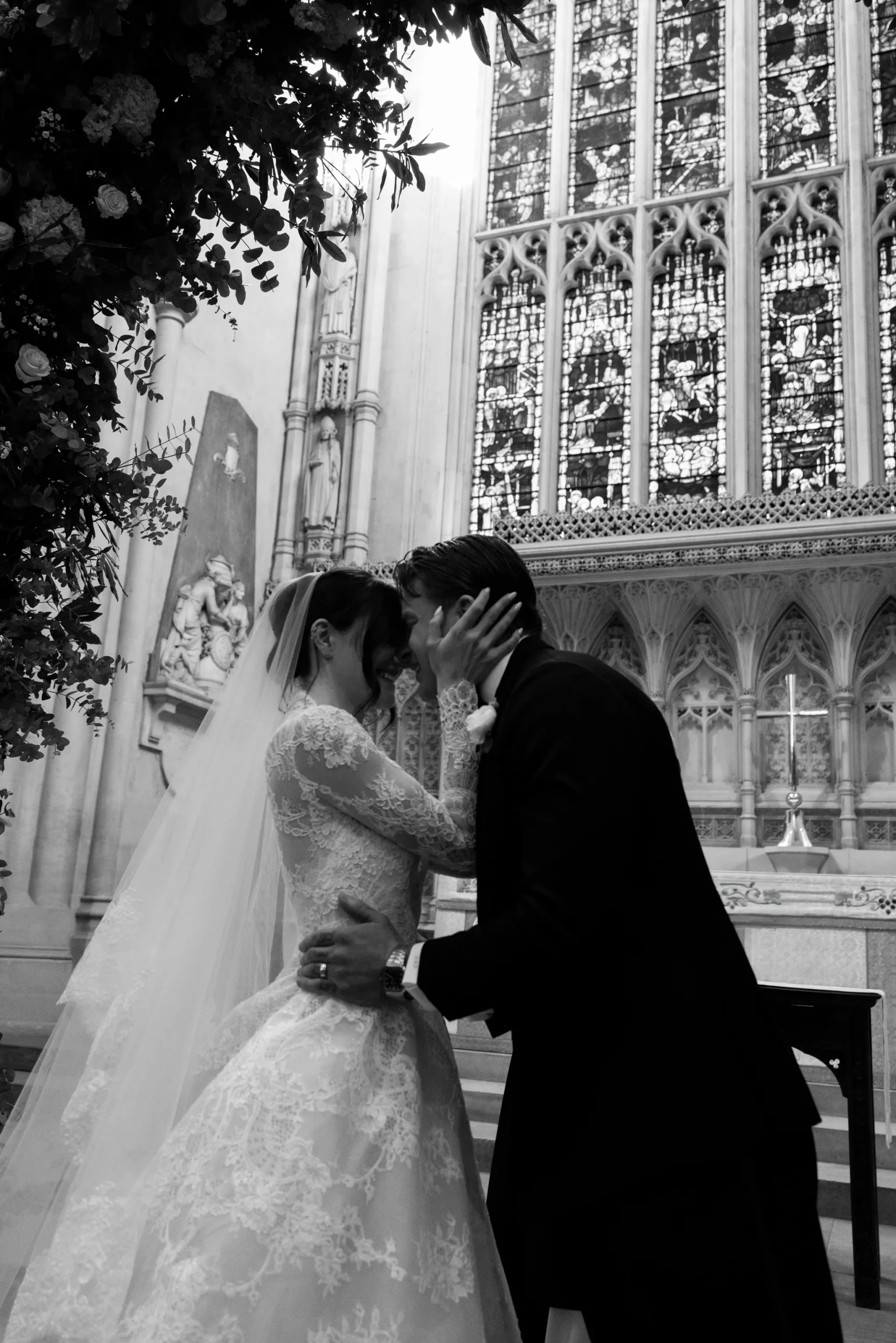 Op het moment dat ze zich in de spiegel omdraaide met de Elie Saab aan, was ze “helemaal weg van de jurk”, zegt ze glimlachend. “Ik voel me er heel prinsesachtig in.” Met een kanten sluier, hakken van Amina Muaddi (“een kerstcadeau van Adam vorig jaar”) en een schelpvormige minaudière van Chanel (een limited edition uit 2016 die de bruid online had weten te vinden) waren alle elementen voor een schitterende entree in de abdij aanwezig.