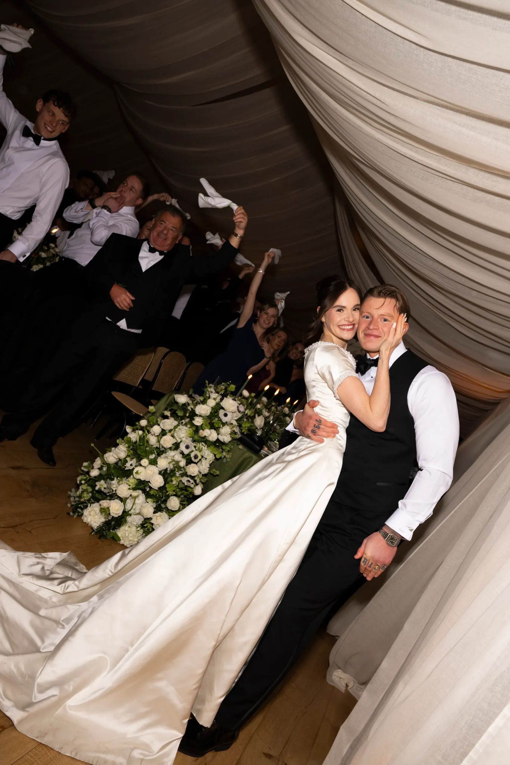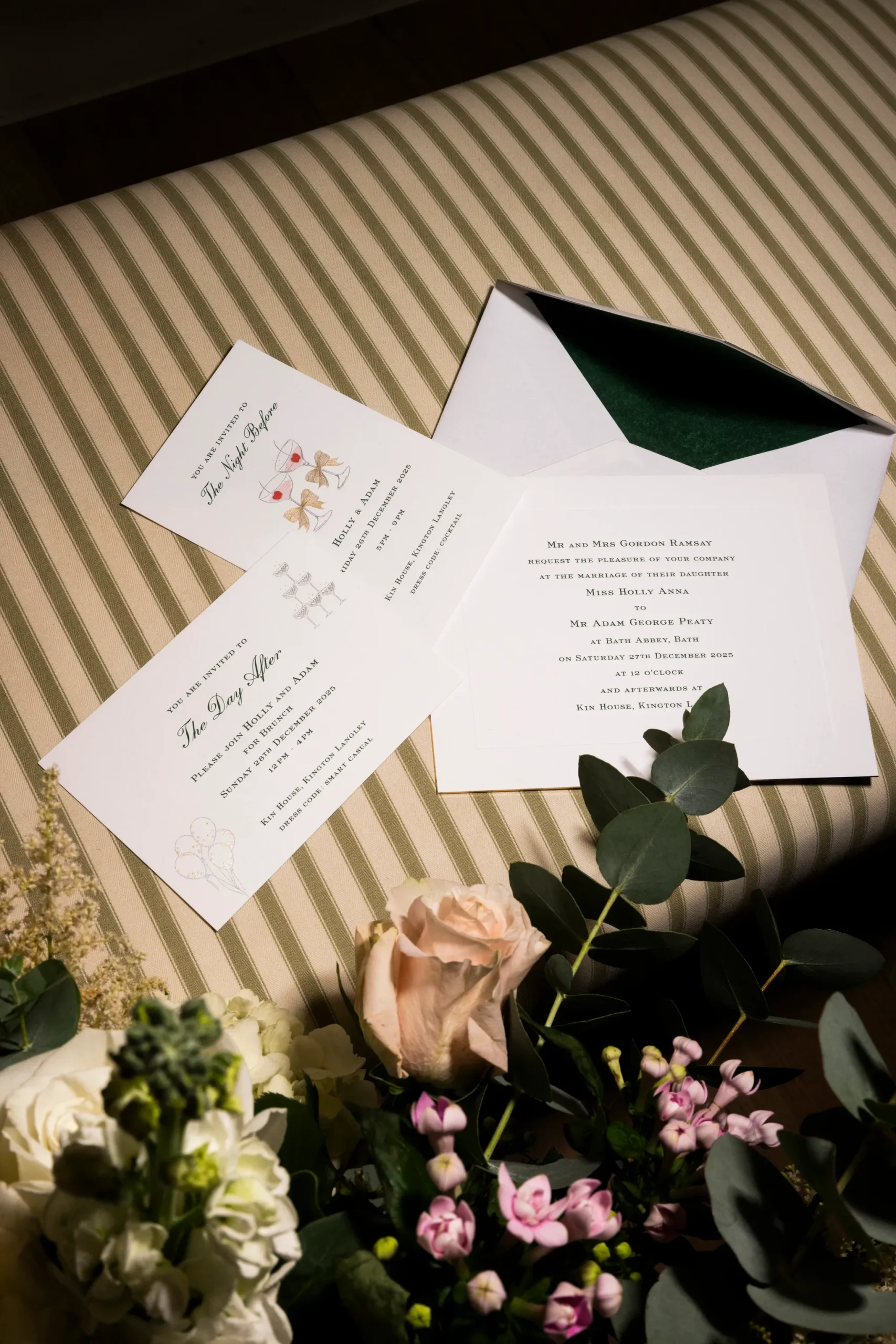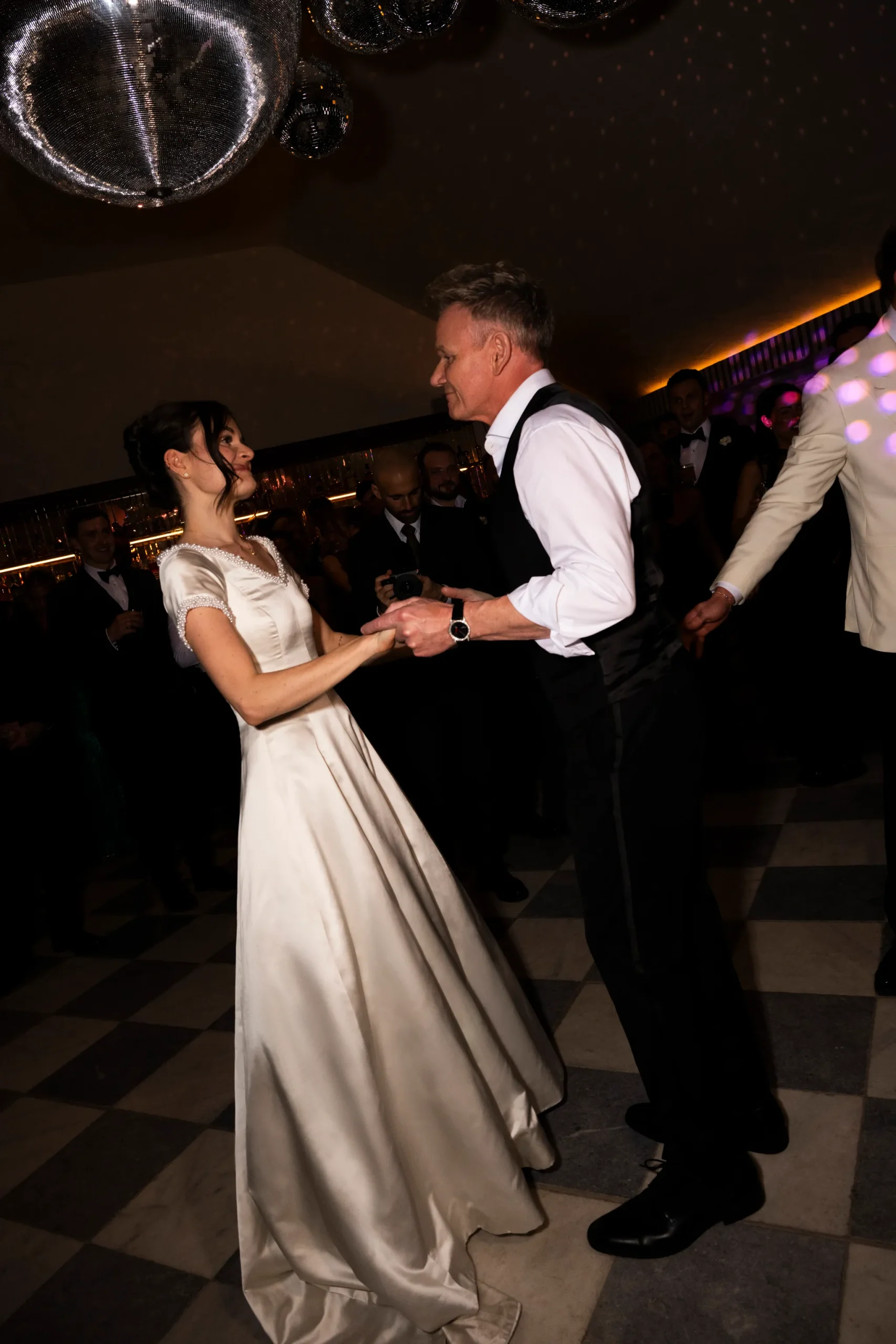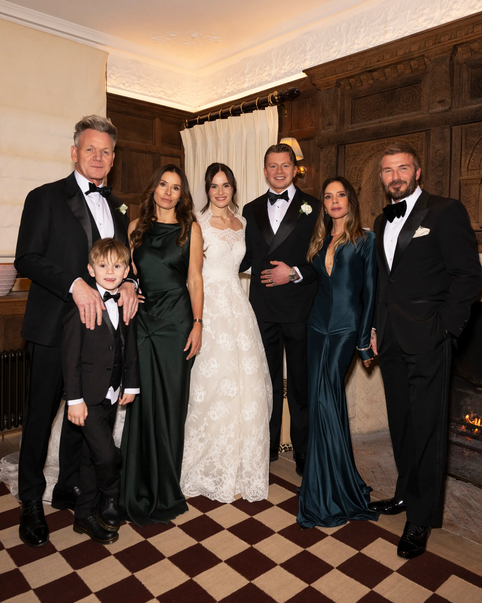 Tegenwoordig betekent een bruiloft natuurlijk zelden één jurk – ook voor Holly Ramsay. “Mijn ouders zouden het geweldig vinden als ik één look zou dragen”, grapt de bruid, “maar ik doe twee wissels.” Naast nog een jurk van Elie Saab (dit keer “kort en leuk”) voor het late feest in het chique Kin House, koos Holly een heel speciale jurk voor de eerste dans: de trouwjurk van haar moeder uit 1996. “Ik heb altijd al het idee gehad om op een gegeven moment de jurk van mijn moeder te dragen”, zegt ze. “Hij is prachtig: zijde met een V-halslijn en parels. Ik heb hem gepast en hij paste me perfect – hij hoefde niet aangepast te worden.” De moeder van de bruid zat “op de Peloton toen ik hem haar liet zien”, herinnert Holly zich lachend. Toch waren er tranen van geluk.