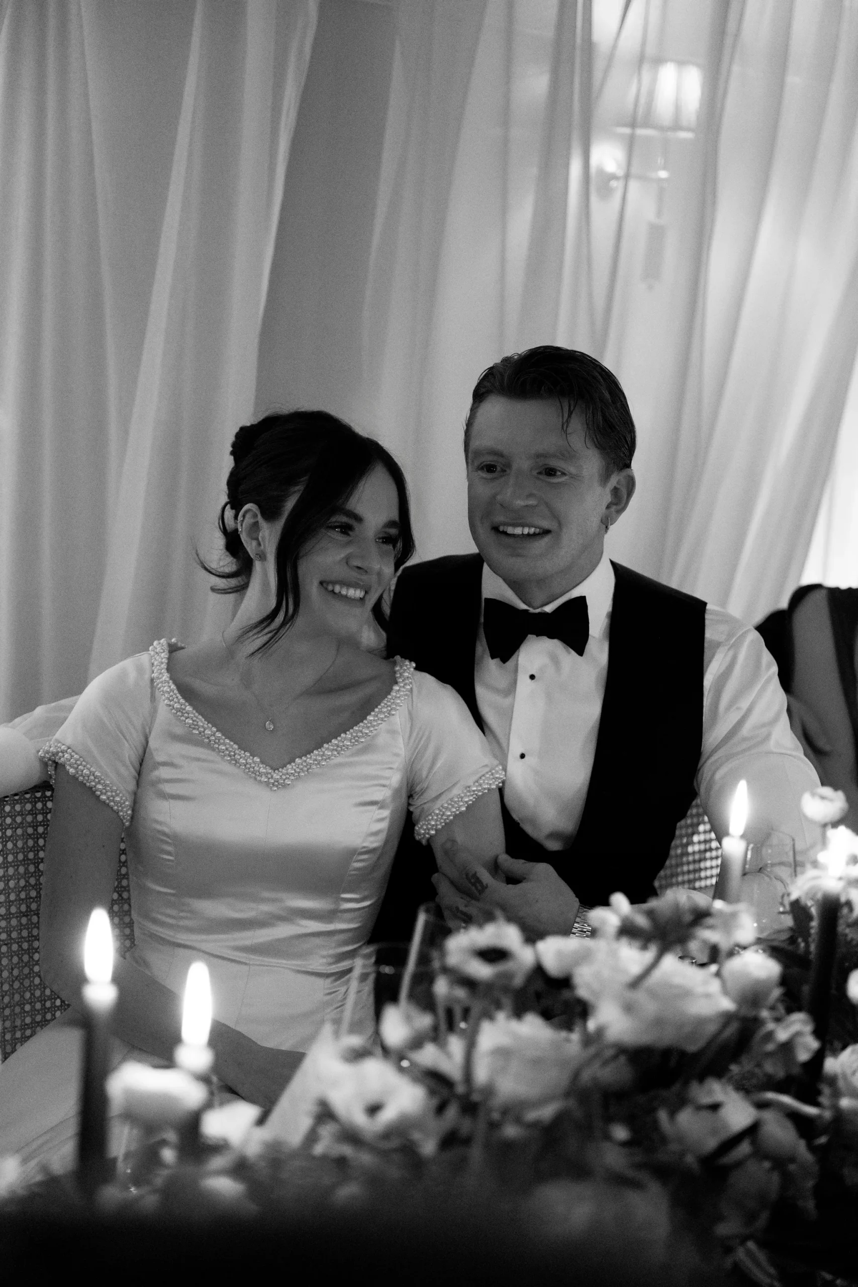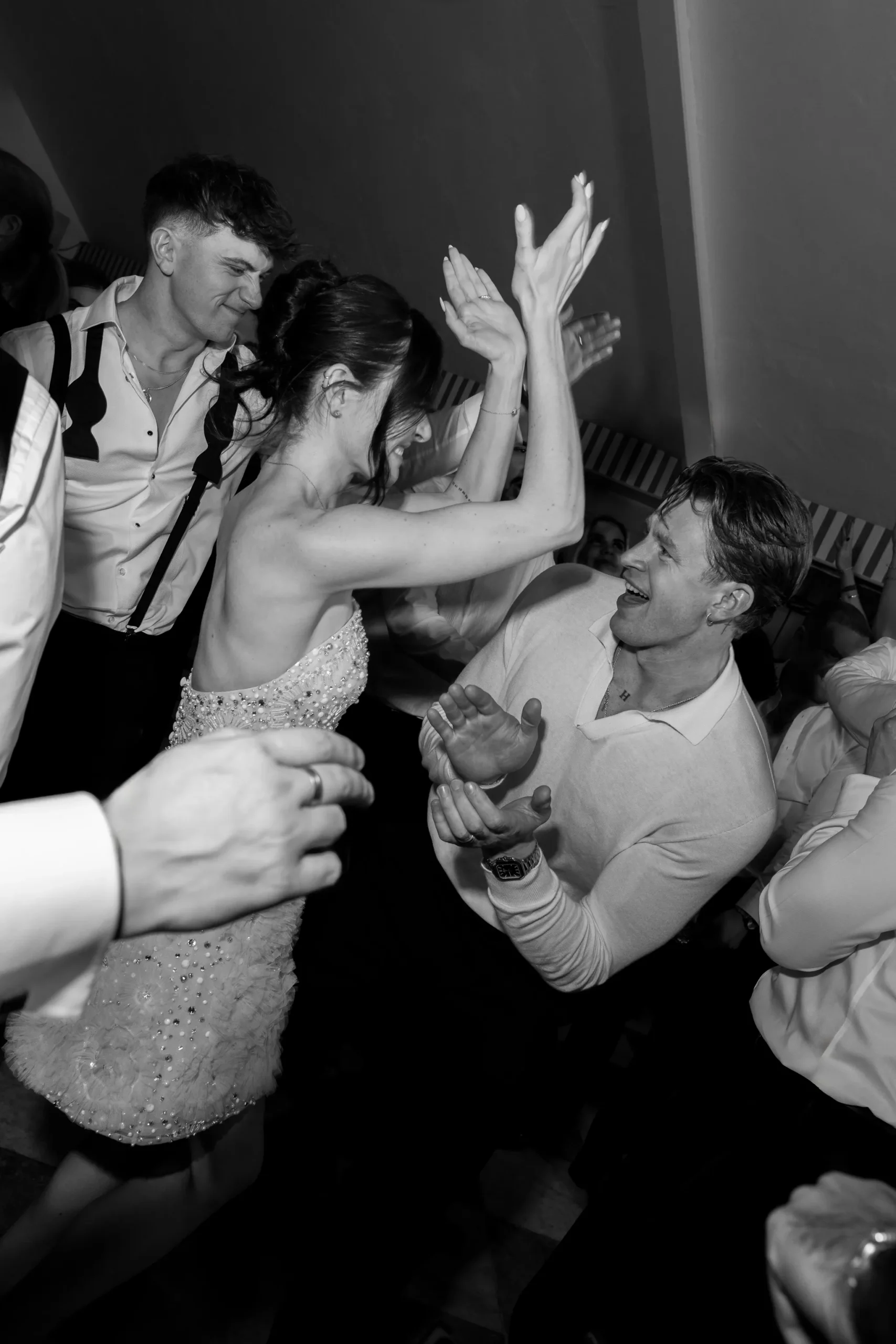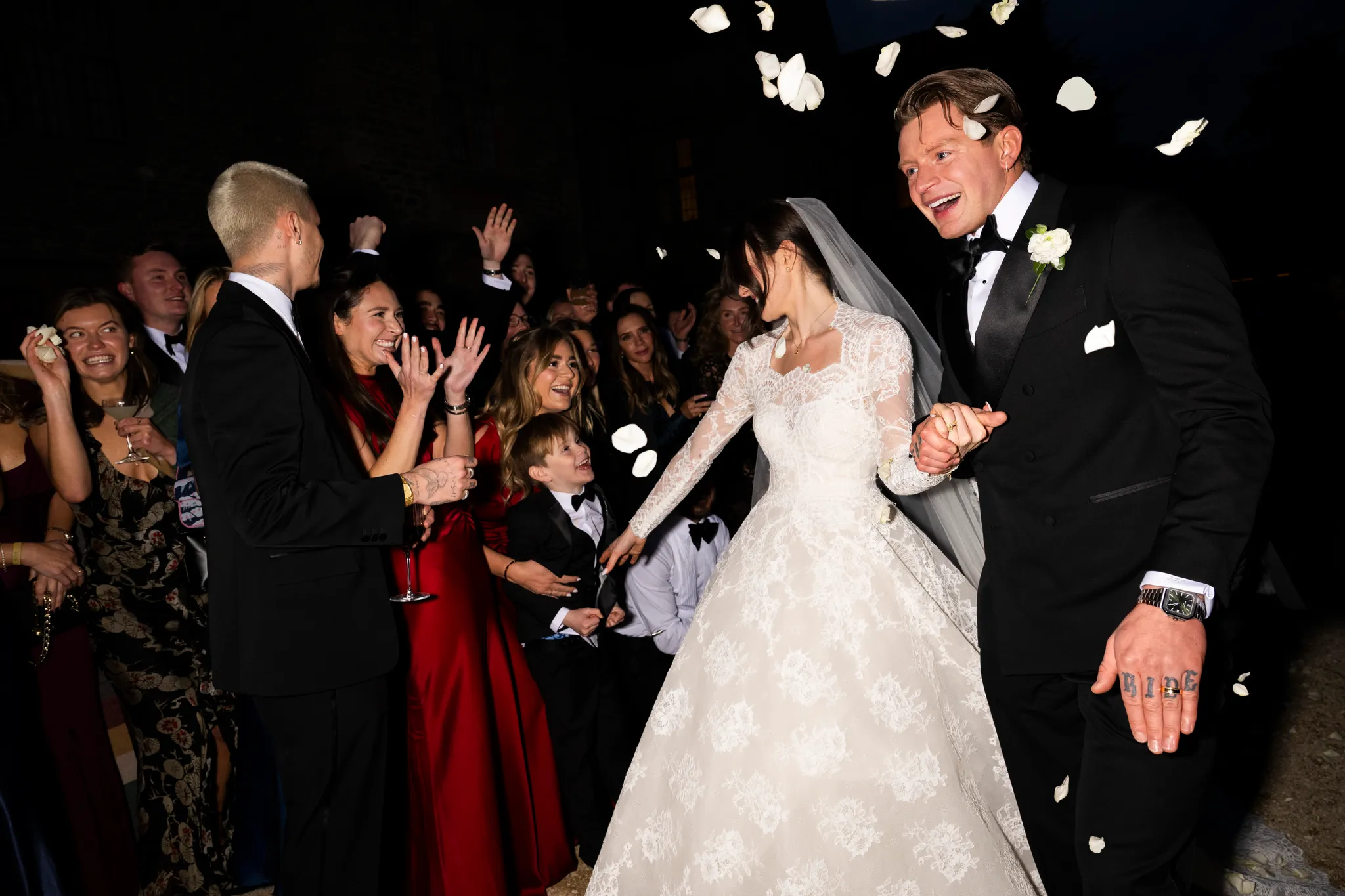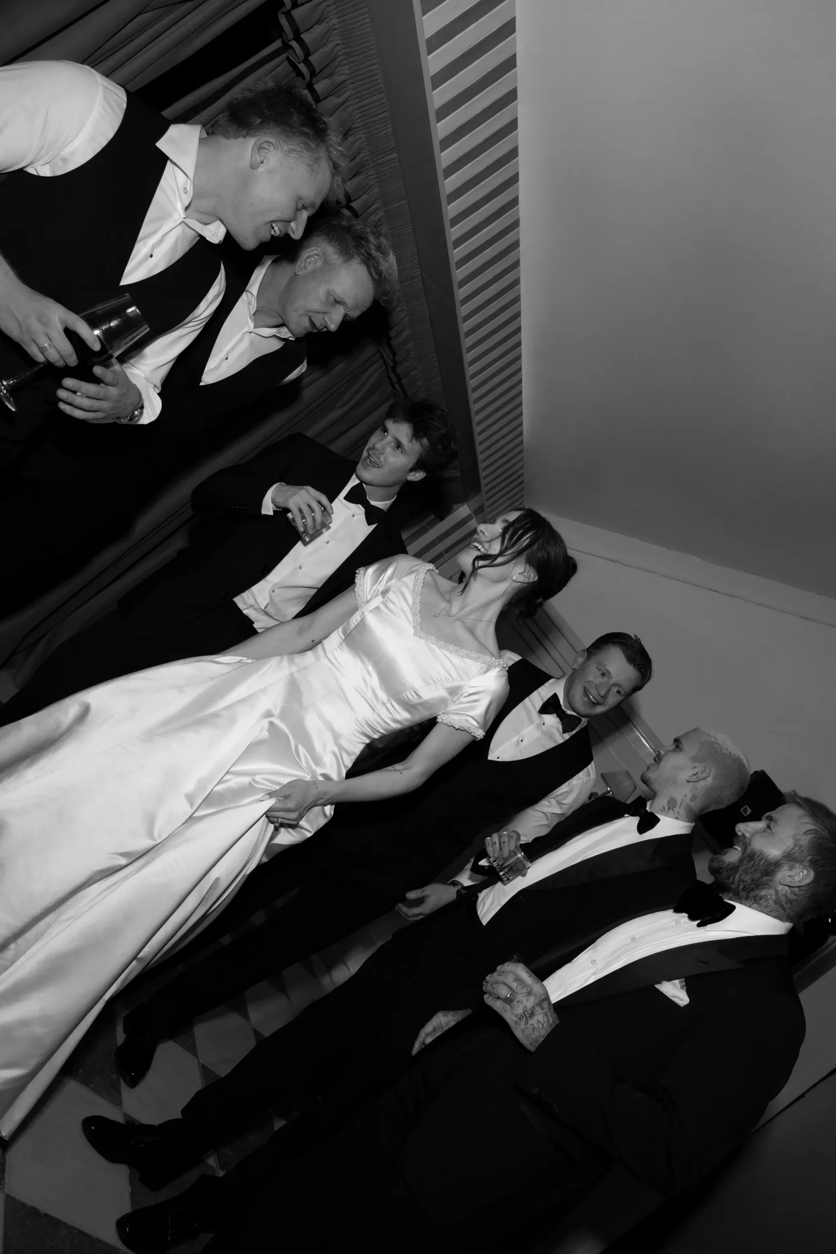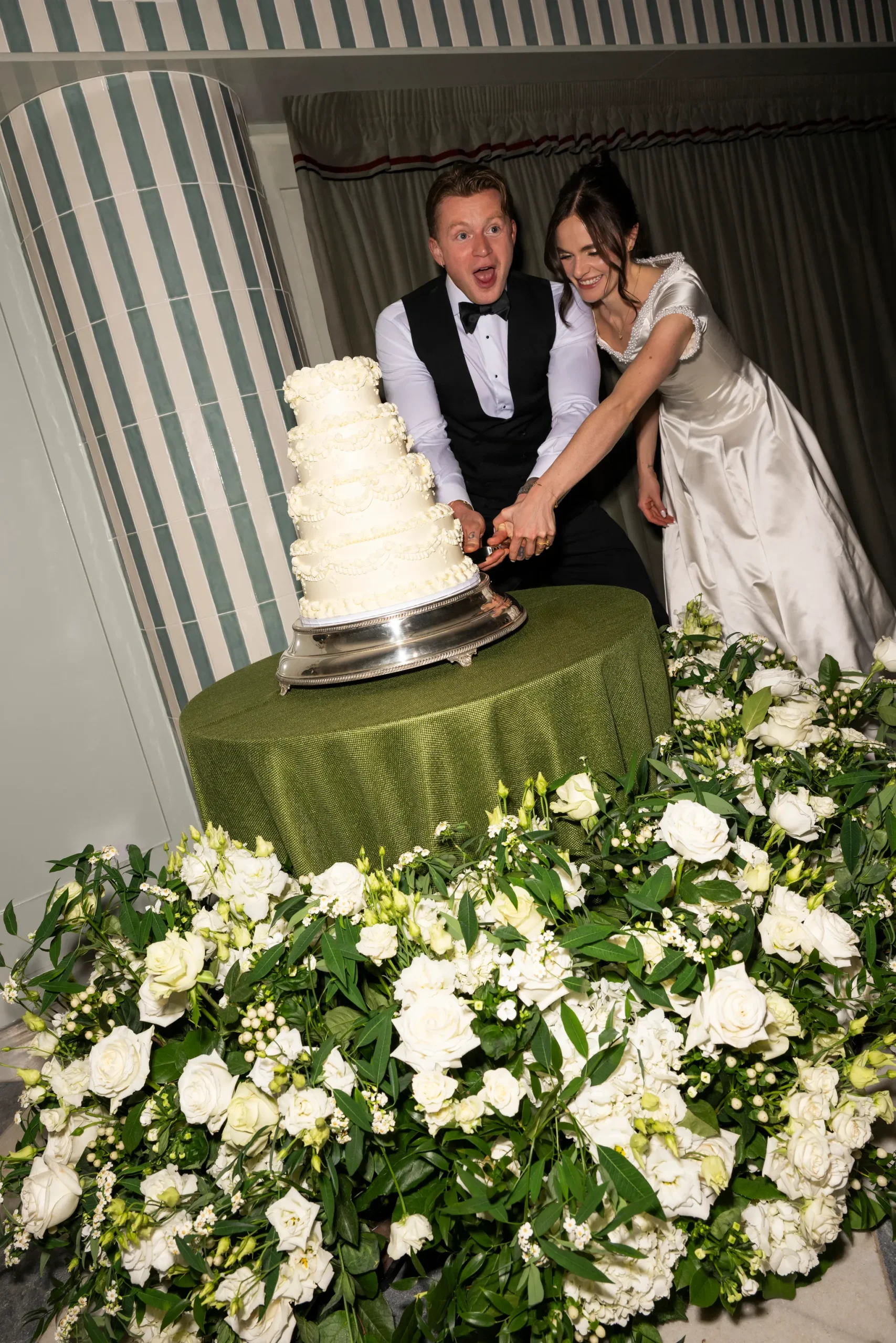 Tegenwoordig betekent een bruiloft natuurlijk zelden één jurk – ook voor Holly Ramsay. “Mijn ouders zouden het geweldig vinden als ik één look zou dragen”, grapt de bruid, “maar ik doe twee wissels.” Naast nog een jurk van Elie Saab (dit keer “kort en leuk”) voor het late feest in het chique Kin House, koos Holly een heel speciale jurk voor de eerste dans: de trouwjurk van haar moeder uit 1996. “Ik heb altijd al het idee gehad om op een gegeven moment de jurk van mijn moeder te dragen”, zegt ze. “Hij is prachtig: zijde met een V-halslijn en parels. Ik heb hem gepast en hij paste me perfect – hij hoefde niet aangepast te worden.” De moeder van de bruid zat “op de Peloton toen ik hem haar liet zien”, herinnert Holly zich lachend. Toch waren er tranen van geluk.