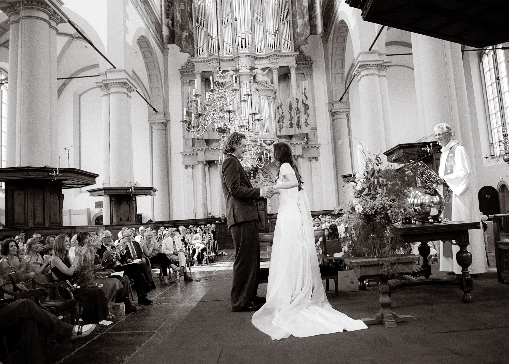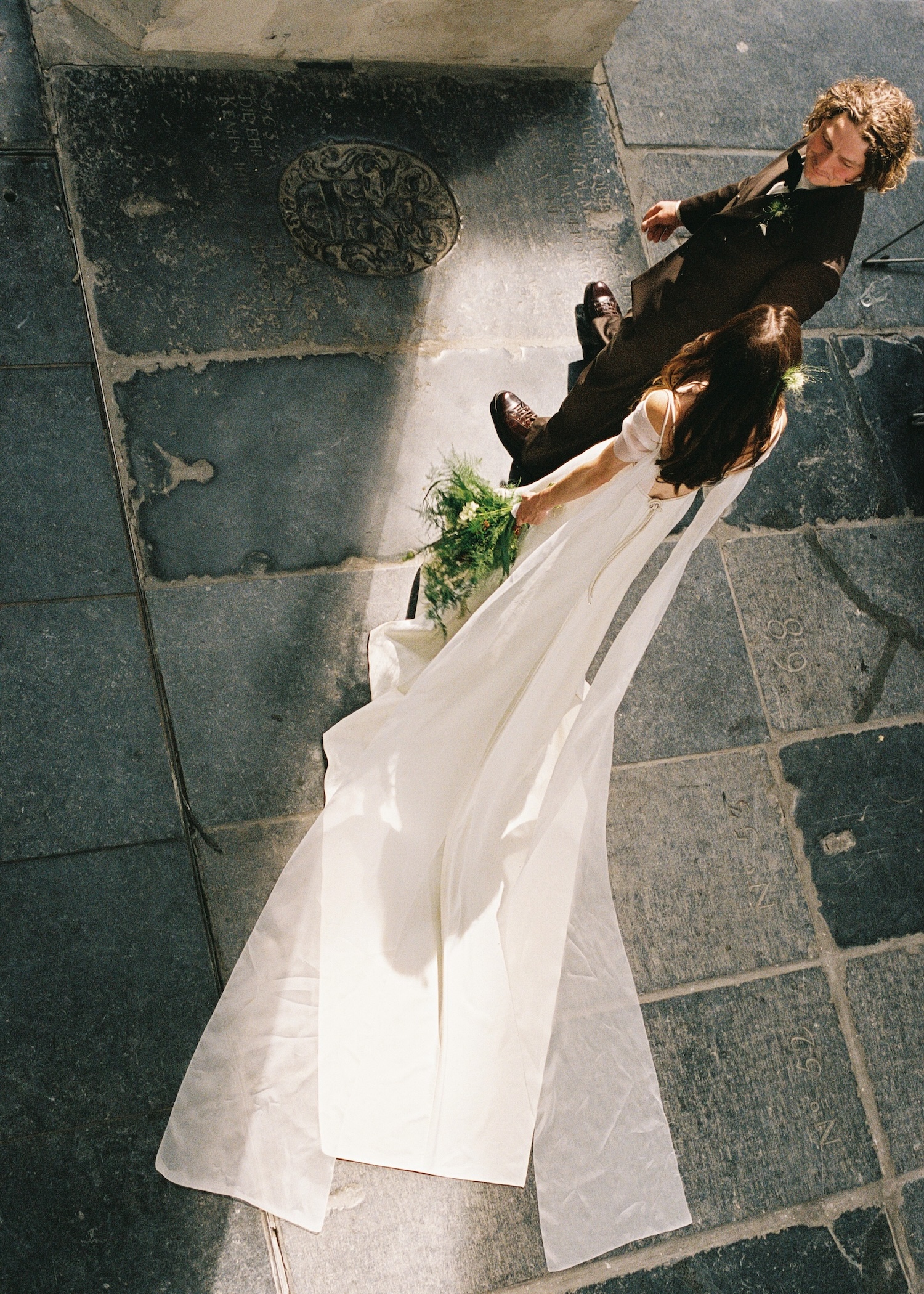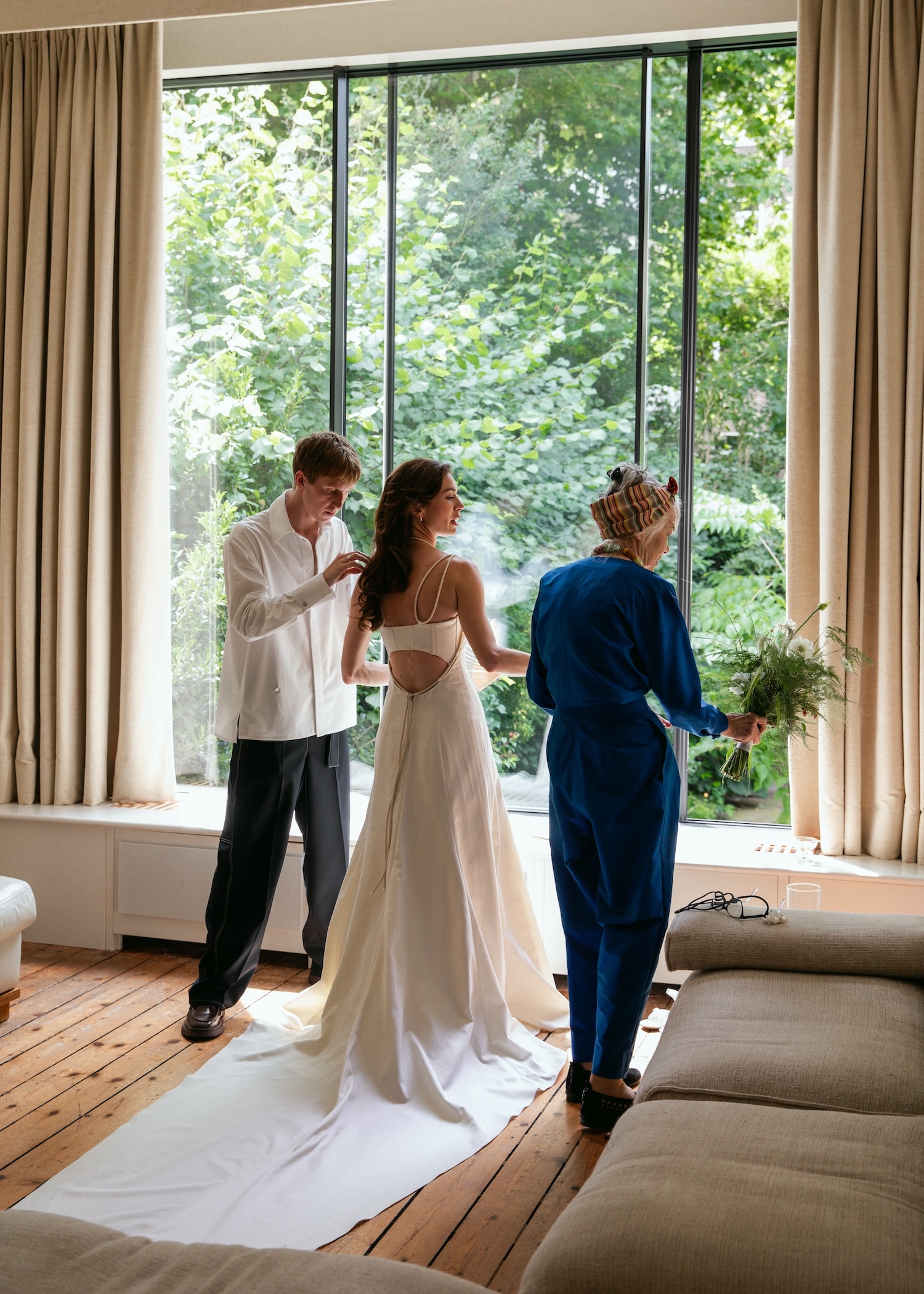 Galeriehouder en special project director Anna Kinneir en designer Johannes Offerhaus trouwden afgelopen zomer in hun thuisstad Amsterdam. Voor de bruiloft droegen zowel de bruid als de bruidegom looks van het Nederlandse modelabel Martan, hoewel het nooit de bedoeling was geweest dat Johannes ook Martan zou dragen. “Het team van Martan sprong bij en redde de dag door zijn pak in slechts drie dagen voor de bruiloft helemaal opnieuw te maken.”