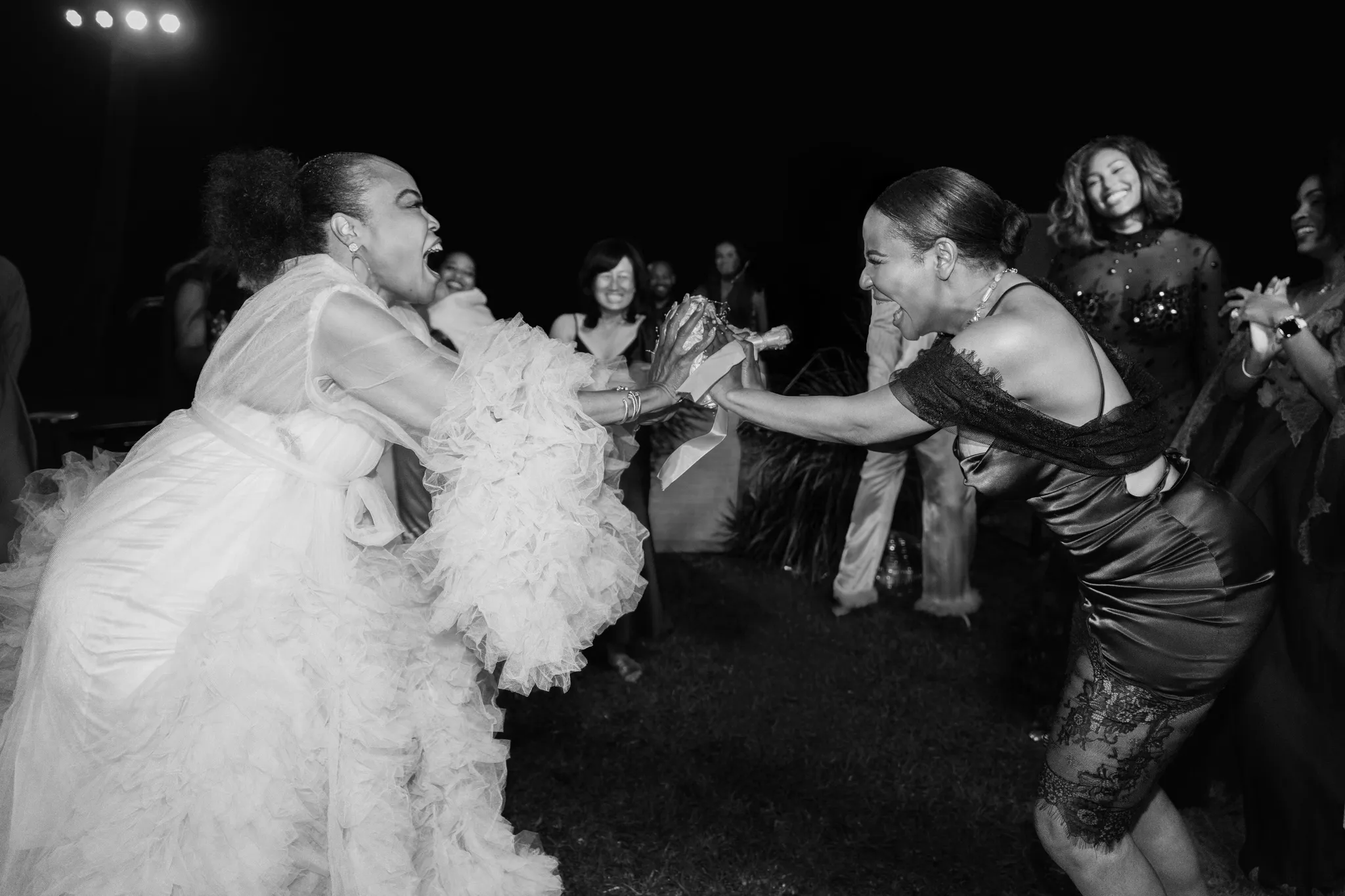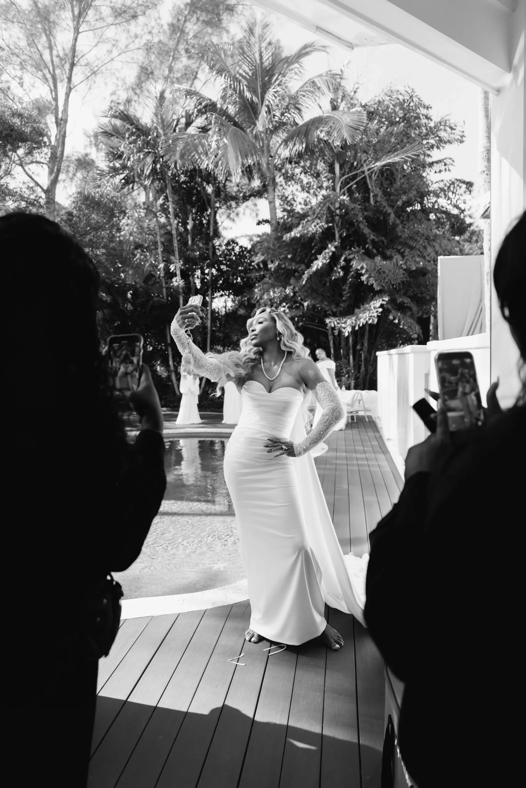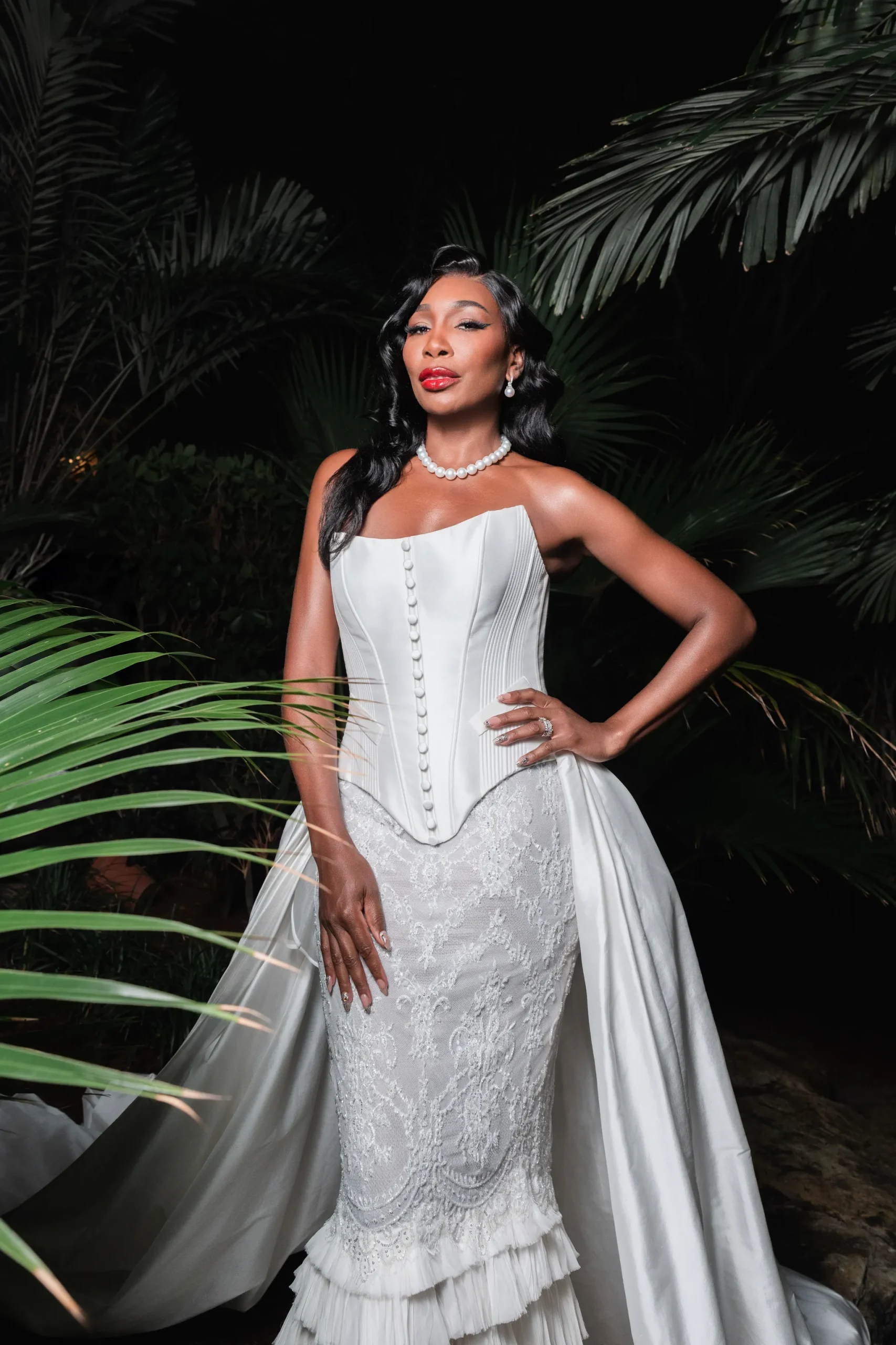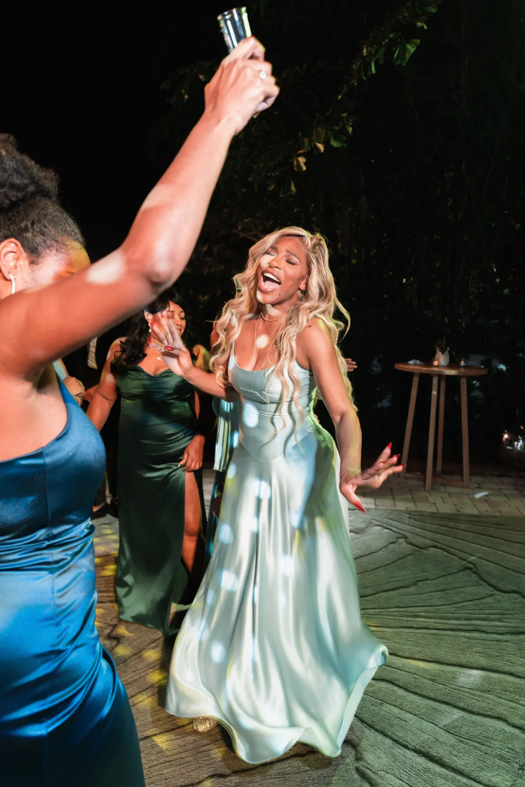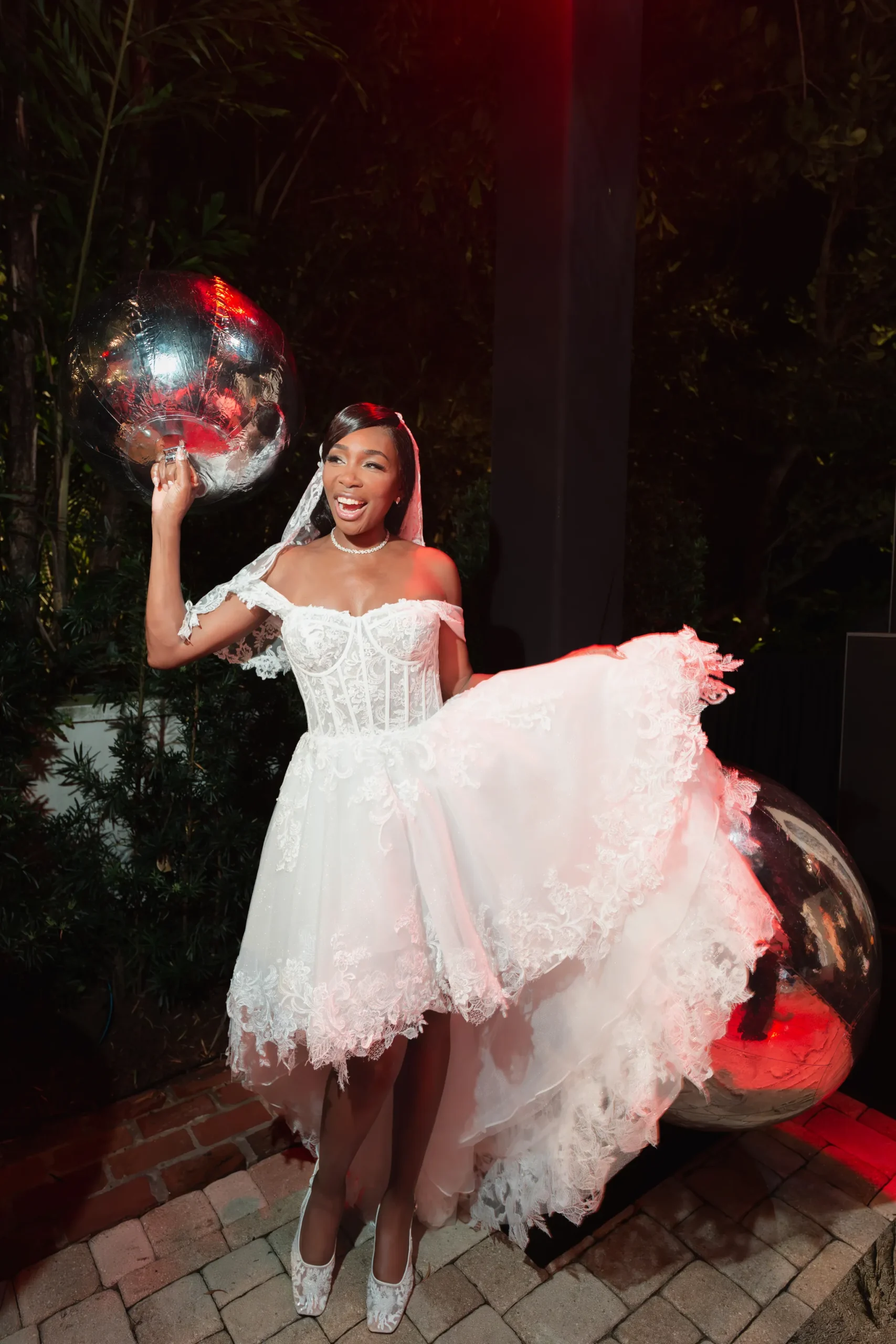 Venus had geen tijd om de Bridal Fashion Week bij te wonen vanwege haar intensieve trainingsschema. “Dus ik heb het via Instagram gevolgd”, zegt Venus. “Ik zat op Stories en keek naar alles. Het voelde alsof ik op de eerste rij zat.” Na een Aziatisch fusiondiner besloten Venus en haar bruidsmeisjes alleen maar te dansen, met name op Beyoncé. “We lieten allemaal onze innerlijke Beyoncé zien”, zegt Venus. “Iedereen moest een nummer kiezen en we deden een lipsync-wedstrijd.” (Serena droeg voor de gelegenheid zelfs Beyoncé’s outfit uit haar videoclip voor Sorry.)