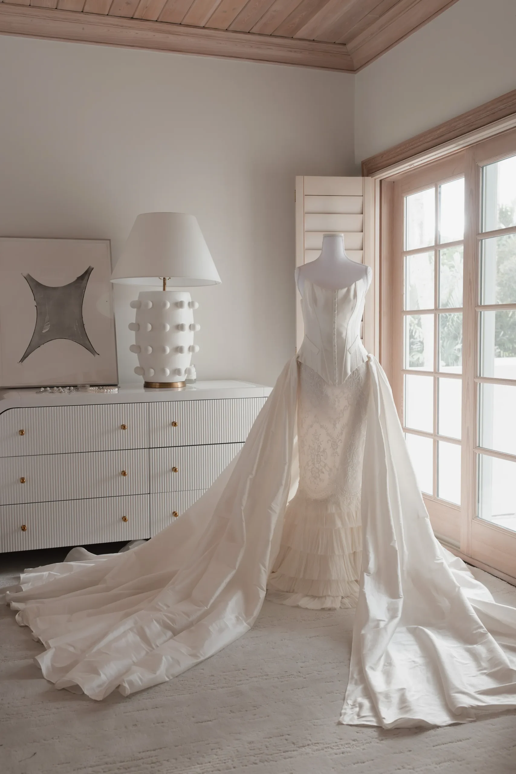 Ze wilde de jurk graag voor de bruiloft passen, maar er was geen proefmodel beschikbaar. “Ik was een dag in Parijs en zei: ‘Ik moet deze jurk passen.’ Het was tijdens de modeweek. Het was gekkenwerk, maar op de een of andere manier is het gelukt. Ik wilde dat mijn zus [Isha] kwam kijken, en toen ze dat deed, begon ze te huilen. Het was gewoon perfect. De manier waarop de jurk glinstert, de transparantie – het doet me denken aan de oceaan en de zee.”