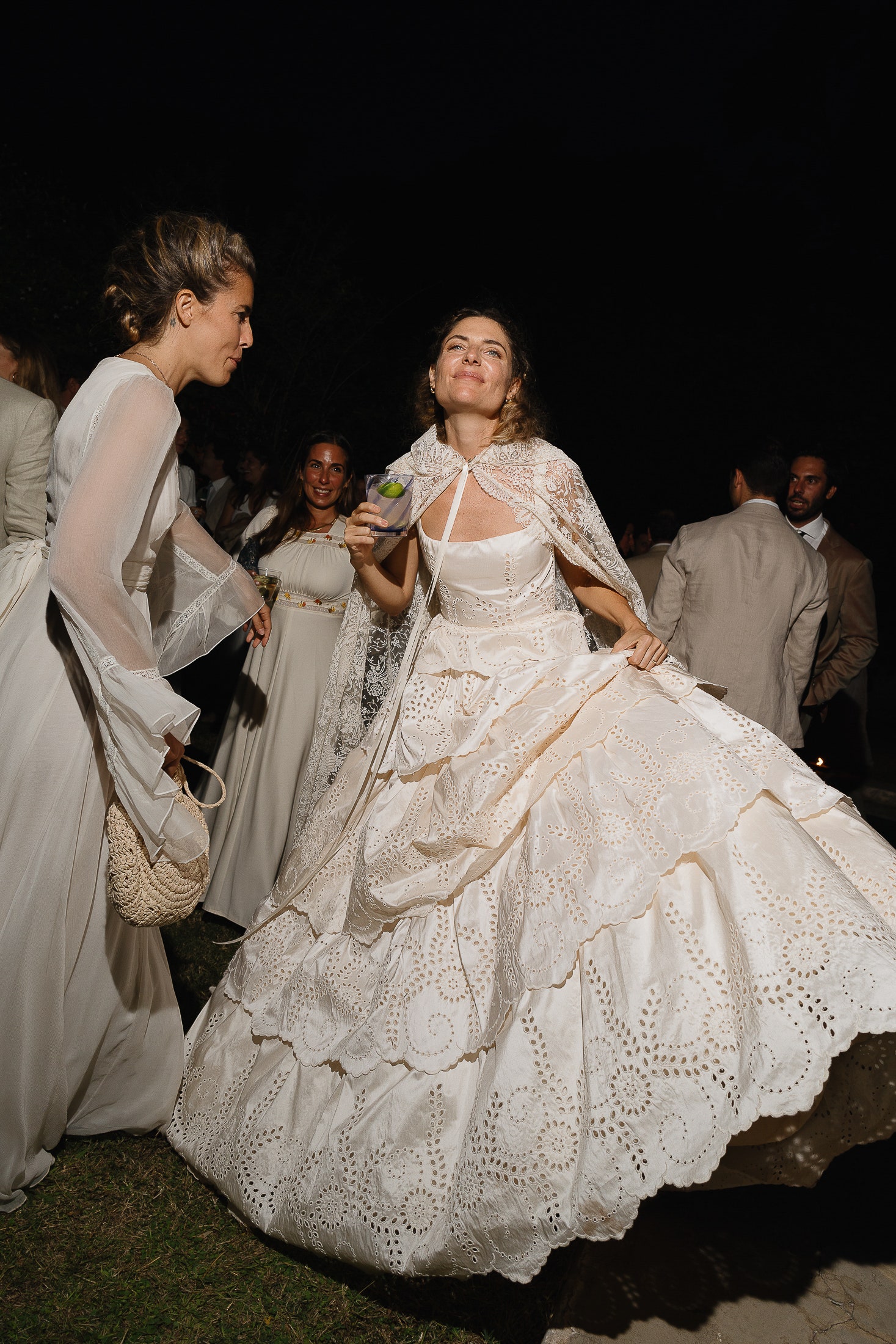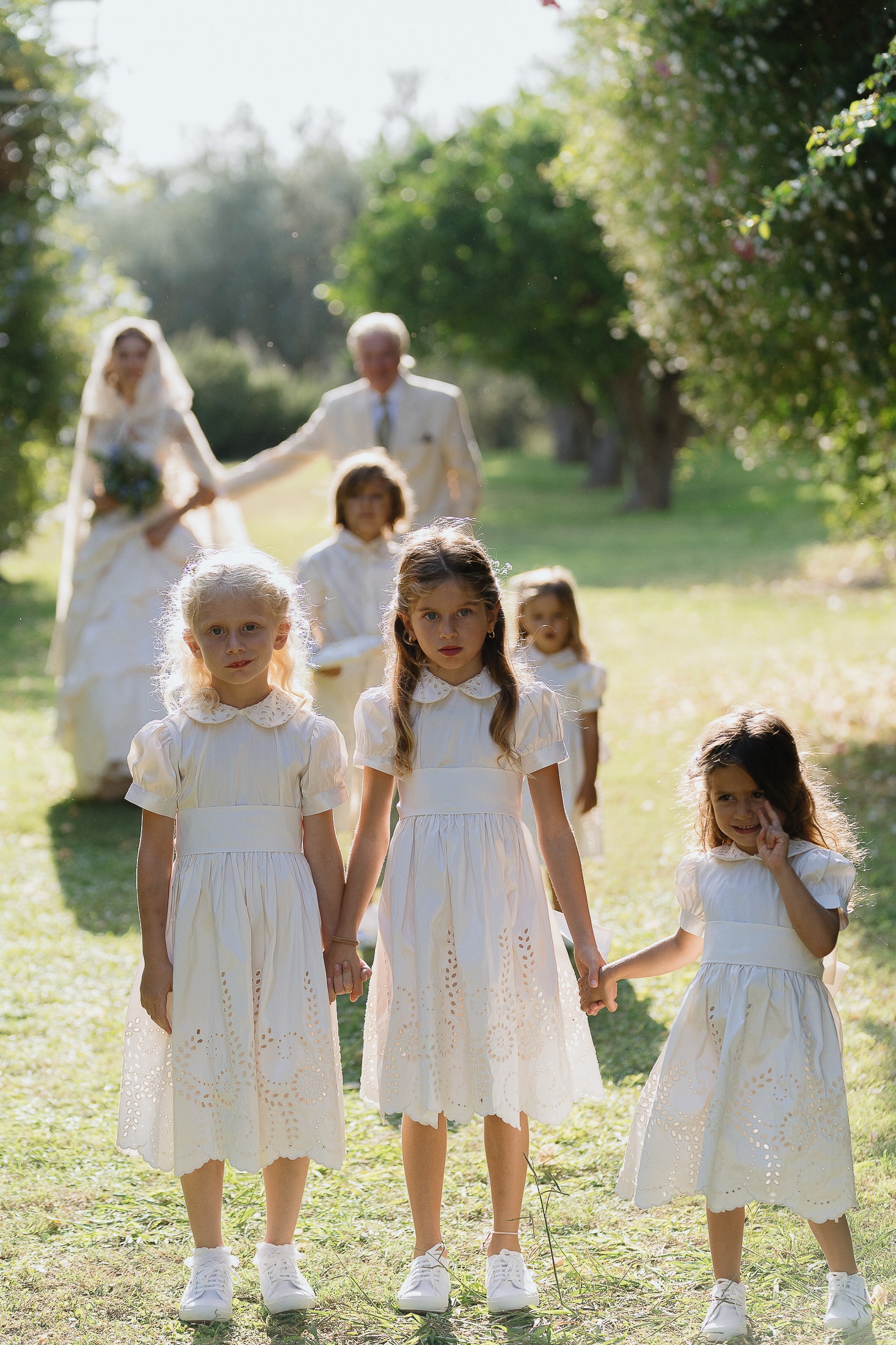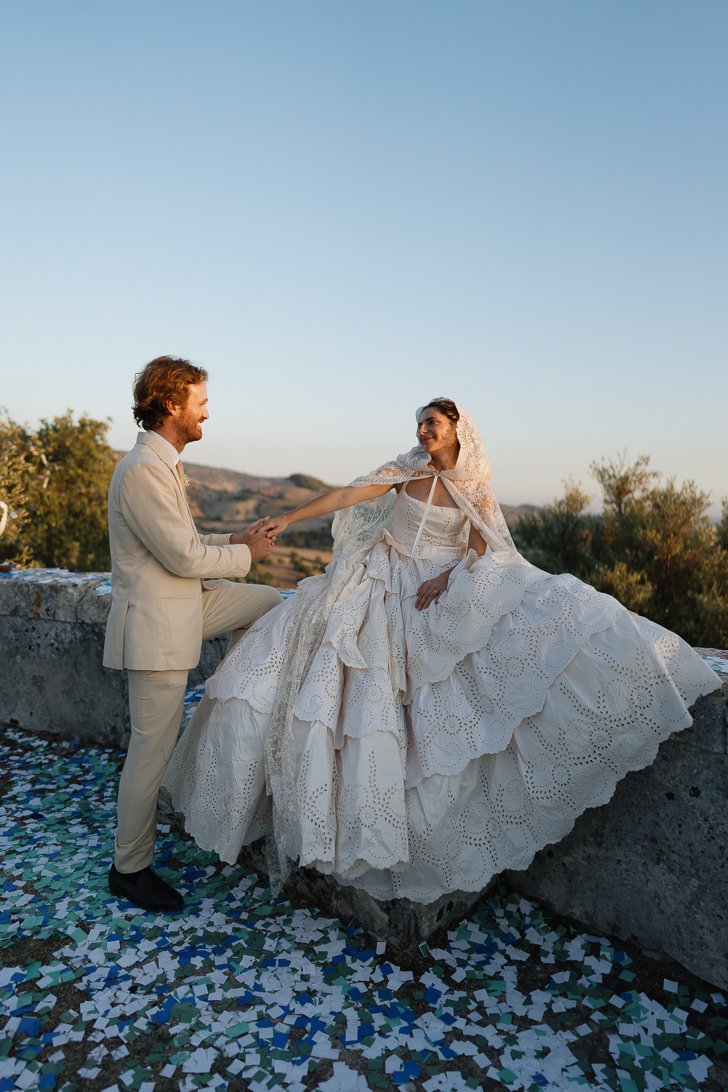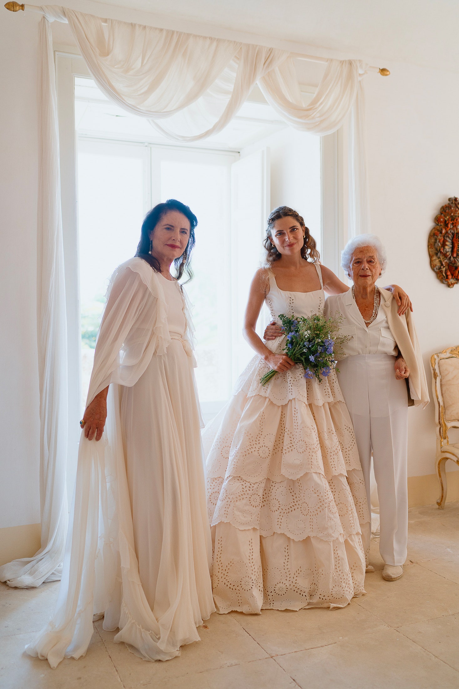 Het samenstellen van de bruidsgarderobe was ook een familieaangelegenheid. “Luisa Beccaria is het merk van mijn moeder en mijn favoriet”, zegt Lucrezia. “Naast mode en lifestyle maakt het merk ook prachtige bruidsjurken.” Omdat ze volledige toegang had tot het atelier, koos ze uiteindelijk zeven verschillende looks. Haar belangrijkste trouwjurk was echter een eigen creatie. “Mijn ceremoniejurk is ontstaan uit een idee dat ik in mijn hoofd had. Dit is vervolgens geïnterpreteerd door mijn zus, die de stof vond waar ik van droomde, en mijn moeder met haar jarenlange ervaring in haute couture. Ik vind echt dat het een kunstwerk is geworden.”