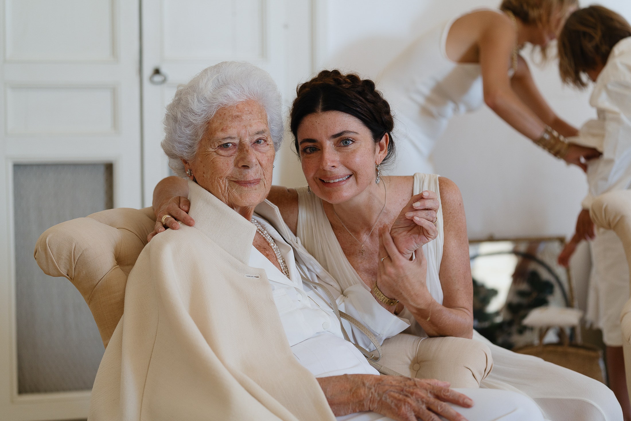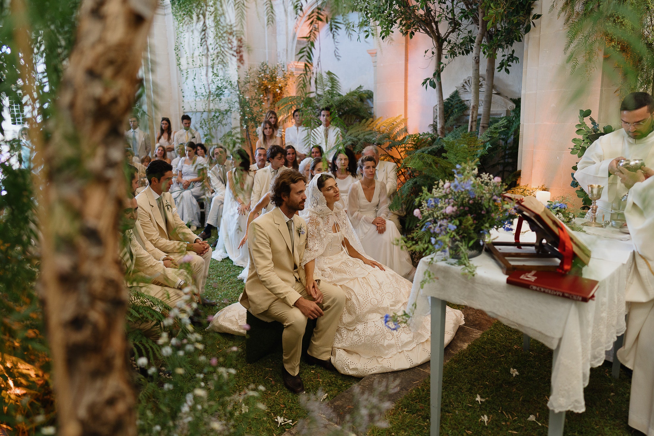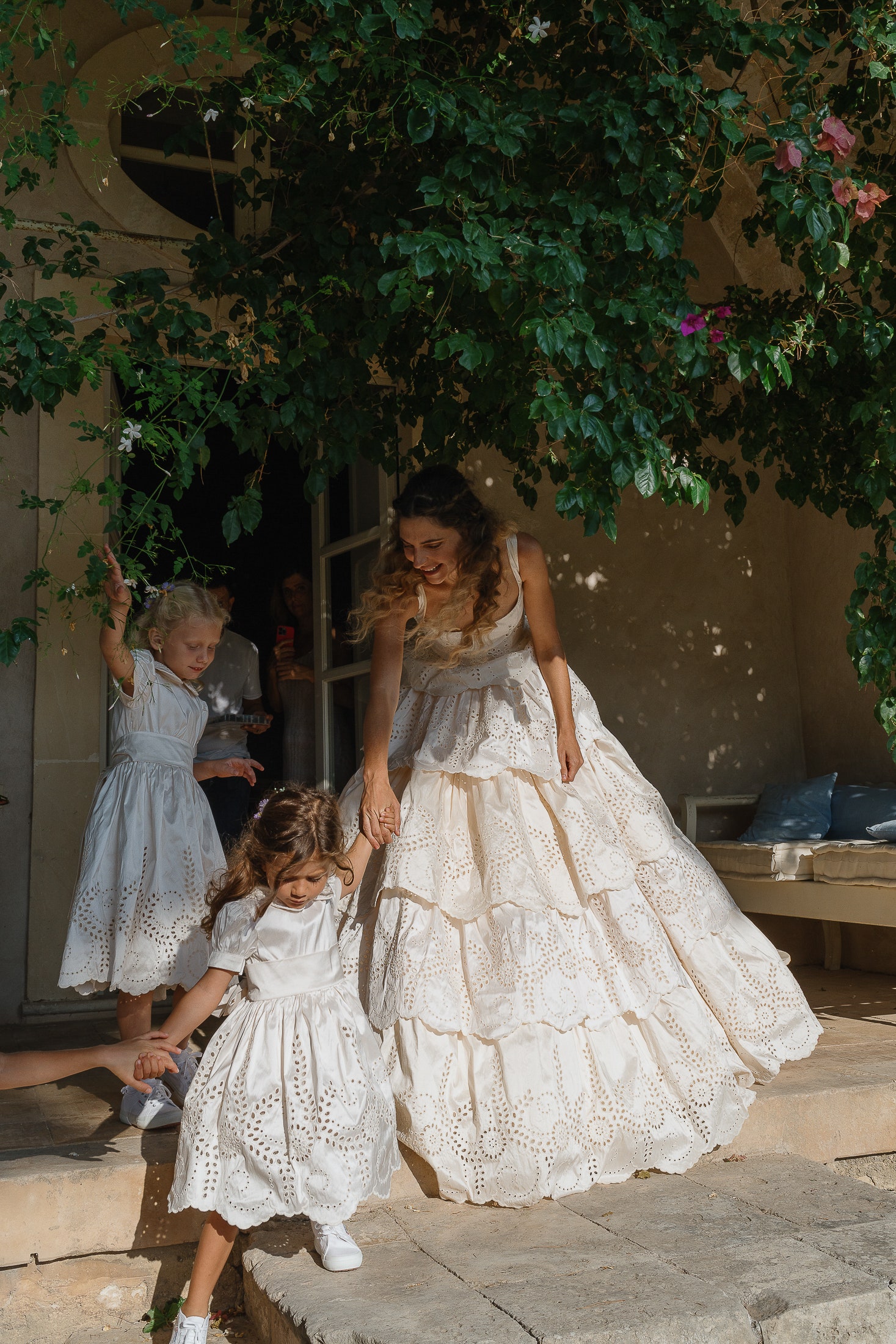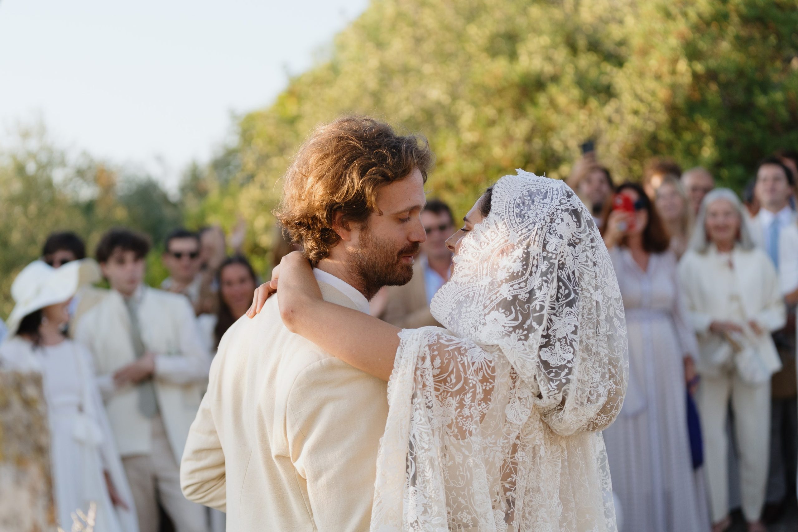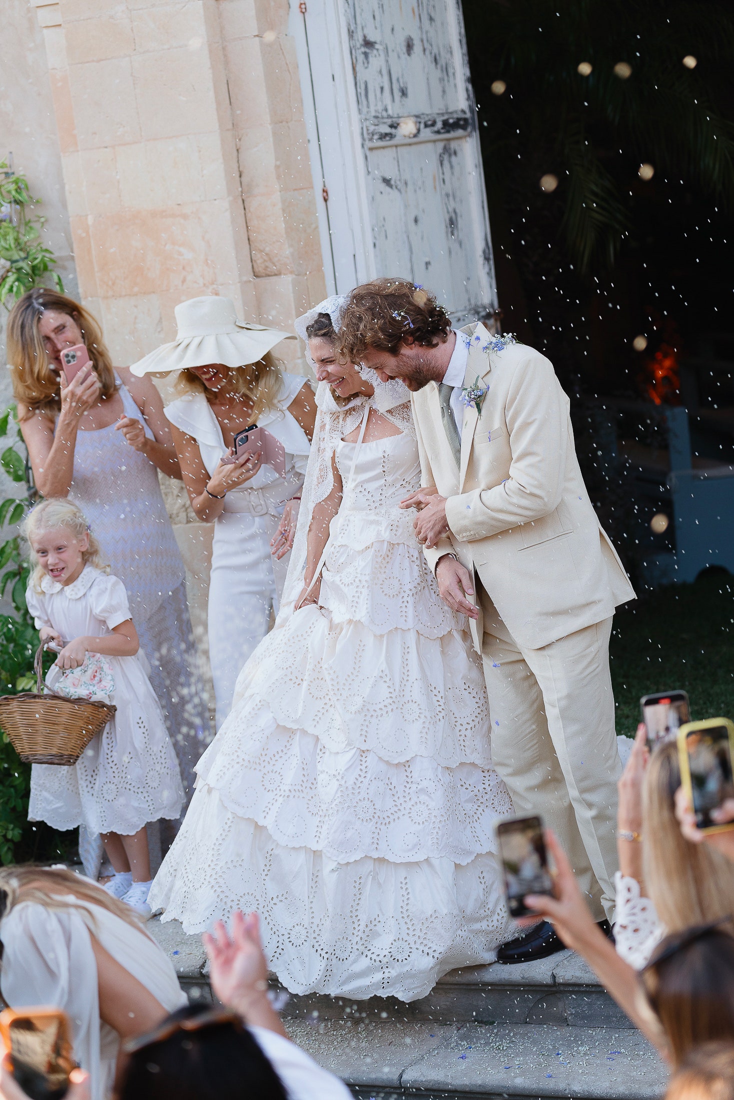 Het samenstellen van de bruidsgarderobe was ook een familieaangelegenheid. “Luisa Beccaria is het merk van mijn moeder en mijn favoriet”, zegt Lucrezia. “Naast mode en lifestyle maakt het merk ook prachtige bruidsjurken.” Omdat ze volledige toegang had tot het atelier, koos ze uiteindelijk zeven verschillende looks. Haar belangrijkste trouwjurk was echter een eigen creatie. “Mijn ceremoniejurk is ontstaan uit een idee dat ik in mijn hoofd had. Dit is vervolgens geïnterpreteerd door mijn zus, die de stof vond waar ik van droomde, en mijn moeder met haar jarenlange ervaring in haute couture. Ik vind echt dat het een kunstwerk is geworden.”