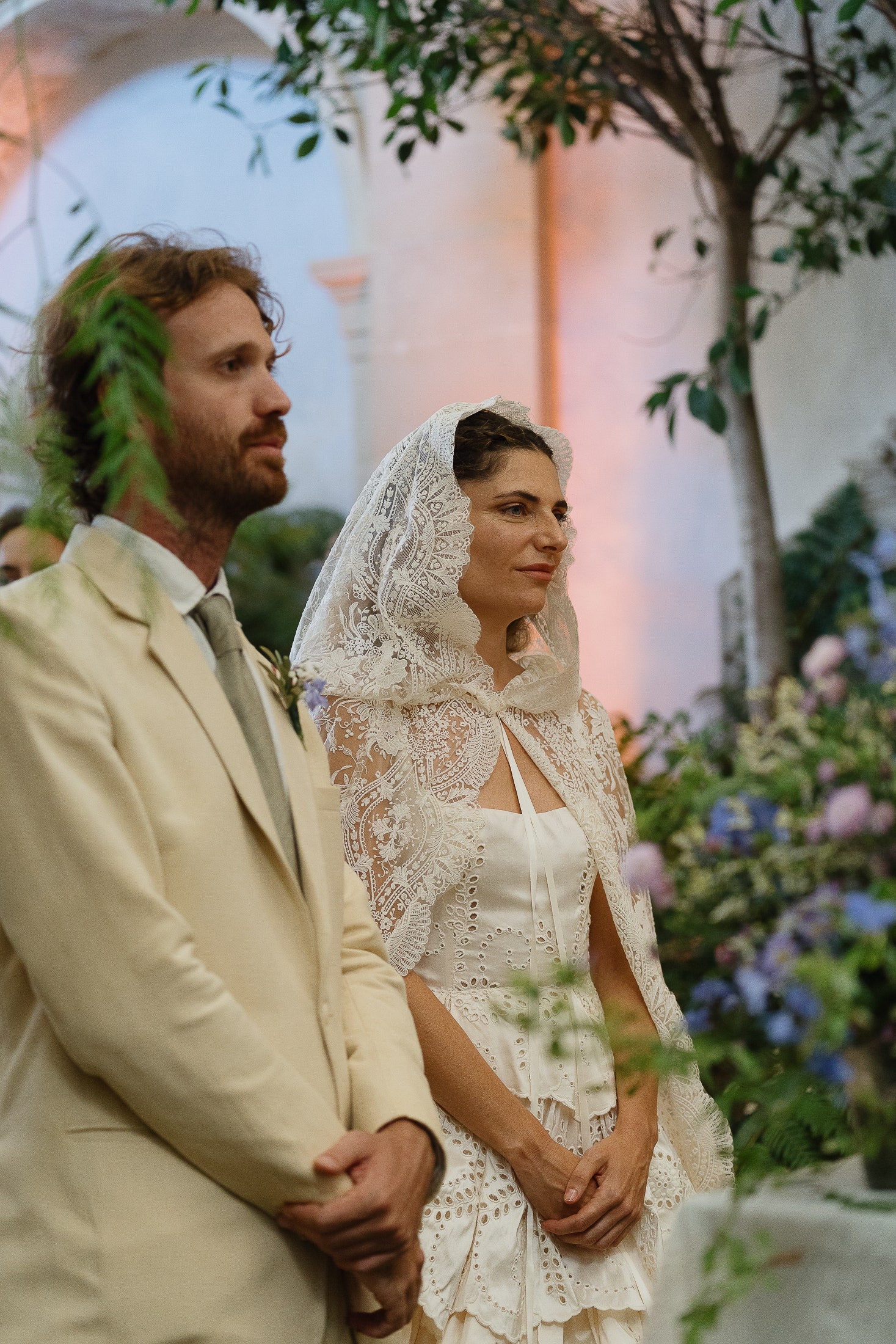 Voor het diner dat volgde op de ceremonie droeg Lucrezia een haute couture jurk uit 1995, gemaakt van fragiele tule met kanten inzetstukken. Giulio koos voor een crèmekleurig linnen pak dat hij liet maken toen hij op reis was in India. “Hij bracht uren door met een kleine kleermaker, Sipi uit Jaipur”, herinnert Lucrezia zich. “We lieten hem een traditionele Caraceni-foto zien en probeerden uit te leggen dat we niet houden van strakke jasjes en strakke broeken zoals die tegenwoordig populair zijn.”