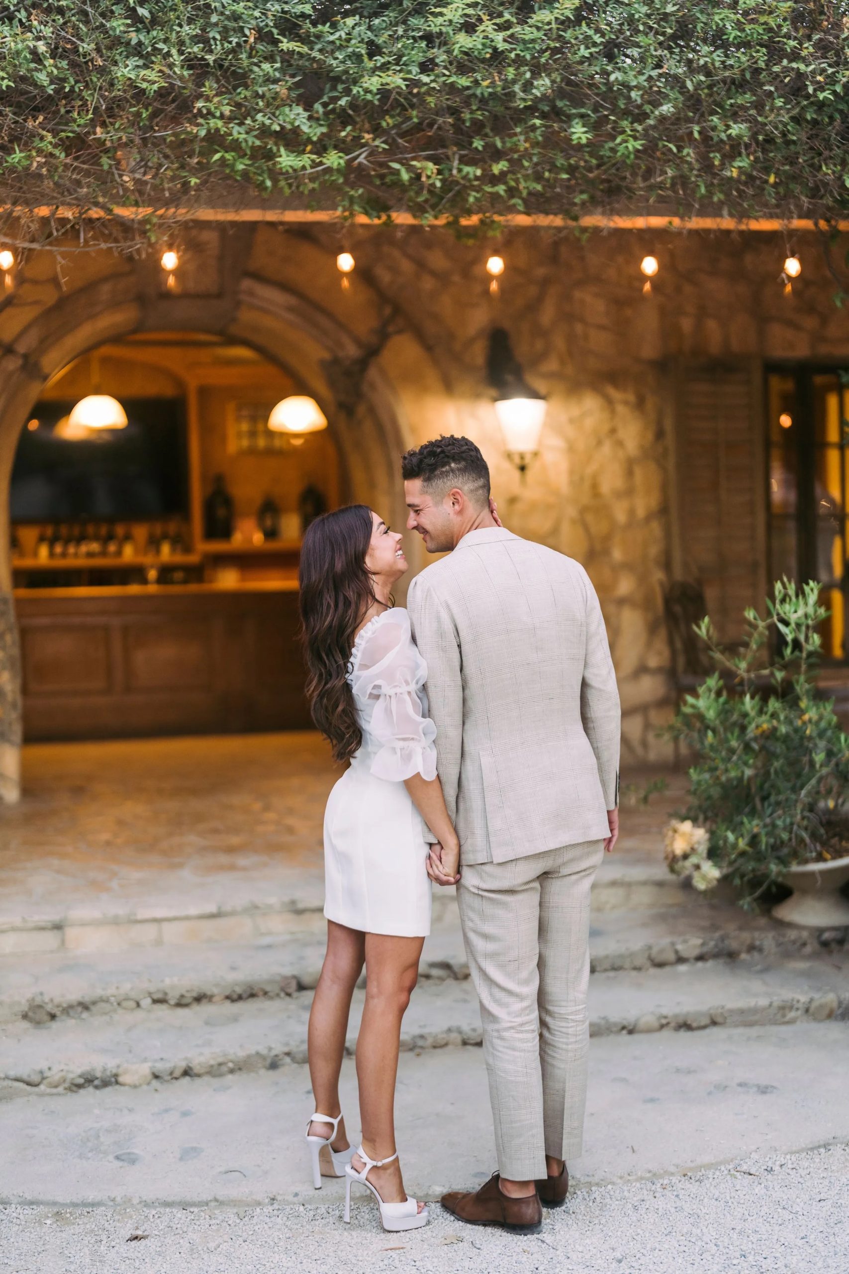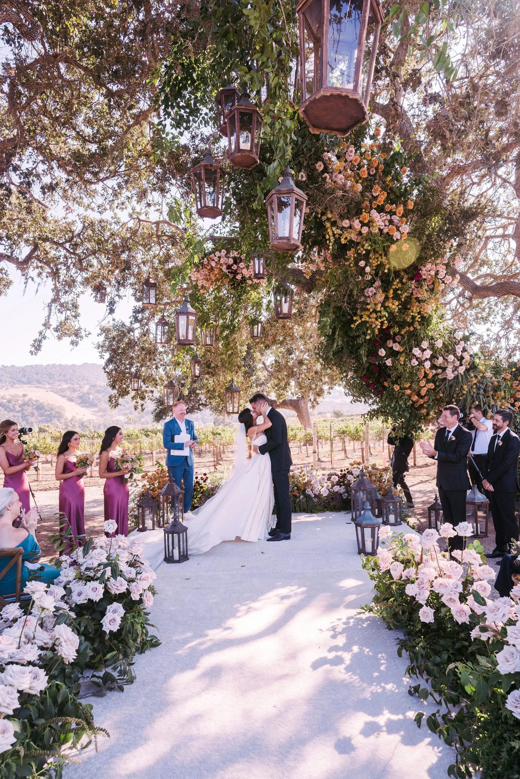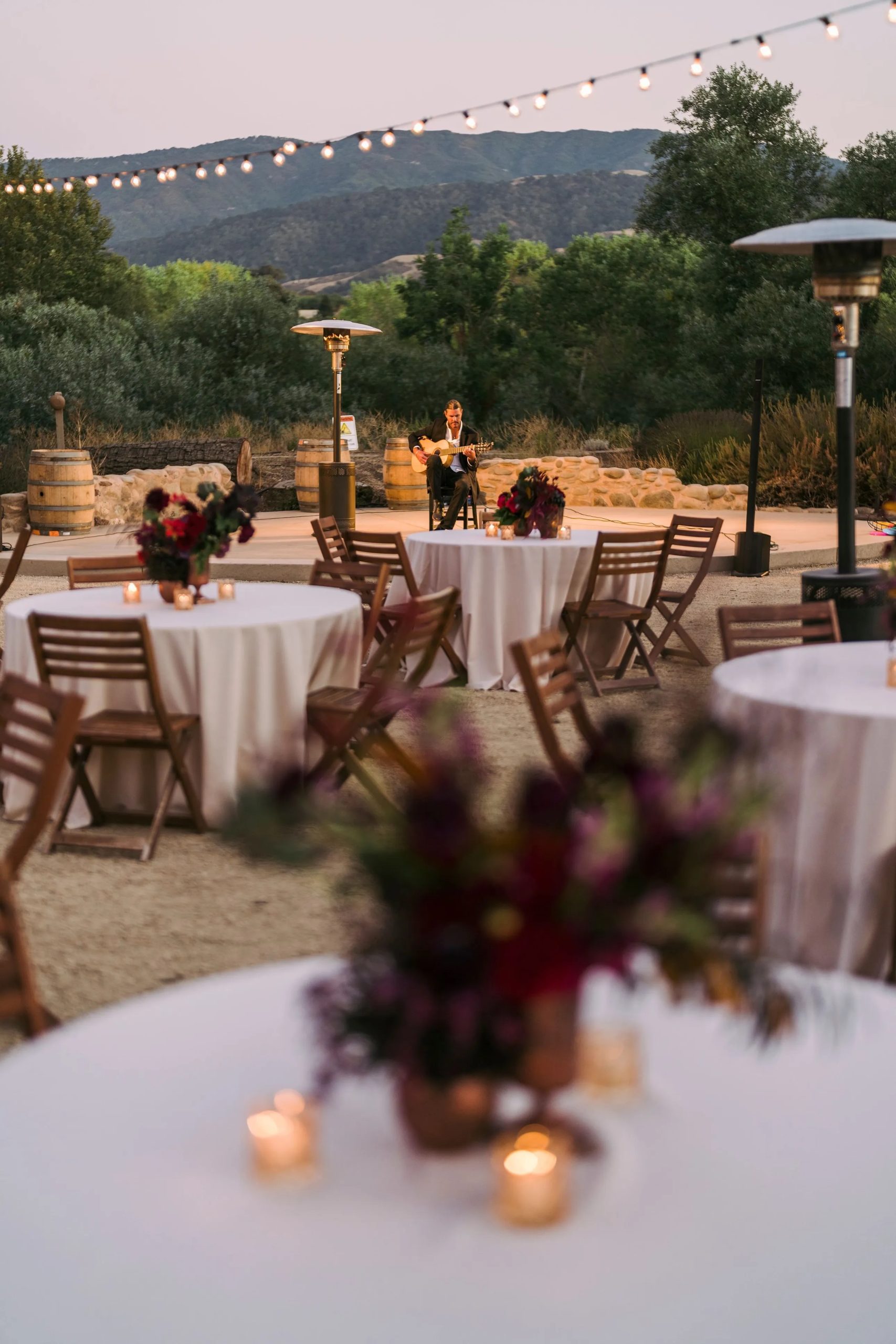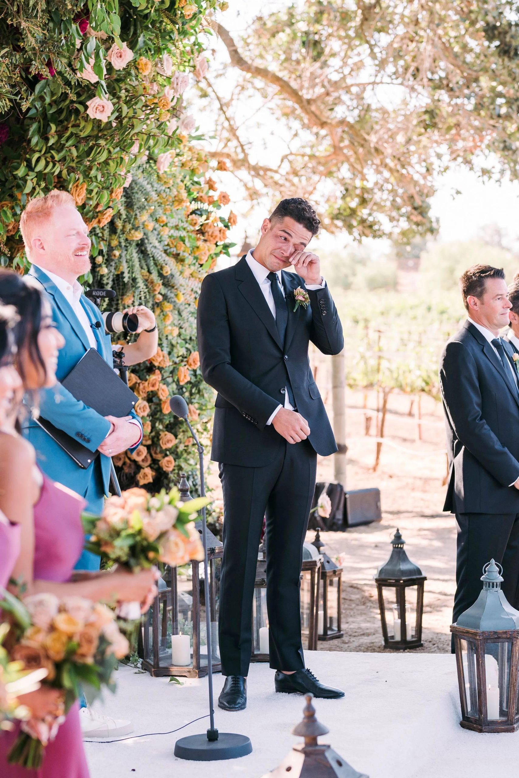 Het weekend begon met een rehearsal dinner in de wijngrotten van Sunstone Vineyards in Santa Ynez, Californië. Het was een intieme groep van alleen de bruid en bruidegom, hun respectievelijke families, hun bridal party en hun trouwambtenaar (en Modern Family-castlid) Jesse Tyler Ferguson en zijn man Justin Mikita. Ze versierden de ruimte met hoge kaarsen, donkere rozen en schalen tot de rand gevuld met pruimen. Een Spaanse gitarist trad op tussen de speeches door. Sarah lijdt aan een nieraandoening waardoor haar jongere broer Ian in september 2017 een nier aan haar doneerde. Zijn toast op zijn zus maakte iedereen aan het huilen. “Er was geen droog oog te bekennen”, zegt Wells. Na het diner liep het stel naar de binnenplaats van Sunstone voor een welkomstfeest met al hun gasten.