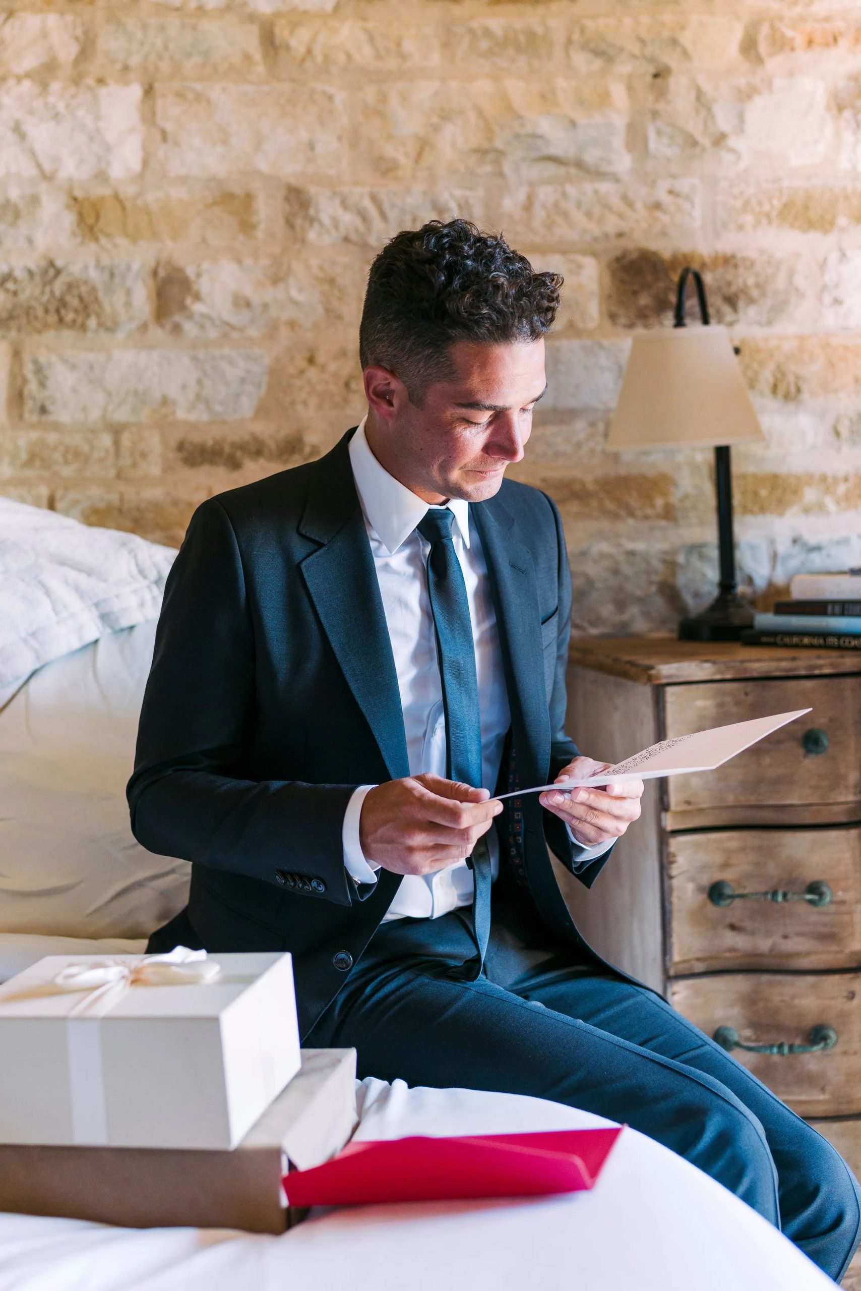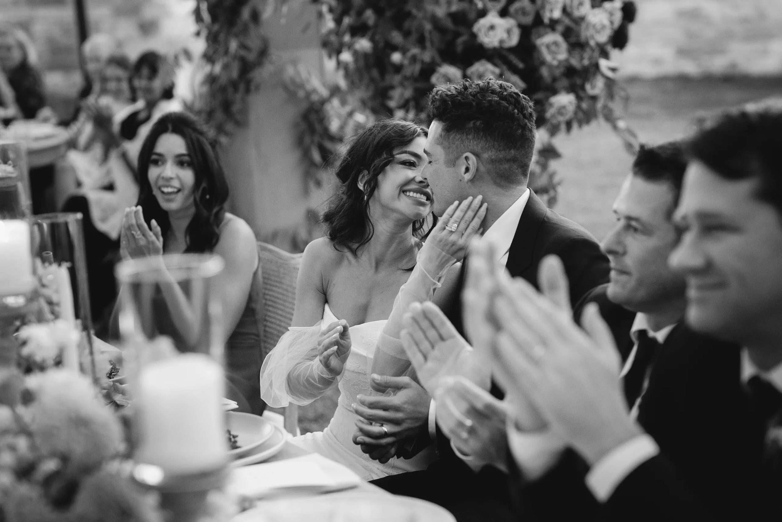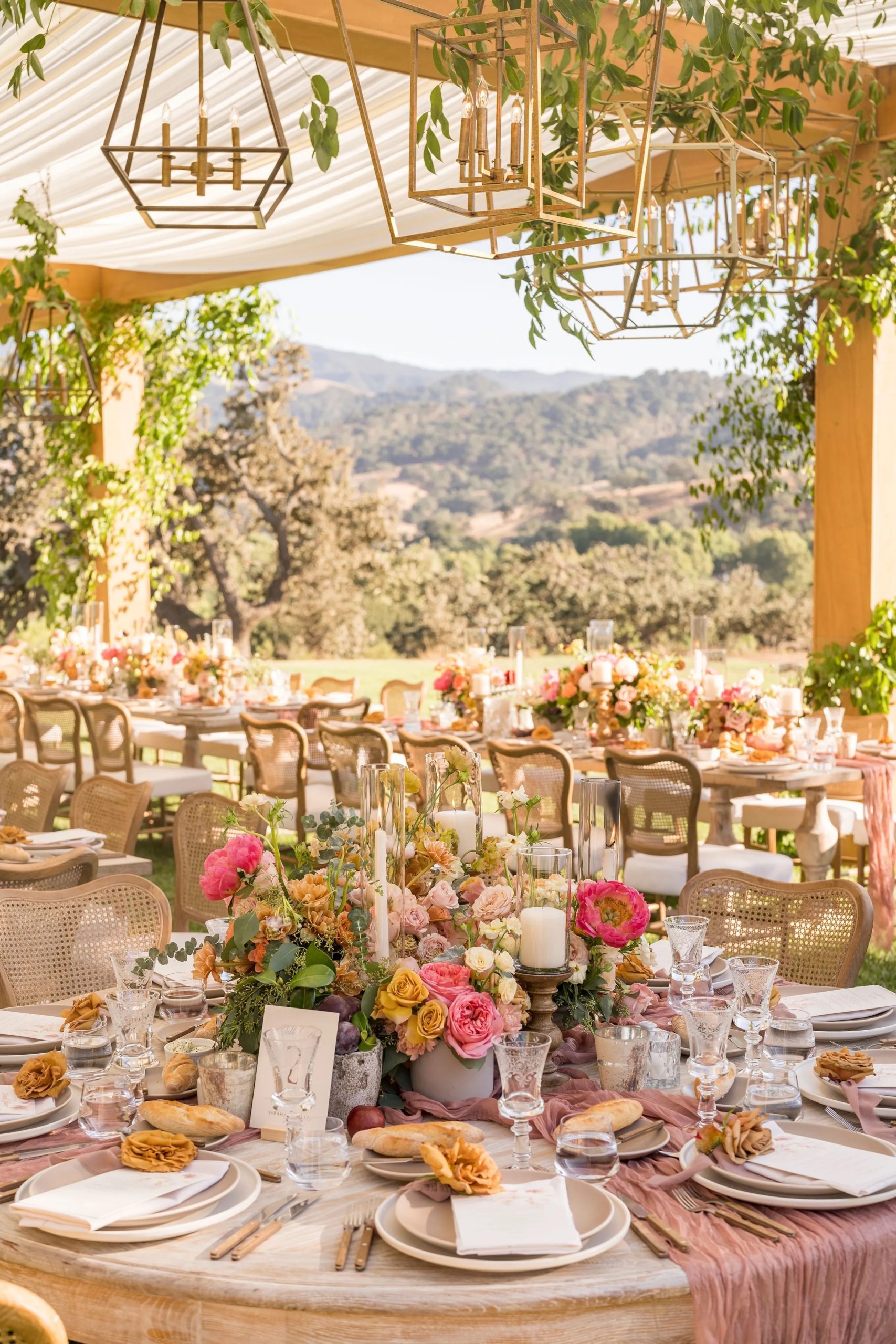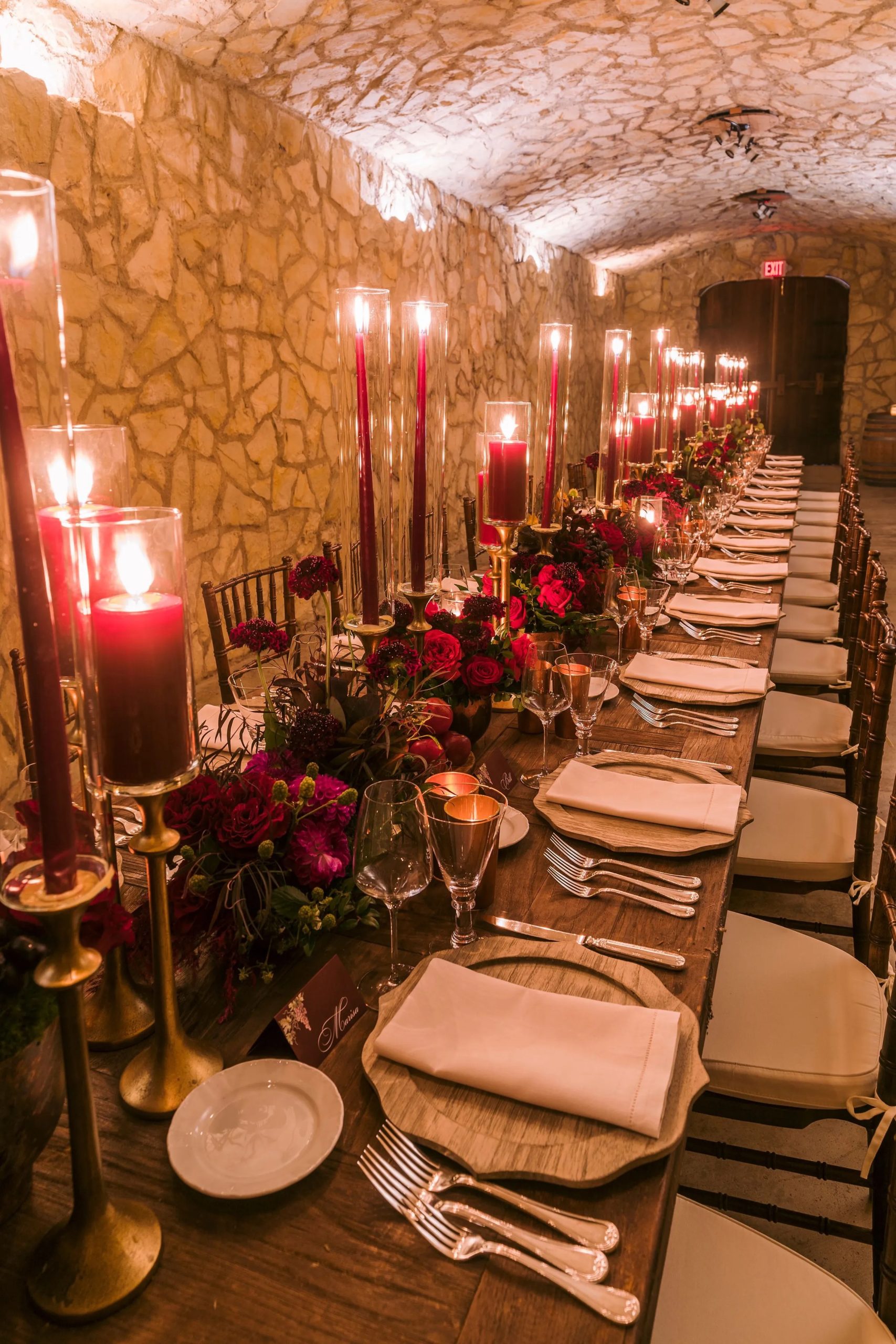 Het weekend begon met een rehearsal dinner in de wijngrotten van Sunstone Vineyards in Santa Ynez, Californië. Het was een intieme groep van alleen de bruid en bruidegom, hun respectievelijke families, hun bridal party en hun trouwambtenaar (en Modern Family-castlid) Jesse Tyler Ferguson en zijn man Justin Mikita. Ze versierden de ruimte met hoge kaarsen, donkere rozen en schalen tot de rand gevuld met pruimen. Een Spaanse gitarist trad op tussen de speeches door. Sarah lijdt aan een nieraandoening waardoor haar jongere broer Ian in september 2017 een nier aan haar doneerde. Zijn toast op zijn zus maakte iedereen aan het huilen. “Er was geen droog oog te bekennen”, zegt Wells. Na het diner liep het stel naar de binnenplaats van Sunstone voor een welkomstfeest met al hun gasten.