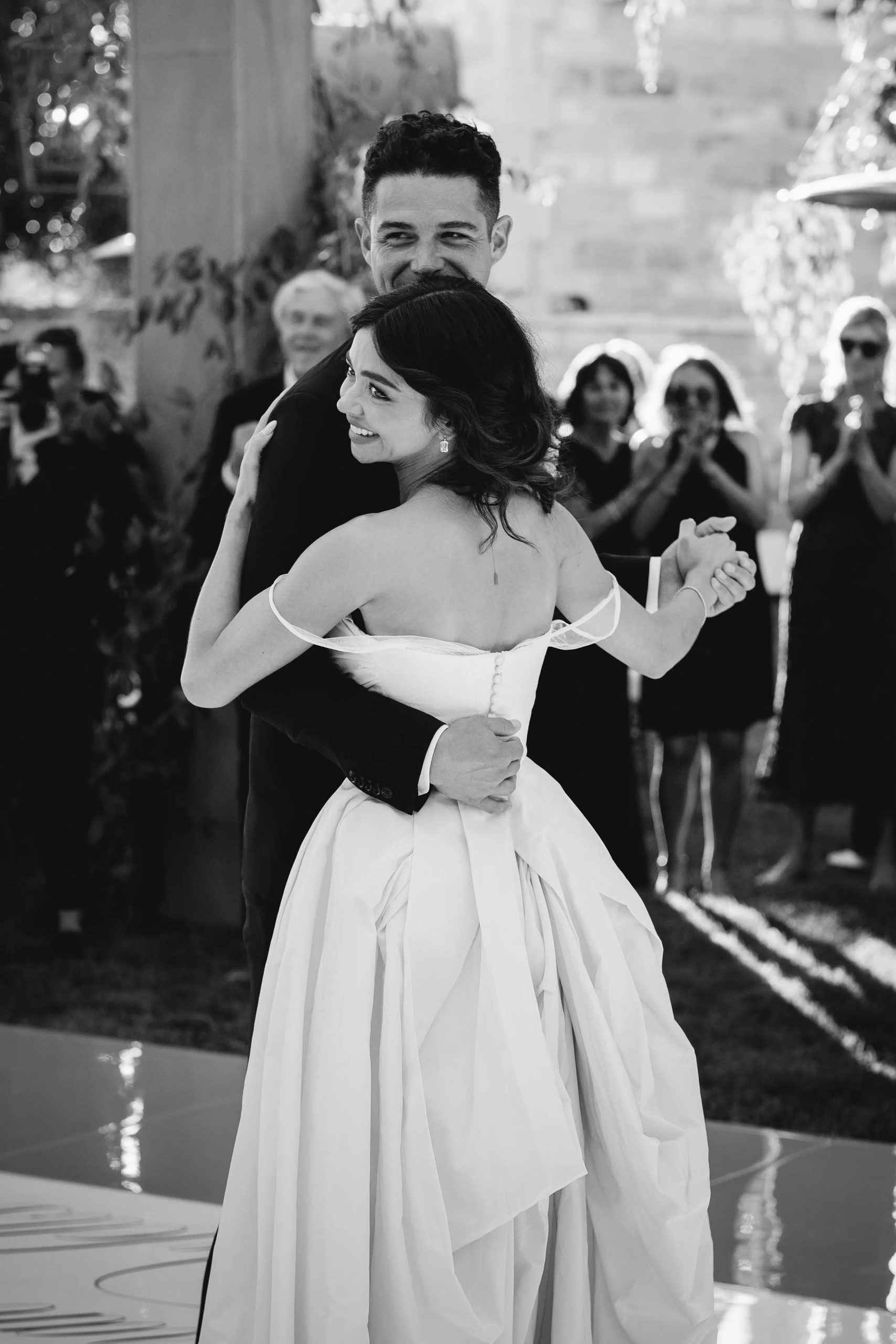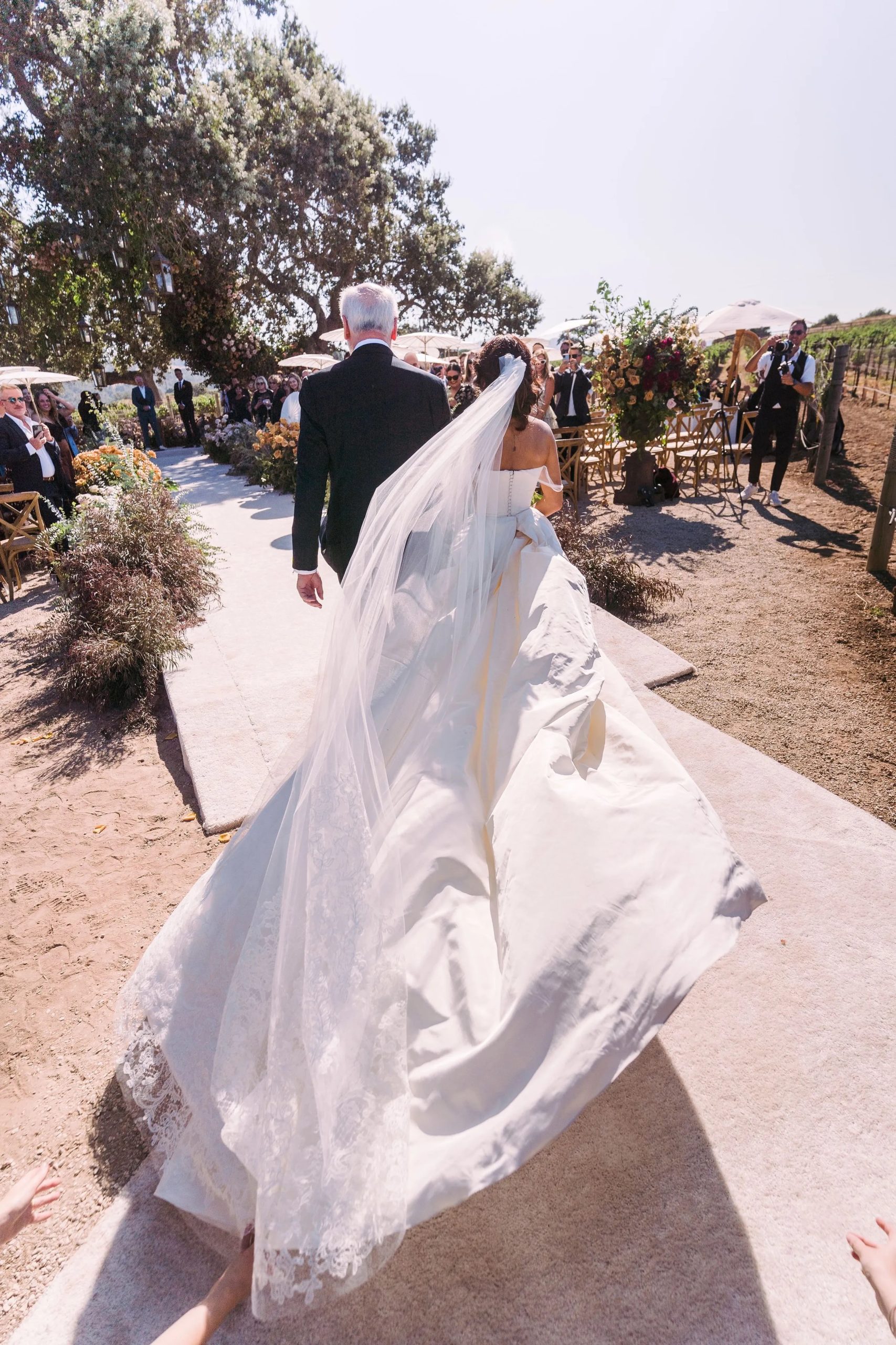 Sarah liep met haar vader door een gangpad dat midden in de wijngaard was gelegd. “Ik bleef mezelf eraan herinneren om naar mensen en Wells te kijken”, zegt ze over haar aanpak om in het moment aanwezig te blijven. “Ondertussen sta ik daar te huilen als een kind”, lacht Wells. “Oncontroleerbaar.”