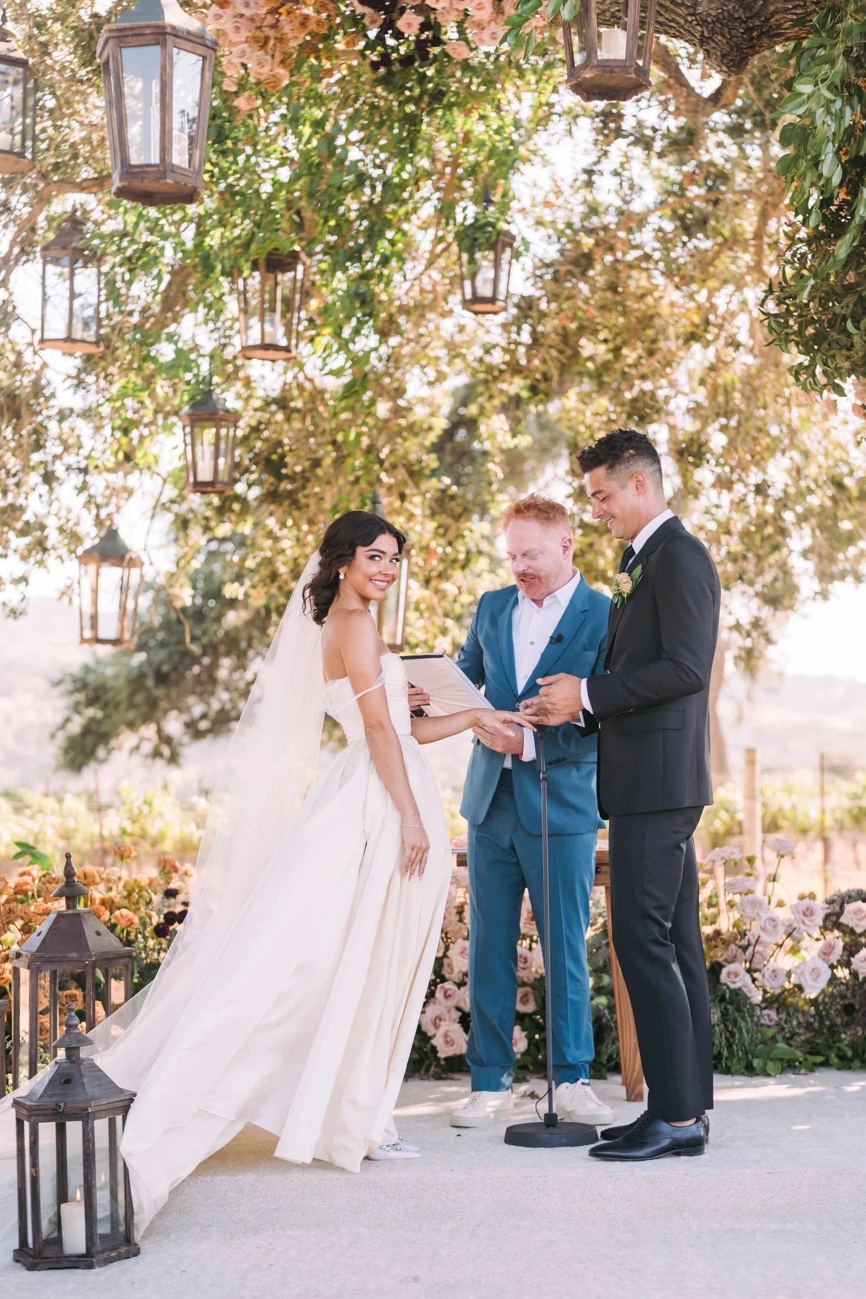 Afgelopen weekend vond de bruiloft van Modern Family-actrice Sarah Hyland en haar verloofde Wells Adams plaats. De twee trouwden tijdens een intieme romantische ceremonie in een Californische wijngaard, omringd door familie, vrienden en Sarahs Modern Family-collega’s. Lees hieronder het verhaal van Hyland en Adams en bekijk de sprookjesachtige beelden van hun grote dag.