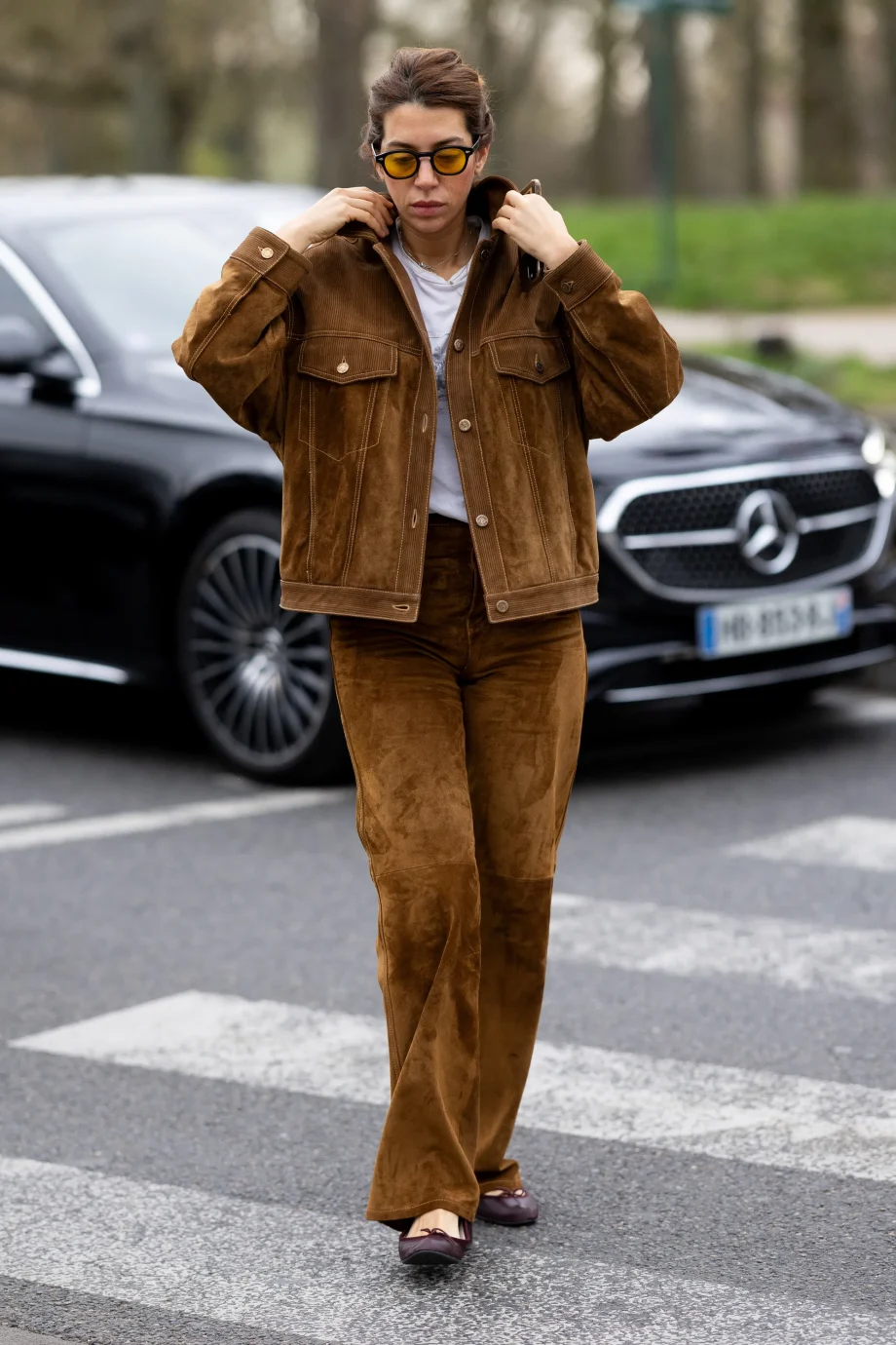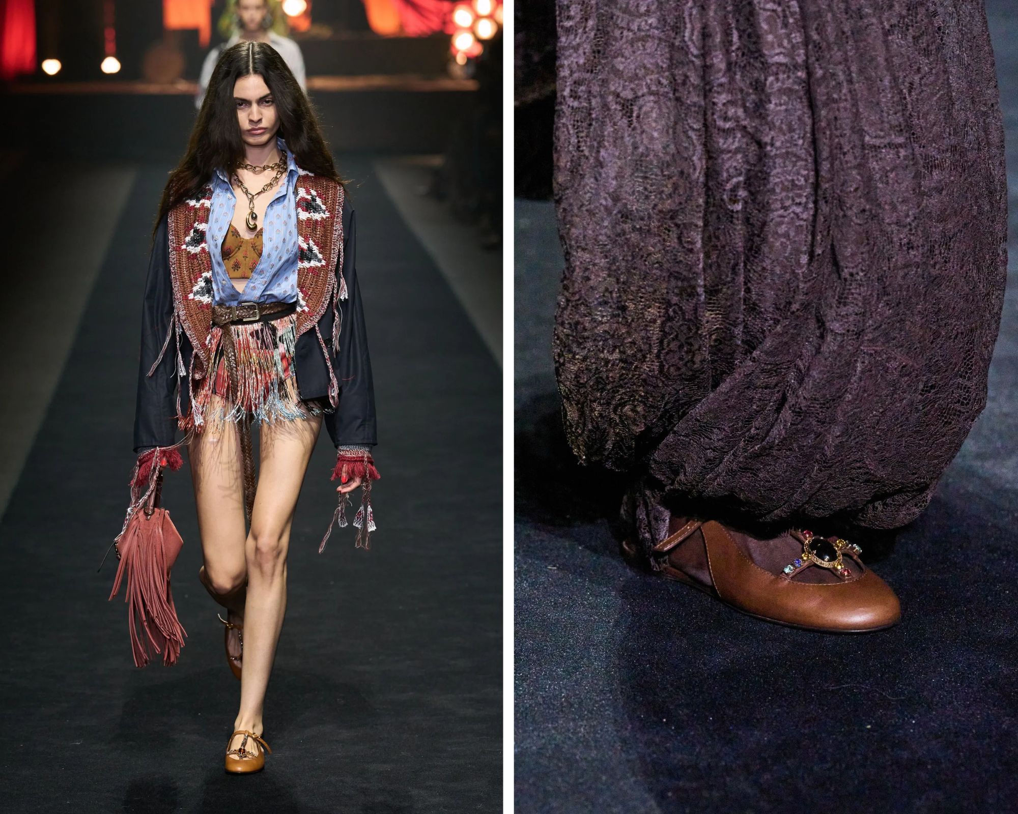 Beperk je niet tot één kleur, maar ga voor een scala aan tinten, van donkere chocoladebruin tot karamel, van beige tot burned omber. Ook het materiaal speelt een belangrijke rol: glad leer oogt minimalistischer, terwijl zacht en fluweelachtig suède een van de meest trendy keuzes van het seizoen blijft. Voor wie een statement wil maken, zijn er zelfs varianten met stenen en kristallen, zoals te zien was tijdens de Etro lente/zomer 2026-show. Gedragen met jeans en T-shirts, maxi-jurken en getailleerde pakken, zijn bruine ballerina’s je geheime wapen voor een naadloze lentelook.