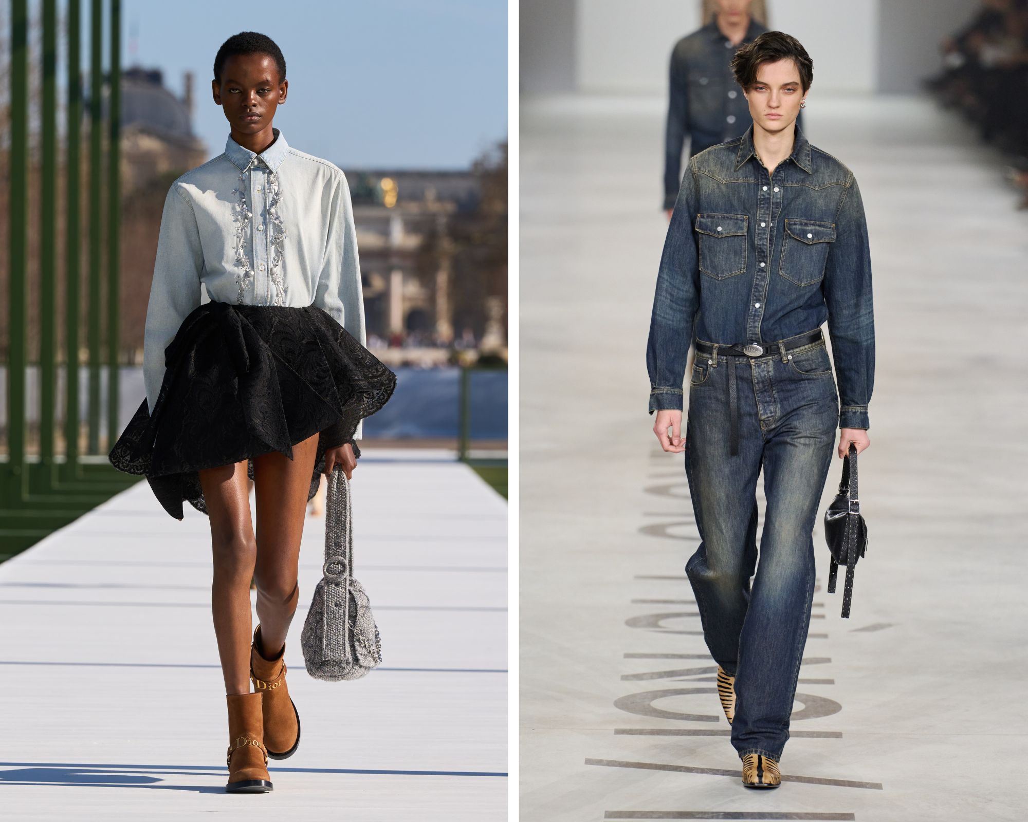 De denim blouse is ook een vaste waarde op de catwalk, waar het item elk seizoen wel te zien is. Bijvoorbeeld tijdens het lente/zomer 2026-seizoen. Een van de opvallendste stijlen verscheen op de runway van Jonathan Andersons lente/zomer 2026-show voor Dior: een hooggesloten variant met een brede strikkraag in het klassiek blauw en legergroen. Ook in zijn recente herfst/winter 2026-collectie kwam de denim blouse terug – dit keer een exemplaar in lichte wassing met ruches en geborduurde kralen, gecombineerd met een volumineuze, zwarte, kanten minirok.