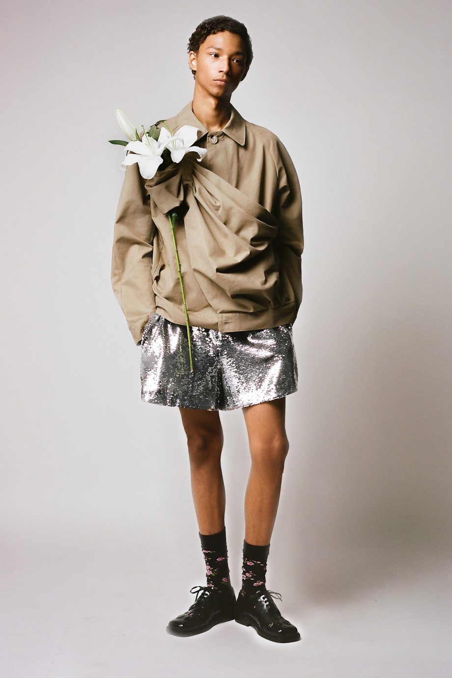 Pailletten voor mannen zagen we onder meer in de lente/zomer 2026-collectie van de Ierse modeontwerper Simone Rocha, die zilveren paillettenshorts combineerde met metallic schoenen, sokken met bloemen en een zandkleurige polo met ruches. Een look die we eerder ook al in haar vrouwencollecties zagen. Of neem Alessandro Michele bij Valentino, die pailletten verwerkte op een beige jasje en daarmee de hele outfit naar een feestelijk niveau tilde. Ook in de herfst/winter 2025-collecties waren pailletten prominent aanwezig, bijvoorbeeld bij Bally, waar ze opdoken op zowel tanktops als mutsen.