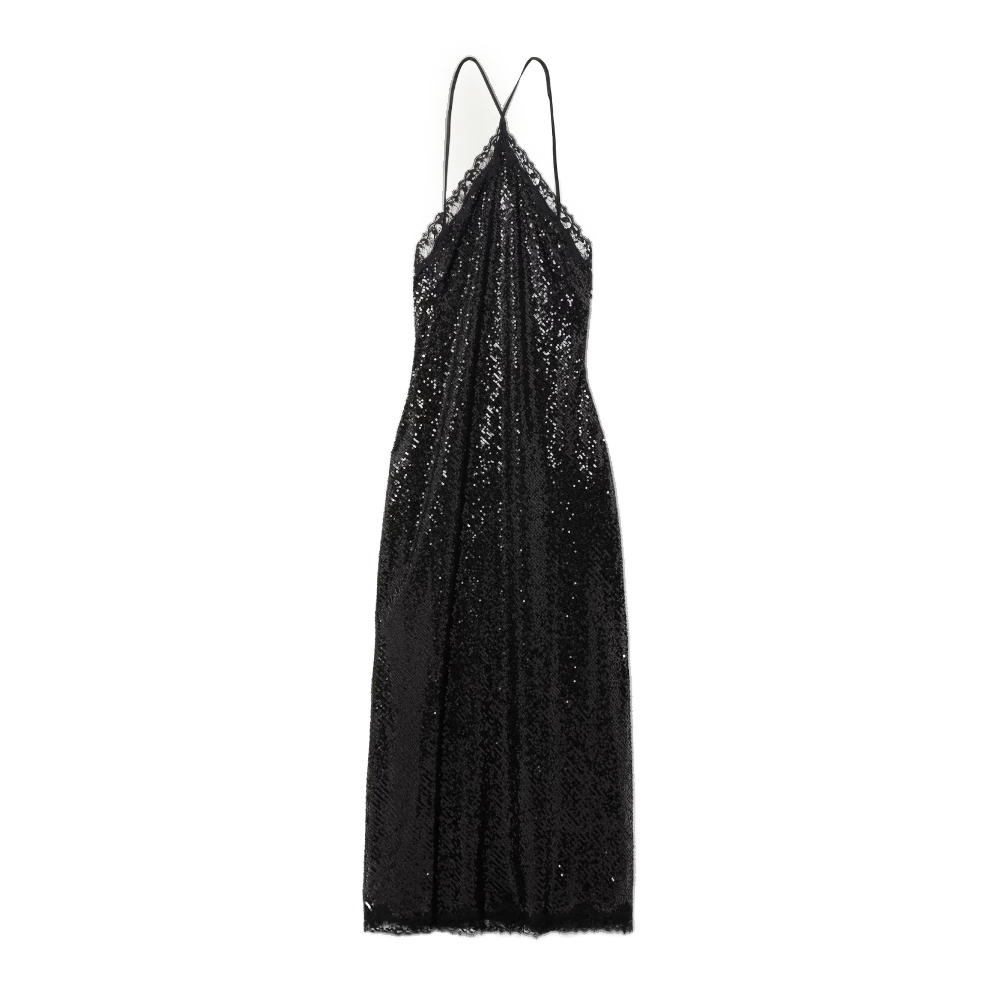 Midi-jurk met halternek, kantrand en pailletten, € 495