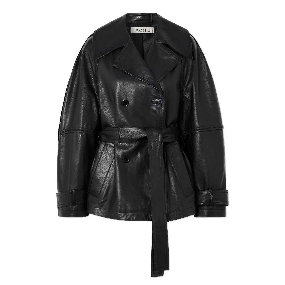 Leren jas met dubbele knoopsluiting en ceintuur, € 950